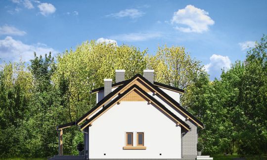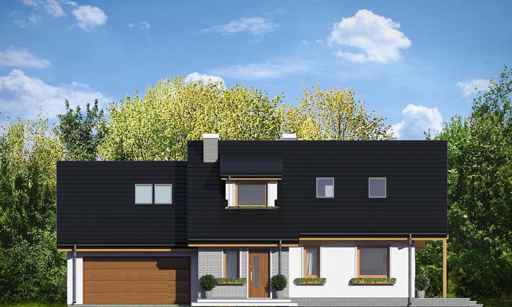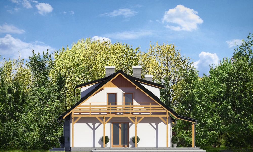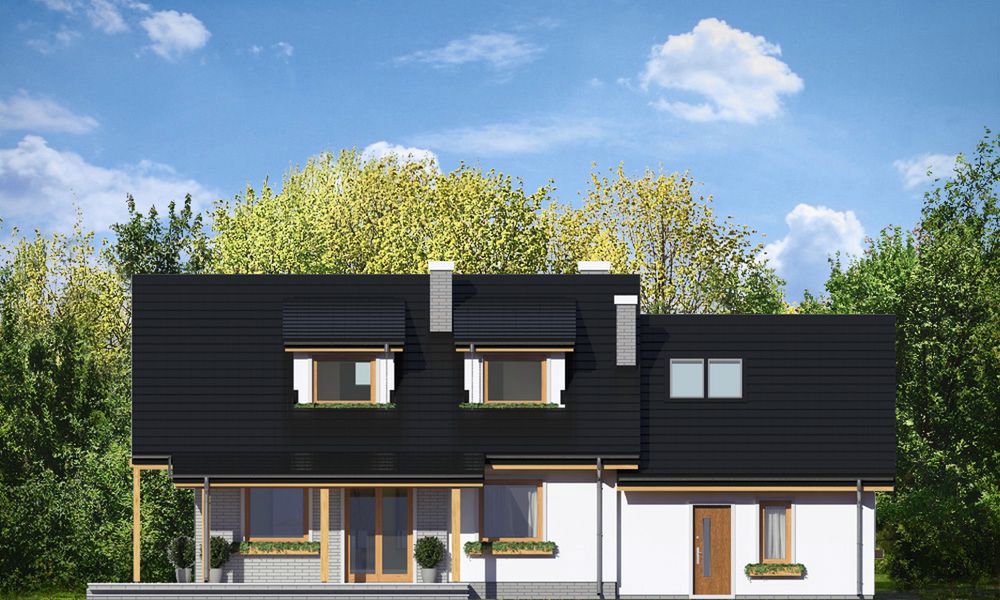 Graficzne opracowanie rzutów poglądowych widocznych na karcie projektu zostało wykonane przez Extradom.pl. Prezentowane przez Extradom.pl wizualizacje wykonane zostały przez autora projektu i należy poczytywać je jedynie za przykład i propozycję wykończenia, wizję architektoniczną autora projektu. Ostateczne wykończenie budynku może nastąpić na wiele sposobów. Szczegółowe rozwiązania zastosowane w oferowanej dokumentacji - w tym również ilość, lokalizacje i wygląd okien, drzwi, kominów - mogą w niewielkim stopniu różnić się od prezentowanej wizualizacji budynku.