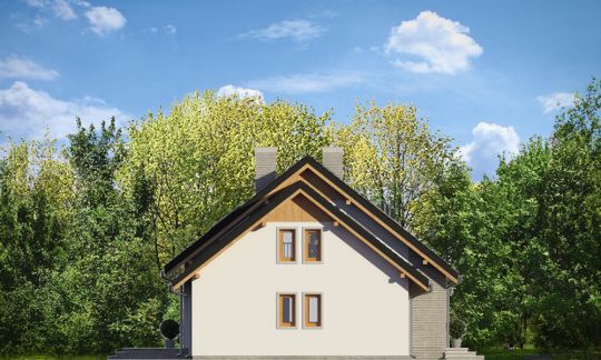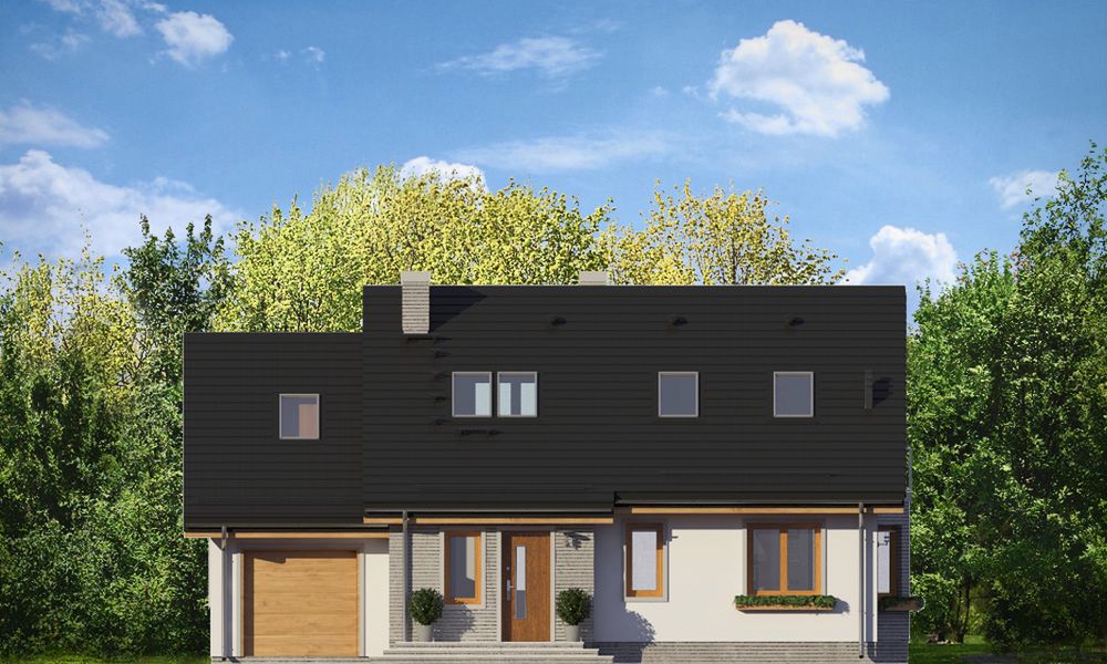 Graficzne opracowanie rzutów poglądowych widocznych na karcie projektu zostało wykonane przez Extradom.pl. Prezentowane przez Extradom.pl wizualizacje wykonane zostały przez autora projektu i należy poczytywać je jedynie za przykład i propozycję wykończenia, wizję architektoniczną autora projektu. Ostateczne wykończenie budynku może nastąpić na wiele sposobów. Szczegółowe rozwiązania zastosowane w oferowanej dokumentacji - w tym również ilość, lokalizacje i wygląd okien, drzwi, kominów - mogą w niewielkim stopniu różnić się od prezentowanej wizualizacji budynku.