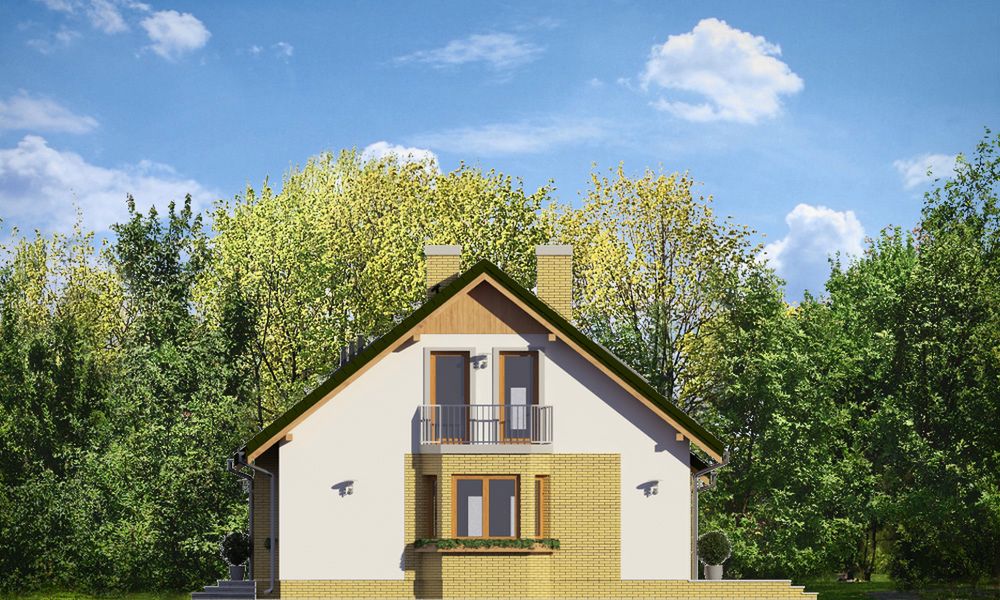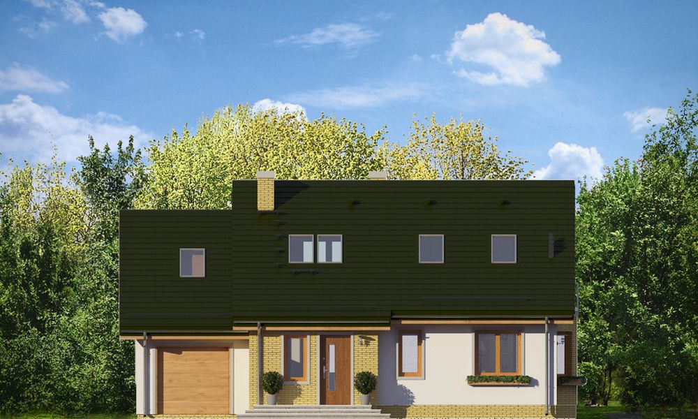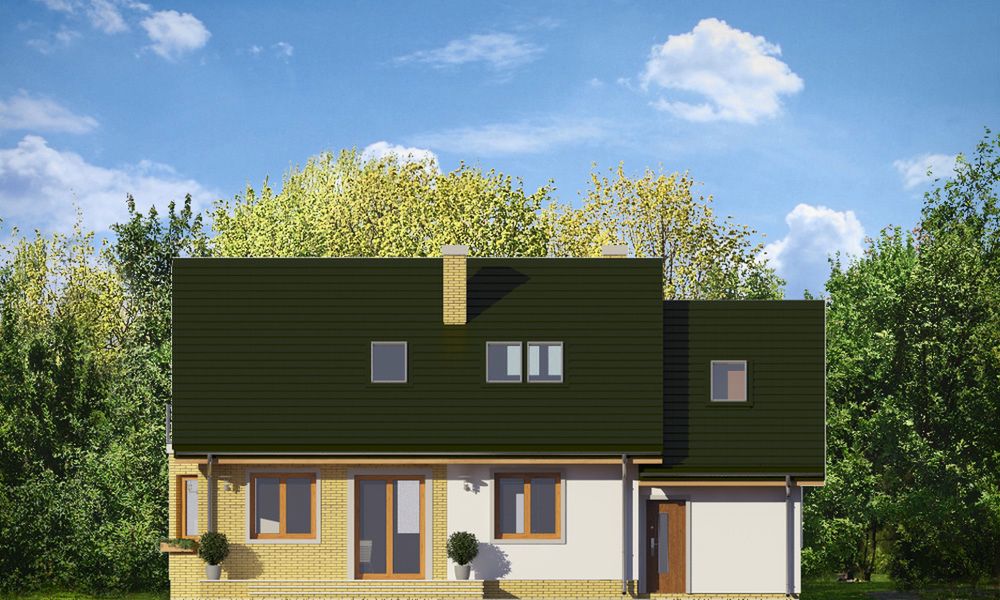 Graficzne opracowanie rzutów poglądowych widocznych na karcie projektu zostało wykonane przez Extradom.pl. Prezentowane przez Extradom.pl wizualizacje wykonane zostały przez autora projektu i należy poczytywać je jedynie za przykład i propozycję wykończenia, wizję architektoniczną autora projektu. Ostateczne wykończenie budynku może nastąpić na wiele sposobów. Szczegółowe rozwiązania zastosowane w oferowanej dokumentacji - w tym również ilość, lokalizacje i wygląd okien, drzwi, kominów - mogą w niewielkim stopniu różnić się od prezentowanej wizualizacji budynku.