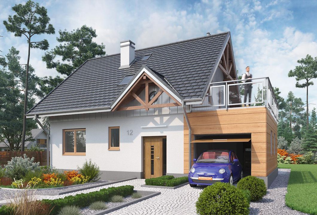 Graficzne opracowanie rzutów poglądowych widocznych na karcie projektu zostało wykonane przez Extradom.pl. Prezentowane przez Extradom.pl wizualizacje wykonane zostały przez autora projektu i należy poczytywać je jedynie za przykład i propozycję wykończenia, wizję architektoniczną autora projektu. Ostateczne wykończenie budynku może nastąpić na wiele sposobów. Szczegółowe rozwiązania zastosowane w oferowanej dokumentacji - w tym również ilość, lokalizacje i wygląd okien, drzwi, kominów - mogą w niewielkim stopniu różnić się od prezentowanej wizualizacji budynku.