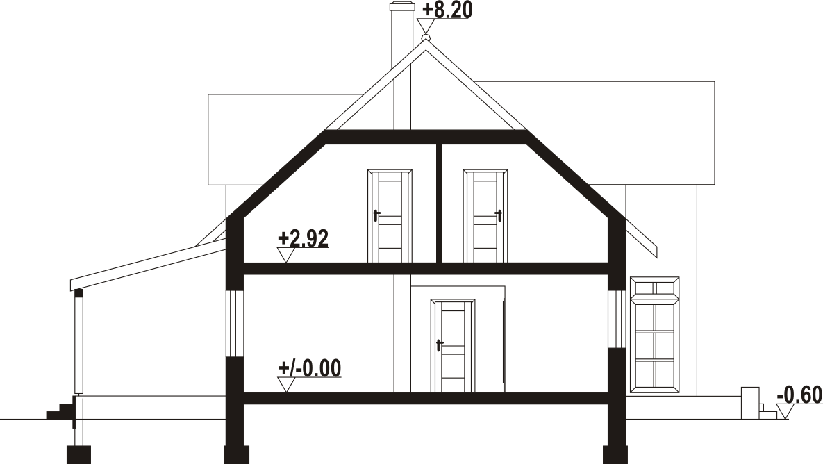 Wysokość ścianki kolankowej: 0.95 m. Strop: płyta żelbetowa. Pokrycie dachu: dachówka ceramiczna. Ściany zewnętrzne: pustaki ceramiczne + styropian. Ściany wewnętrzne: pustaki ceramiczne. Typ ogrzewania: kocioł gazowy. Instalacje dodatkowe: instalacja solarna.