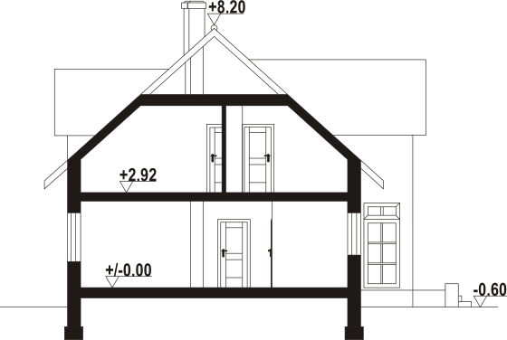 Wysokość ścianki kolankowej: 0.95 m. Strop: płyta żelbetowa. Pokrycie dachu: dachówka ceramiczna. Ściany zewnętrzne: pustaki ceramiczne + styropian. Ściany wewnętrzne: pustaki ceramiczne. Typ ogrzewania: kocioł gazowy. Inne: okna połaciowe Fakro.