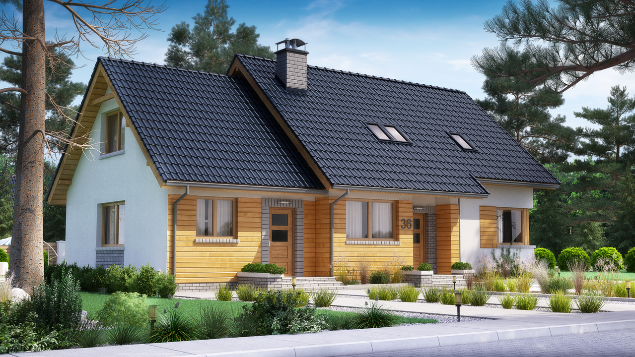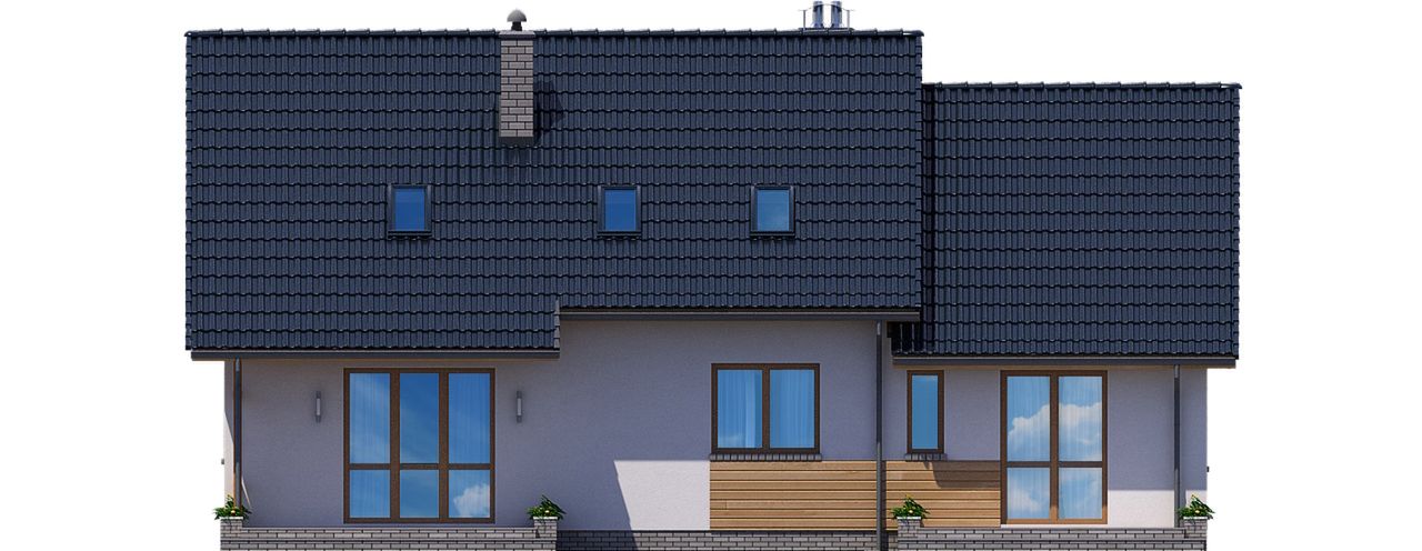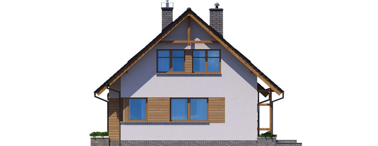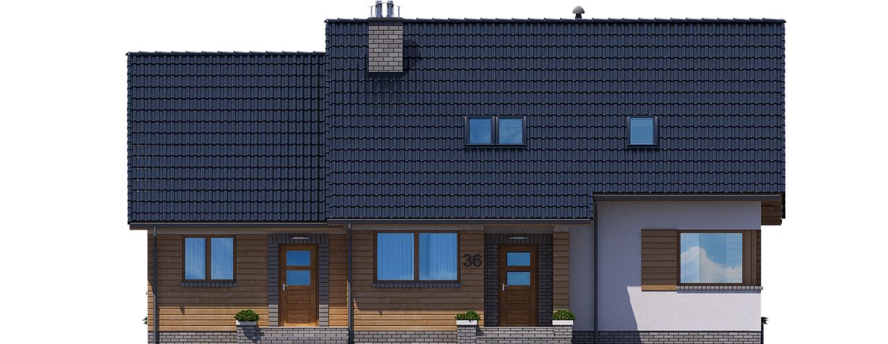 Graficzne opracowanie rzutów poglądowych widocznych na karcie projektu zostało wykonane przez Extradom.pl. Prezentowane przez Extradom.pl wizualizacje wykonane zostały przez autora projektu i należy poczytywać je jedynie za przykład i propozycję wykończenia, wizję architektoniczną autora projektu. Ostateczne wykończenie budynku może nastąpić na wiele sposobów. Szczegółowe rozwiązania zastosowane w oferowanej dokumentacji - w tym również ilość, lokalizacje i wygląd okien, drzwi, kominów - mogą w niewielkim stopniu różnić się od prezentowanej wizualizacji budynku.