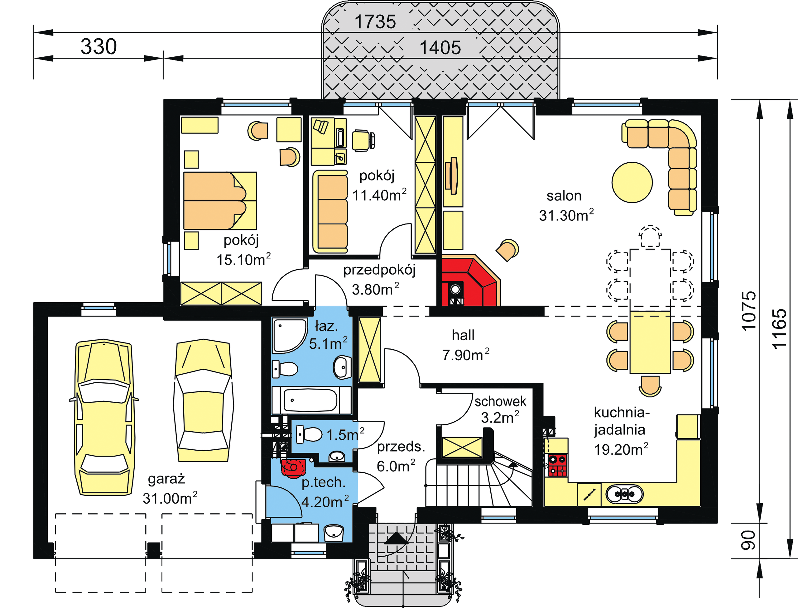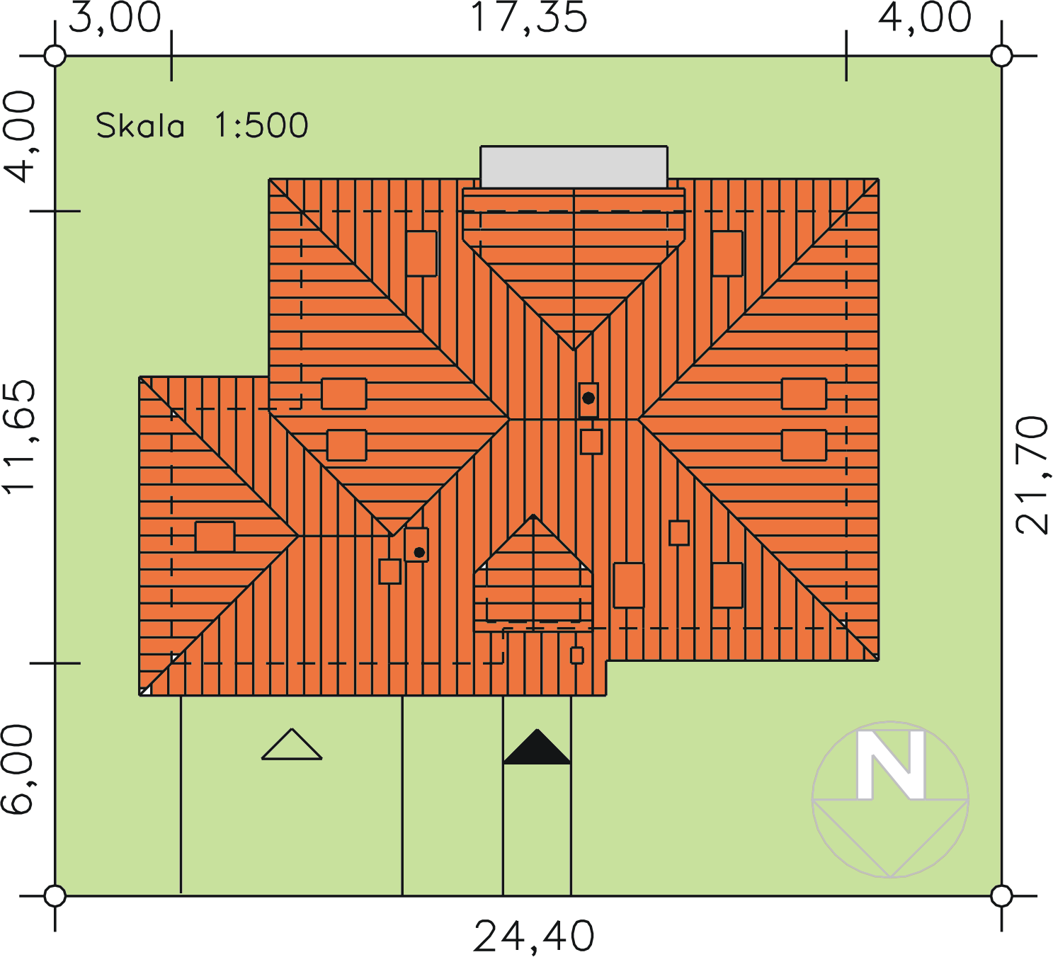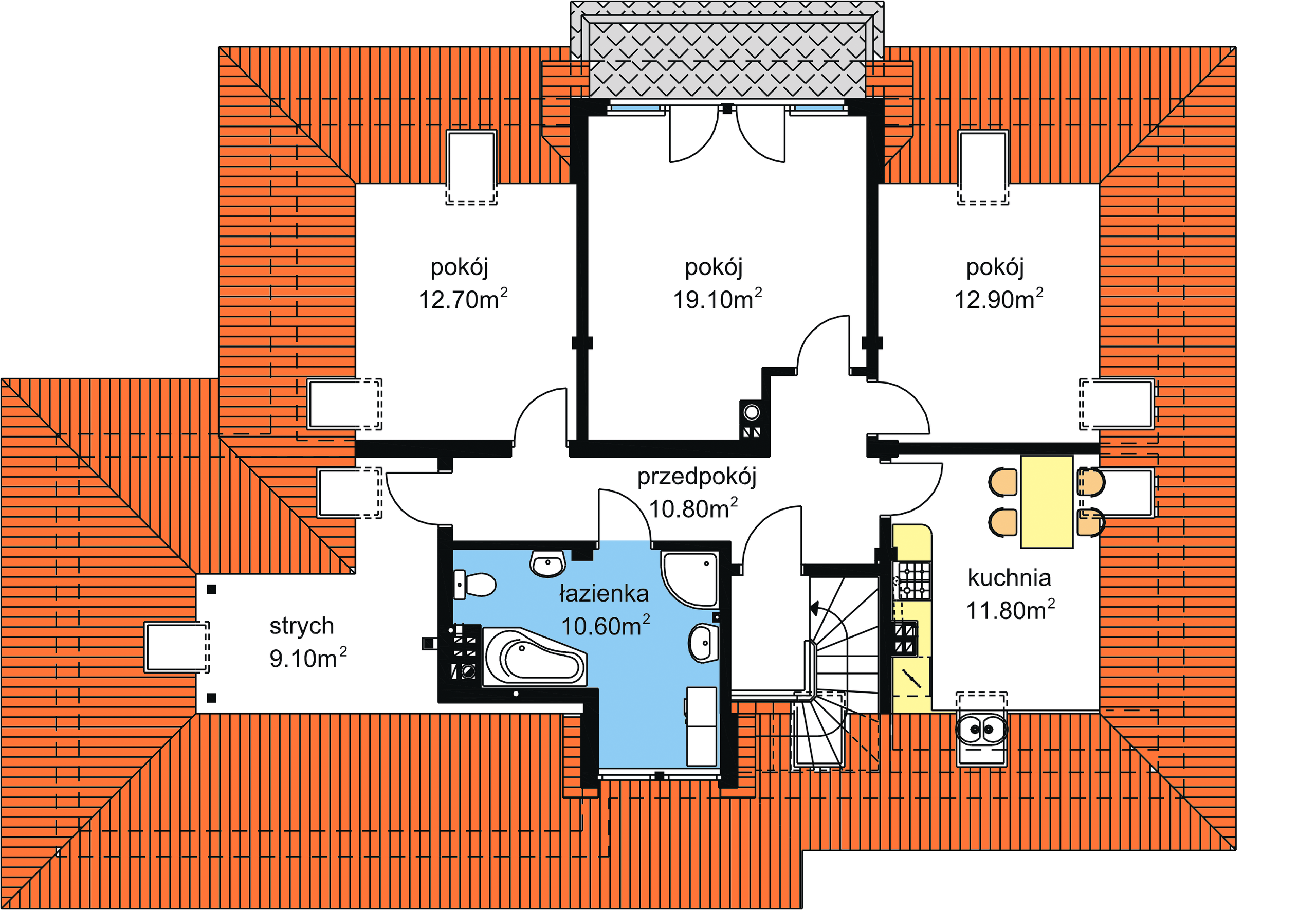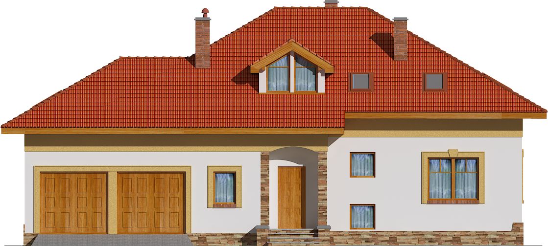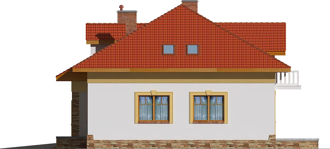 Graficzne opracowanie rzutów poglądowych widocznych na karcie projektu zostało wykonane przez Extradom.pl. Prezentowane przez Extradom.pl wizualizacje wykonane zostały przez autora projektu i należy poczytywać je jedynie za przykład i propozycję wykończenia, wizję architektoniczną autora projektu. Ostateczne wykończenie budynku może nastąpić na wiele sposobów. Szczegółowe rozwiązania zastosowane w oferowanej dokumentacji - w tym również ilość, lokalizacje i wygląd okien, drzwi, kominów - mogą w niewielkim stopniu różnić się od prezentowanej wizualizacji budynku.