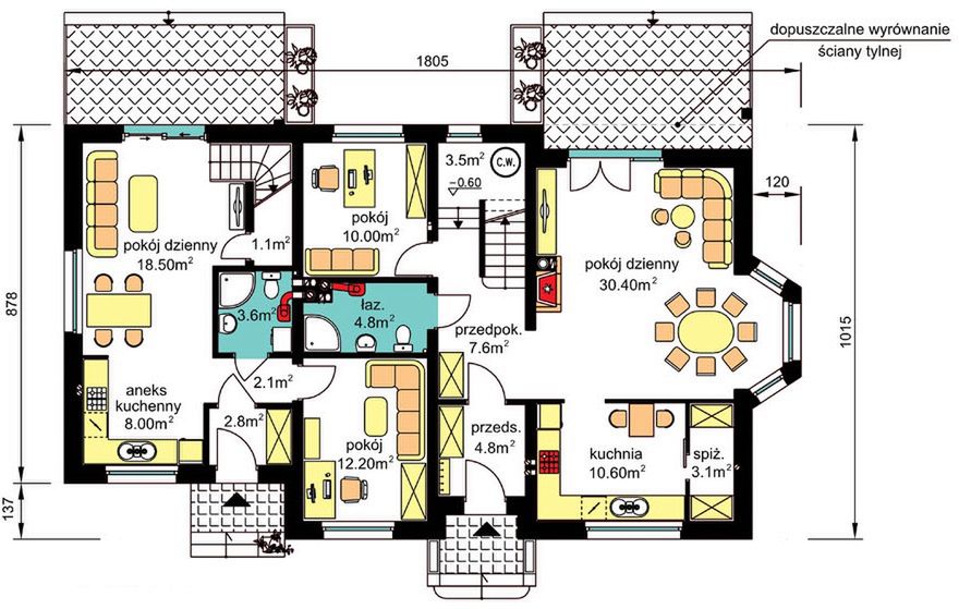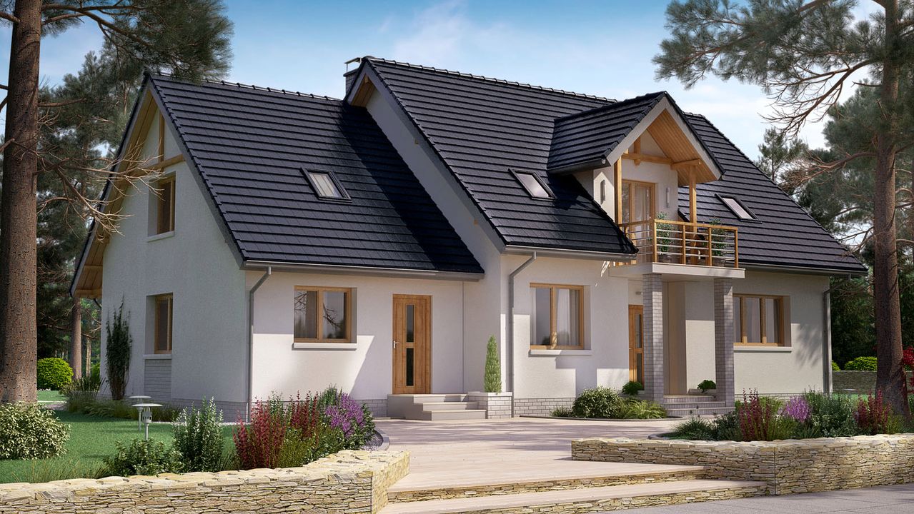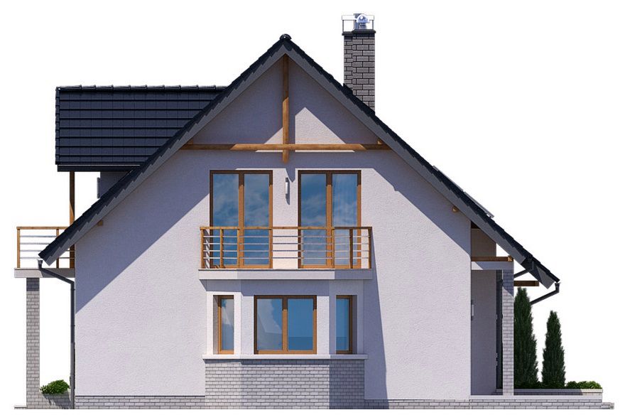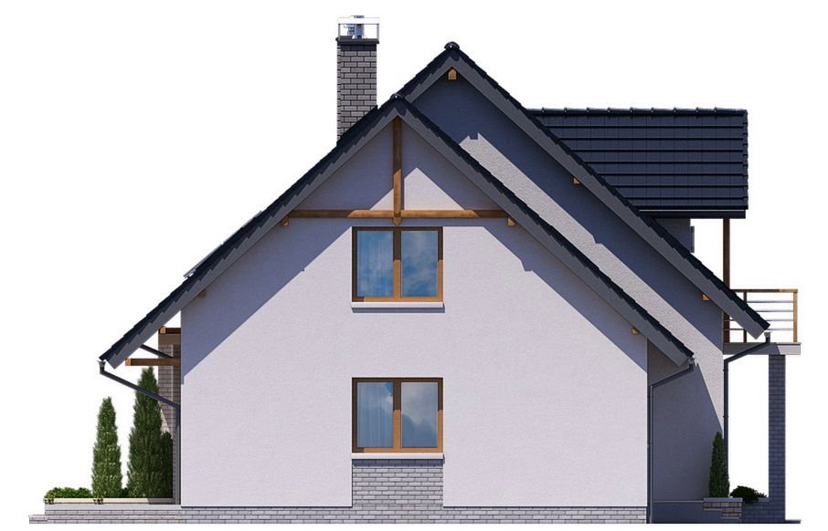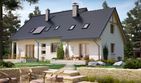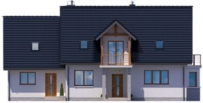 Graficzne opracowanie rzutów poglądowych widocznych na karcie projektu zostało wykonane przez Extradom.pl. Prezentowane przez Extradom.pl wizualizacje wykonane zostały przez autora projektu i należy poczytywać je jedynie za przykład i propozycję wykończenia, wizję architektoniczną autora projektu. Ostateczne wykończenie budynku może nastąpić na wiele sposobów. Szczegółowe rozwiązania zastosowane w oferowanej dokumentacji - w tym również ilość, lokalizacje i wygląd okien, drzwi, kominów - mogą w niewielkim stopniu różnić się od prezentowanej wizualizacji budynku.
