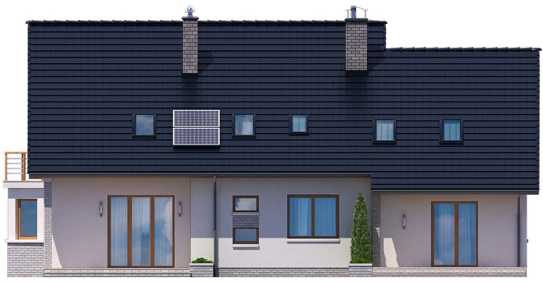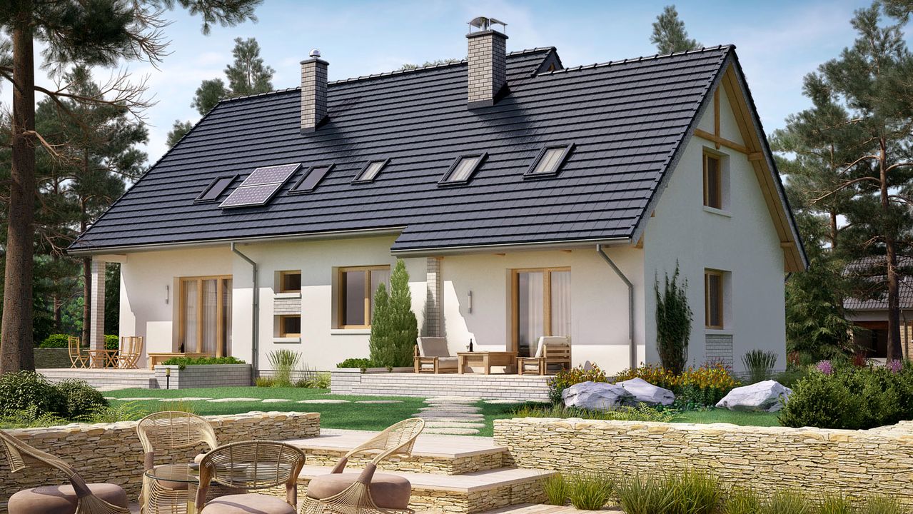 To projekt domu dwulokalowego w tradycyjnym stylu, stworzony z myślą o komforcie dwóch rodzin. Prosta bryła z dwuspadowym dachem gwarantuje optymalizację kosztów budowy, a przemyślany układ z 6 pokojami sprawia, że jest to idealne rozwiązanie dla rodziny wielopokoleniowej lub jako inwestycja na wynajem, zapewniając każdemu z mieszkańców niezależność i prywatność.