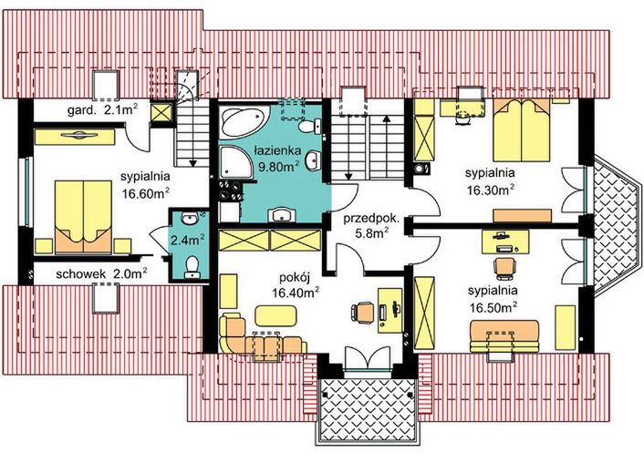Poddasze to prywatna przestrzeń domowników, zaprojektowana z myślą o odpoczynku i wyciszeniu. Znajduje się tu przestronny pokój, który z łatwością pomieści dużą sypialnię, a także komfortowa łazienka i osobne WC. Funkcjonalność tej strefy podnosi dedykowana garderoba, ułatwiająca przechowywanie ubrań, oraz dodatkowe pomieszczenie gospodarcze. Z korytarza dostępny jest balkon, stanowiący idealne miejsce na poranną kawę.