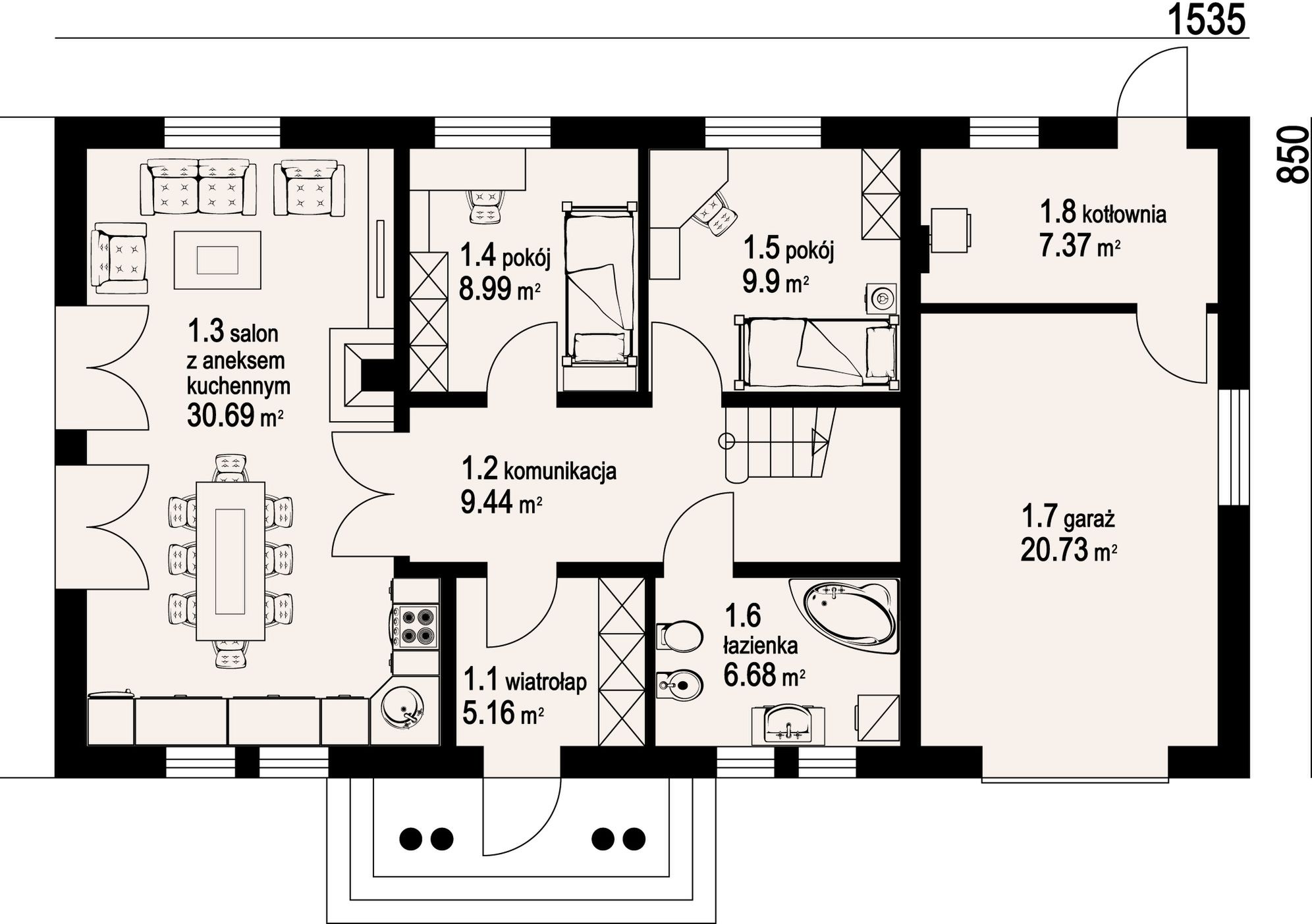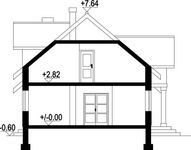 Wys. ścianki kolankowej 0.49 m Ilość drewna na więźbę 11.5 m³. Strop: płyta żelbetowa. Pokrycie dachu: dachówka ceramiczna. Ściany wewnętrzne: pustaki ceramiczne. Ściany zewnętrzne: pustaki ceramiczne + styropian. Typ ogrzewania: kocioł gazowy lub kocioł na paliwo stałe.