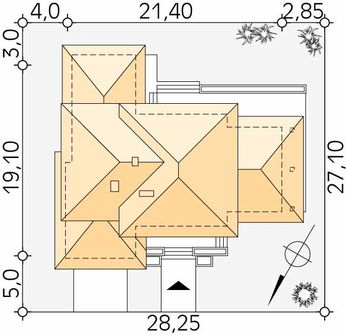 Ściany: 2-warstwowe - POROTHERM 25 PROFI + styropian. Stropy: żelbetowe, wylewane. Dach: dachówka ceramiczna, kąt nachylenia 30° i 25°. Ogrzewanie: gazowe.