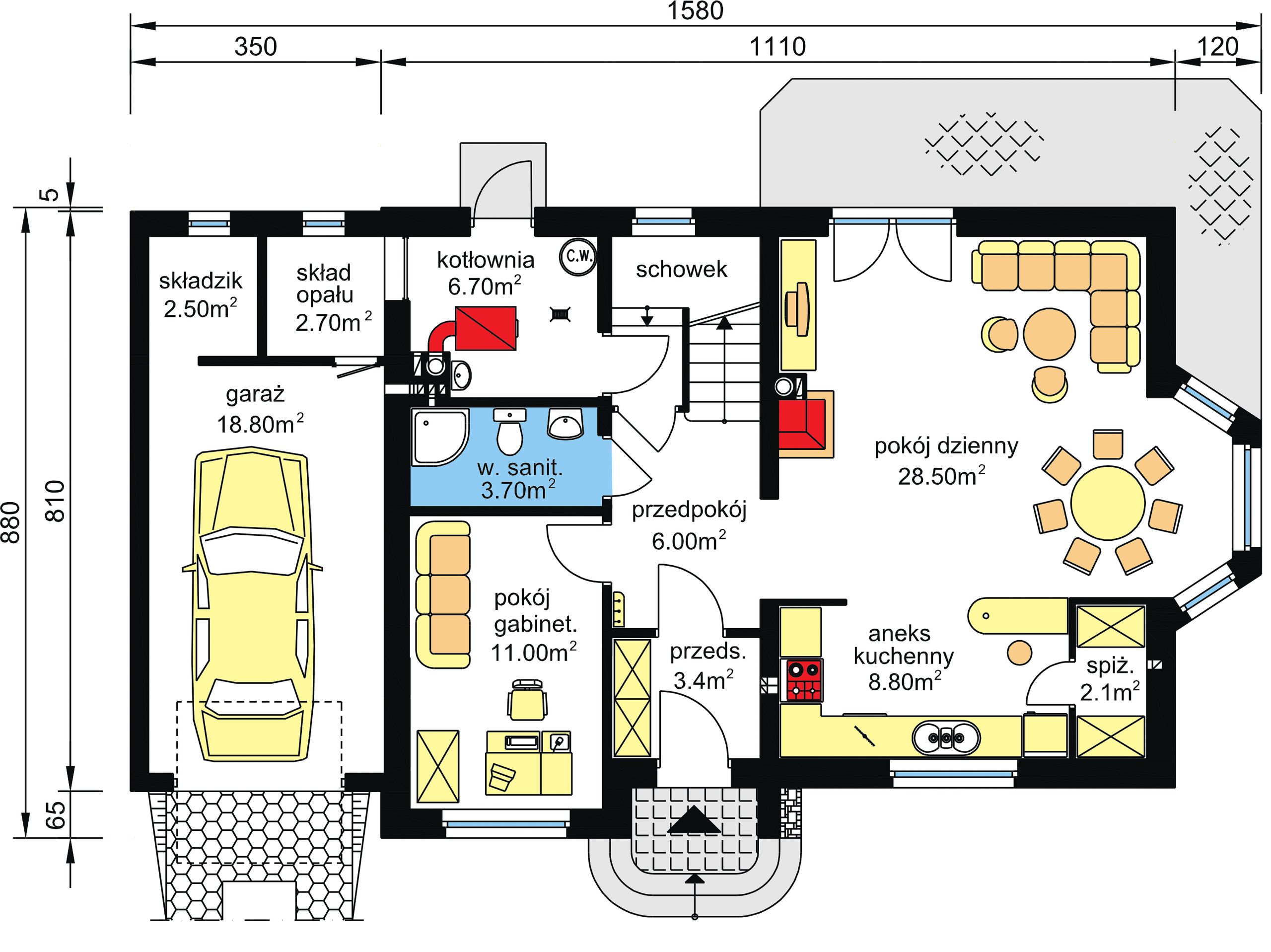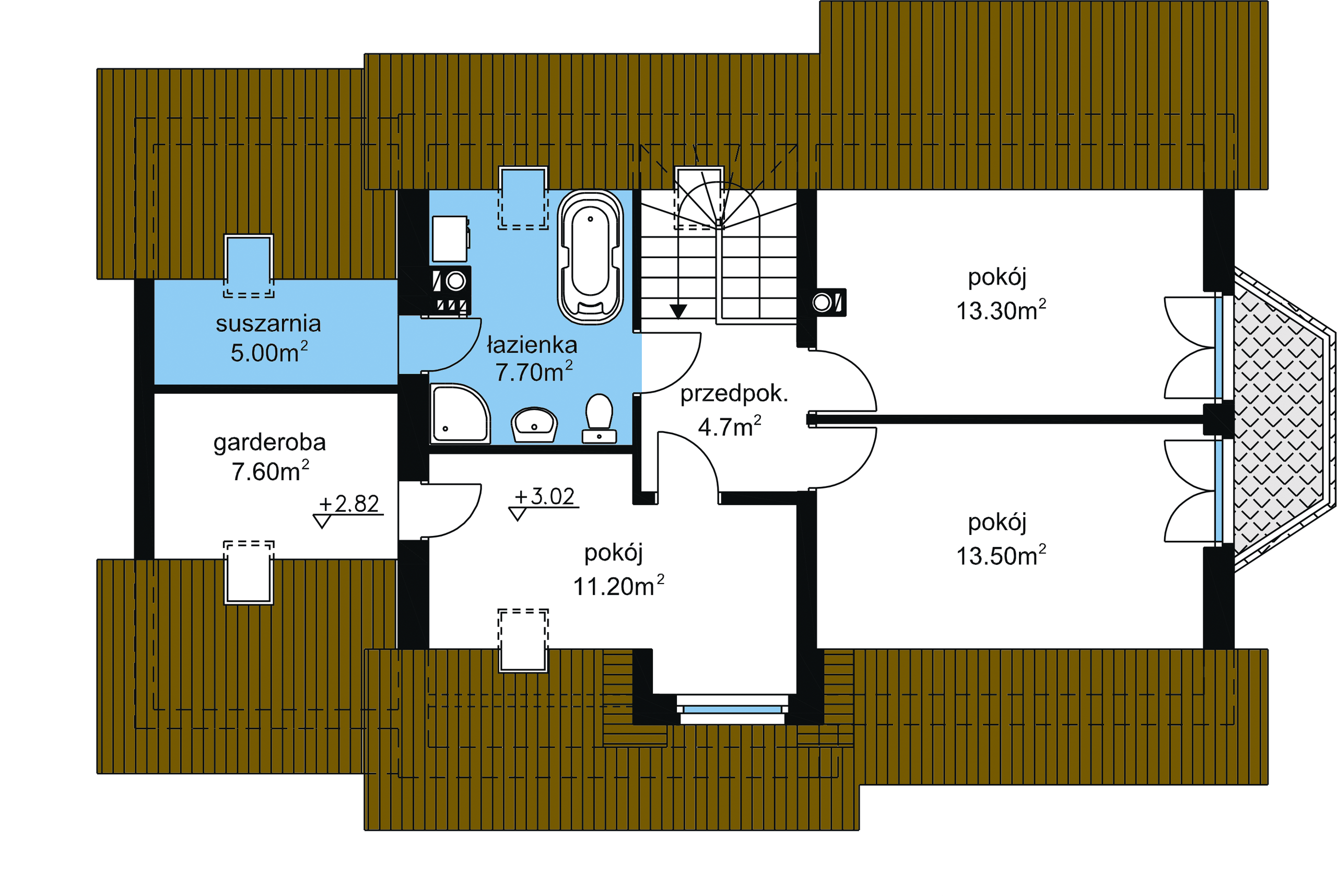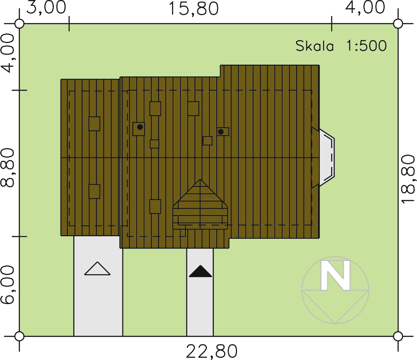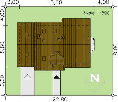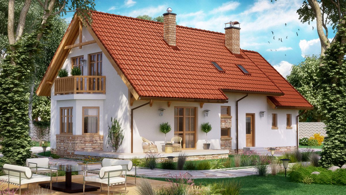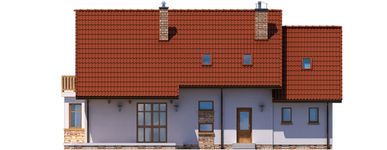 Graficzne opracowanie rzutów poglądowych widocznych na karcie projektu zostało wykonane przez Extradom.pl. Prezentowane przez Extradom.pl wizualizacje wykonane zostały przez autora projektu i należy poczytywać je jedynie za przykład i propozycję wykończenia, wizję architektoniczną autora projektu. Ostateczne wykończenie budynku może nastąpić na wiele sposobów. Szczegółowe rozwiązania zastosowane w oferowanej dokumentacji - w tym również ilość, lokalizacje i wygląd okien, drzwi, kominów - mogą w niewielkim stopniu różnić się od prezentowanej wizualizacji budynku.