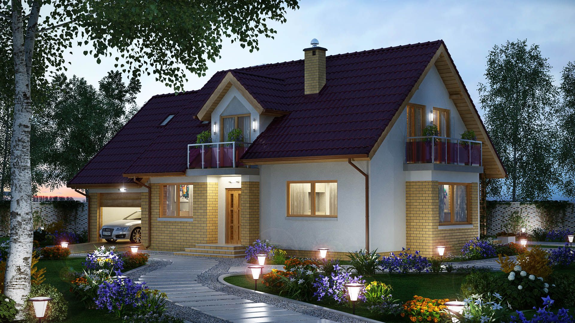 Bryła budynku opiera się na prostej, zwartej formie z dwuspadowym dachem, co jest sprawdzonym i ekonomicznym rozwiązaniem. Jednostanowiskowy garaż został zintegrowany z główną częścią domu, tworząc spójną całość. Tradycyjny charakter projektu podkreśla klasyczny dach z okapem oraz urokliwy wykusz, który nie tylko urozmaica elewację, ale również powiększa i doświetla przestrzeń jadalni. Od strony ogrodu zaplanowano wyjście na taras, a na poddaszu znajduje się balkon, co pozwala cieszyć się bliskością natury.