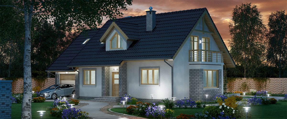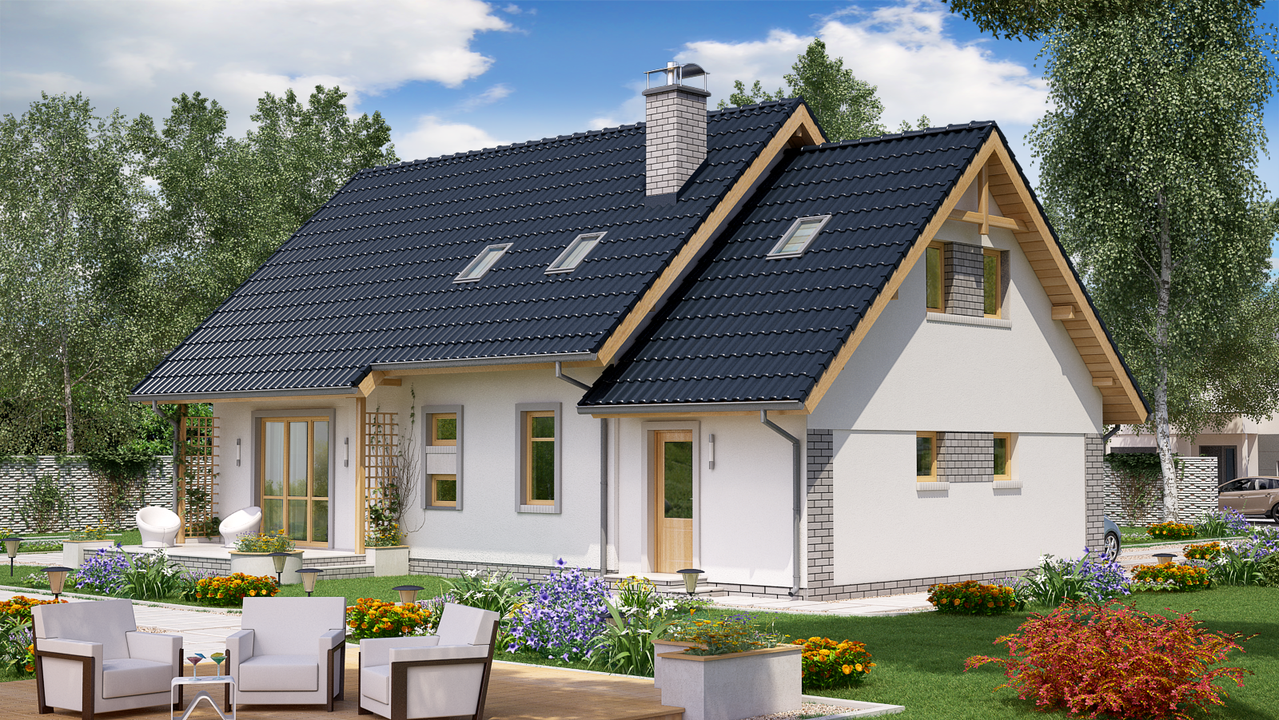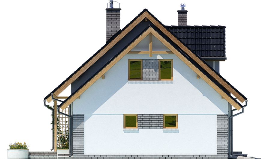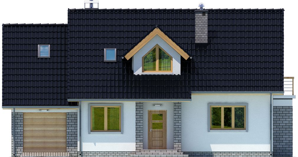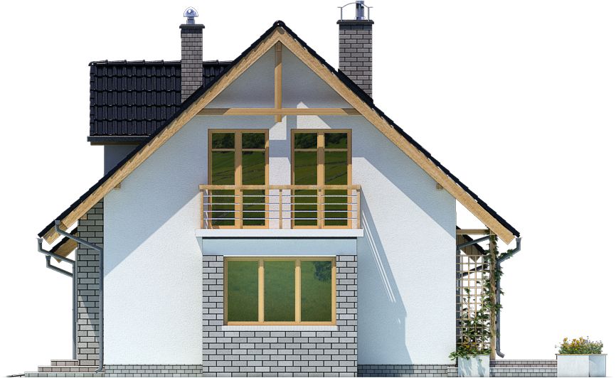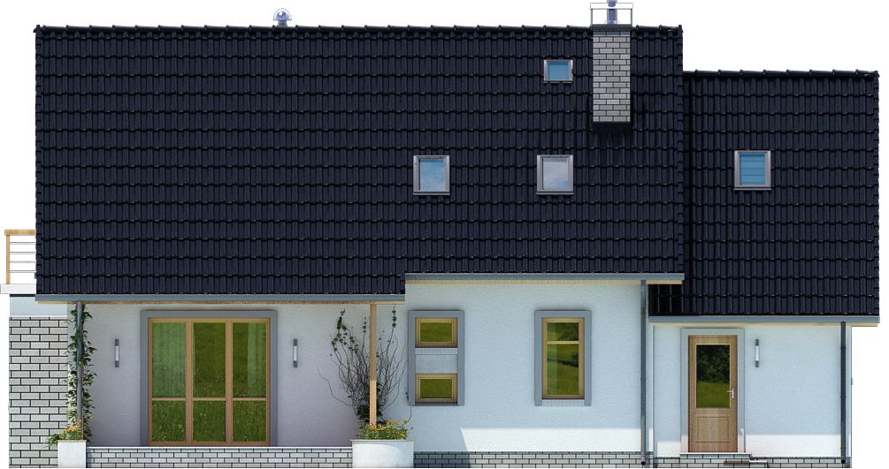 Graficzne opracowanie rzutów poglądowych widocznych na karcie projektu zostało wykonane przez Extradom.pl. Prezentowane przez Extradom.pl wizualizacje wykonane zostały przez autora projektu i należy poczytywać je jedynie za przykład i propozycję wykończenia, wizję architektoniczną autora projektu. Ostateczne wykończenie budynku może nastąpić na wiele sposobów. Szczegółowe rozwiązania zastosowane w oferowanej dokumentacji - w tym również ilość, lokalizacje i wygląd okien, drzwi, kominów - mogą w niewielkim stopniu różnić się od prezentowanej wizualizacji budynku.