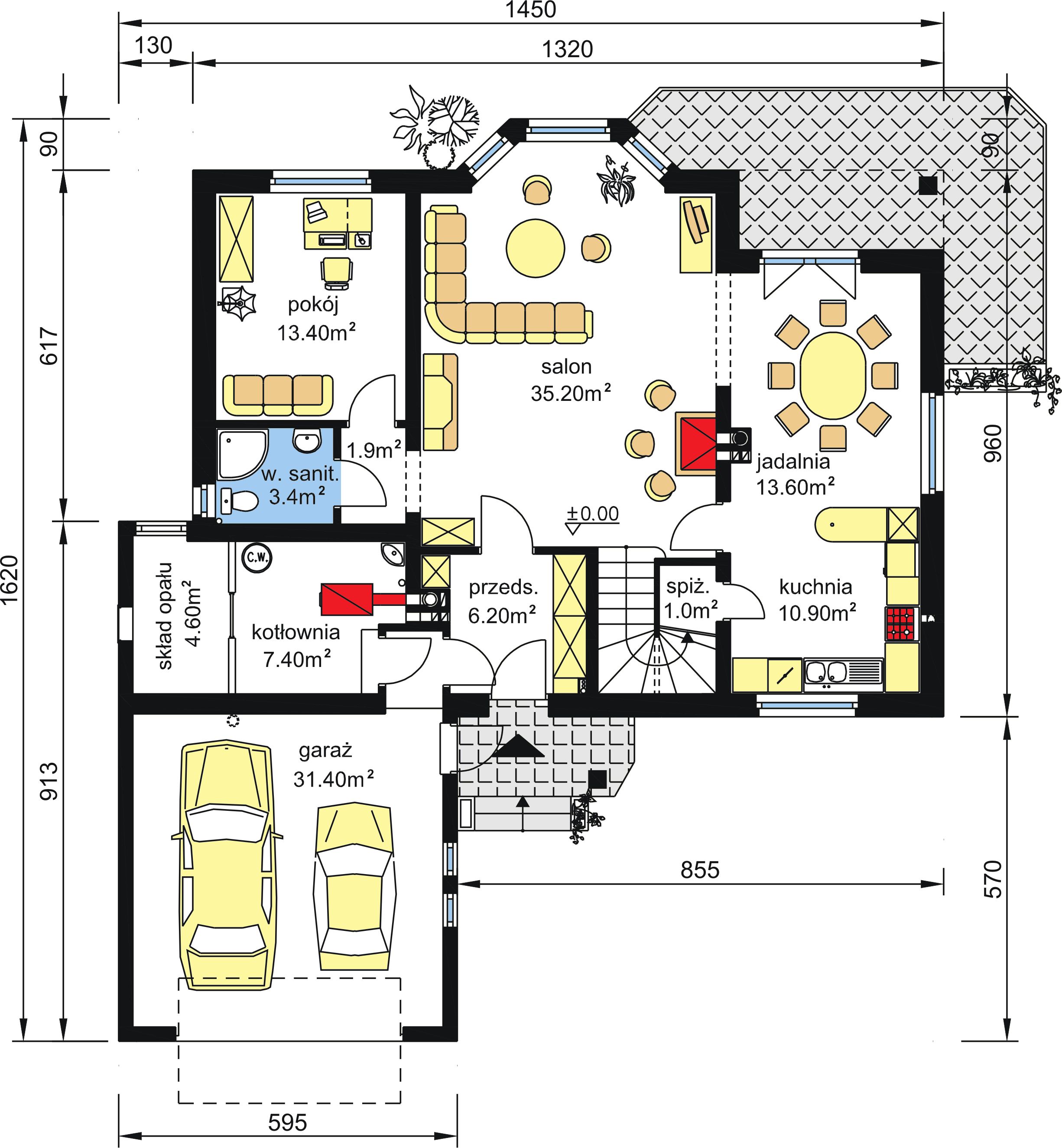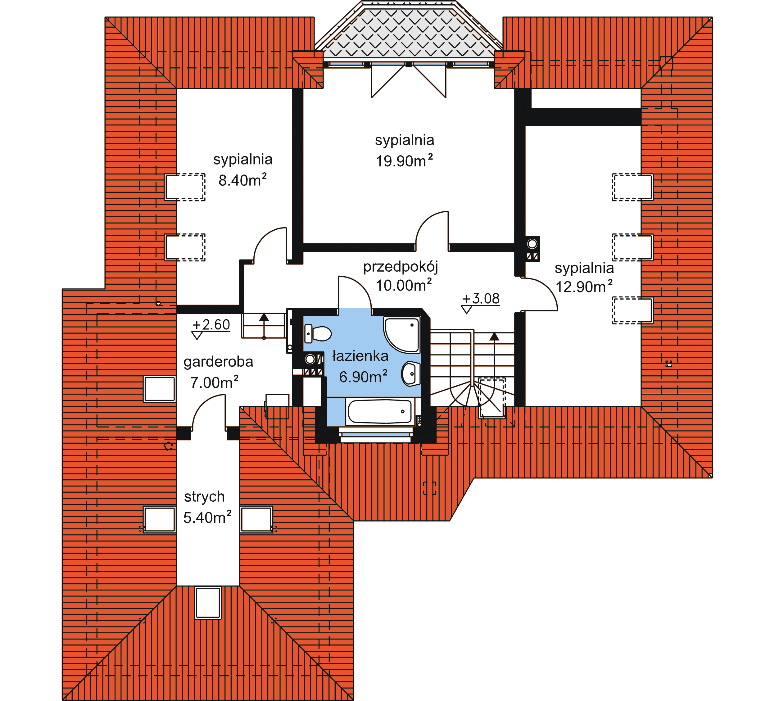 Graficzne opracowanie rzutów poglądowych widocznych na karcie projektu zostało wykonane przez Extradom.pl. Prezentowane przez Extradom.pl wizualizacje wykonane zostały przez autora projektu i należy poczytywać je jedynie za przykład i propozycję wykończenia, wizję architektoniczną autora projektu. Ostateczne wykończenie budynku może nastąpić na wiele sposobów. Szczegółowe rozwiązania zastosowane w oferowanej dokumentacji - w tym również ilość, lokalizacje i wygląd okien, drzwi, kominów - mogą w niewielkim stopniu różnić się od prezentowanej wizualizacji budynku.