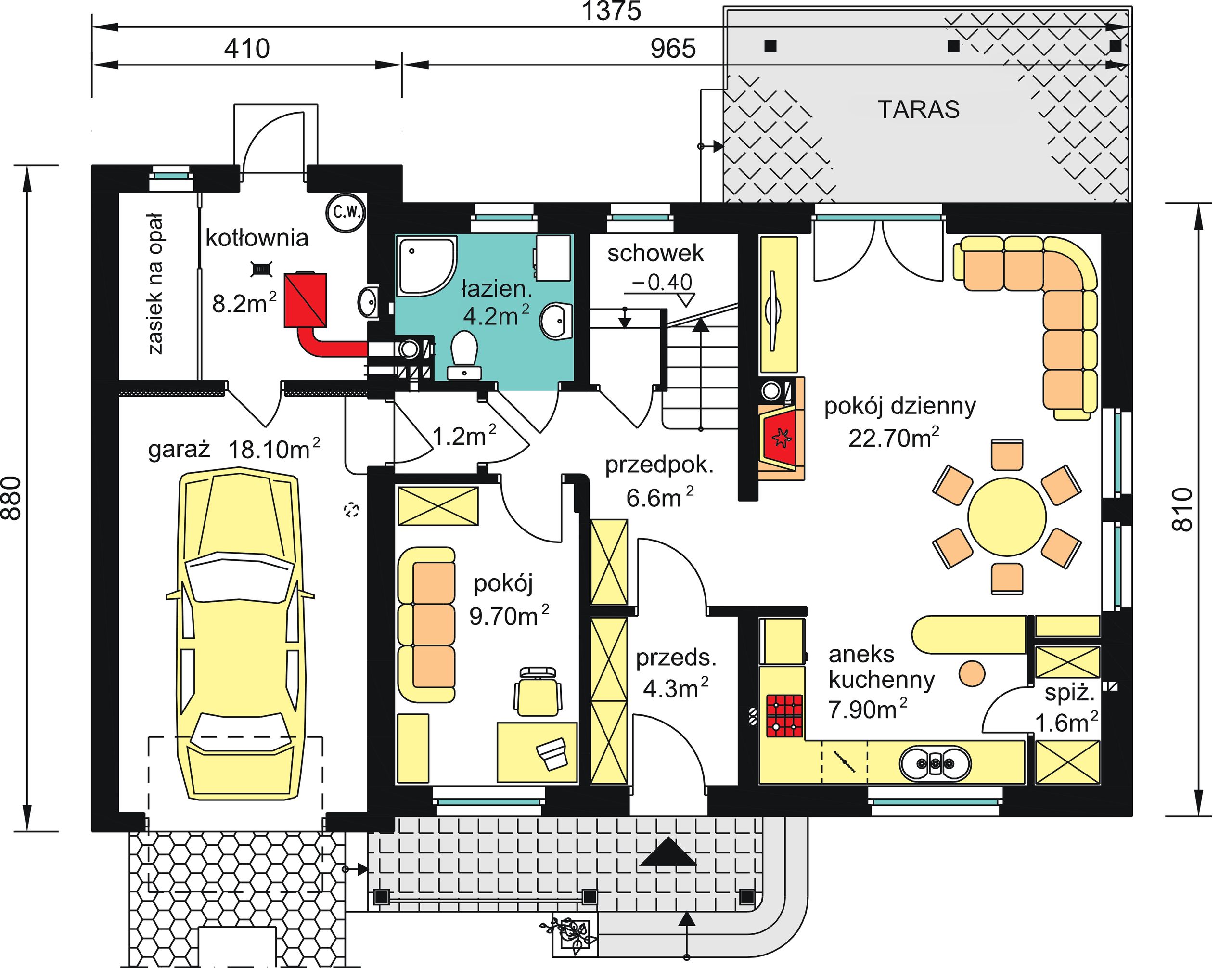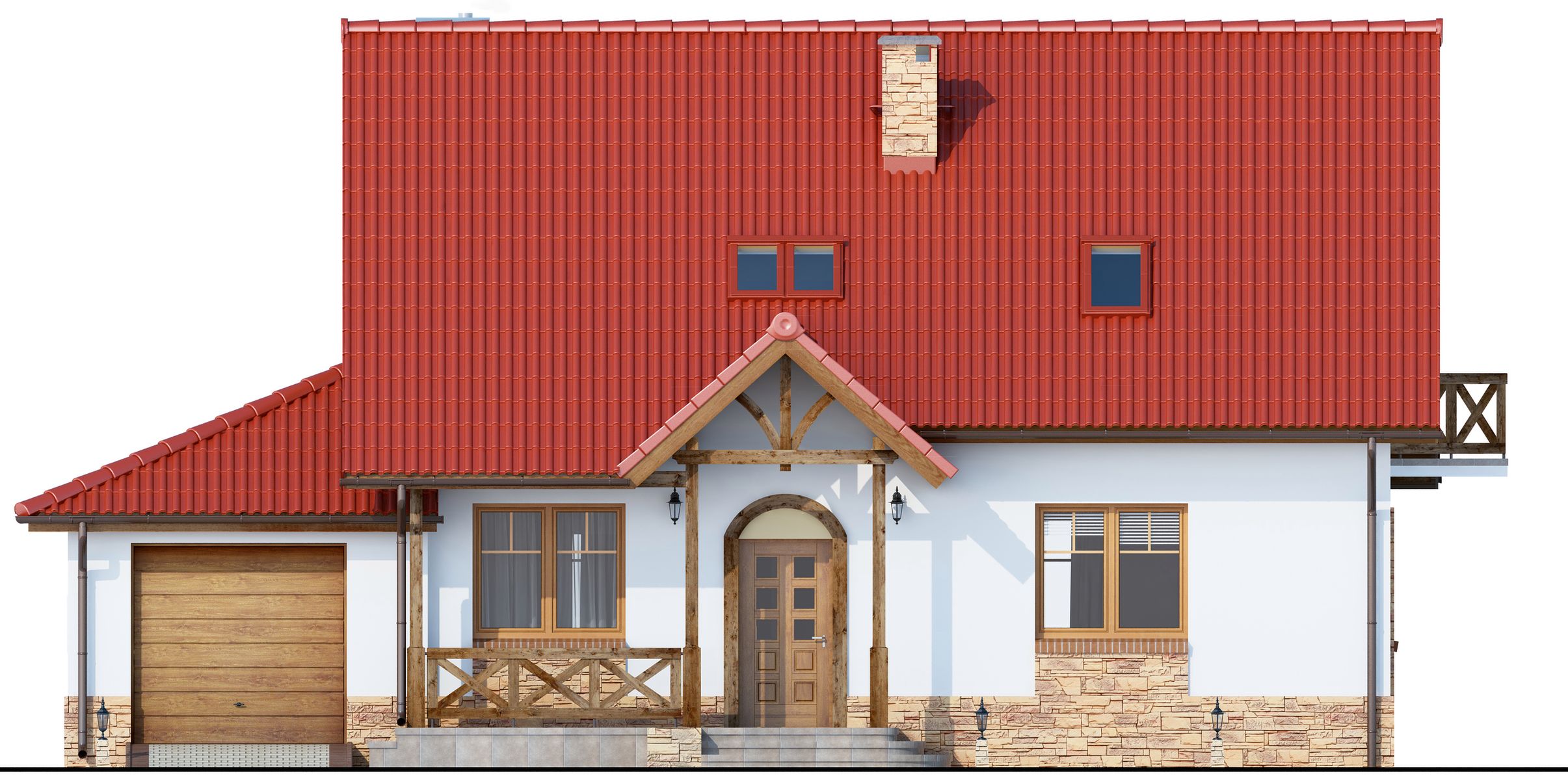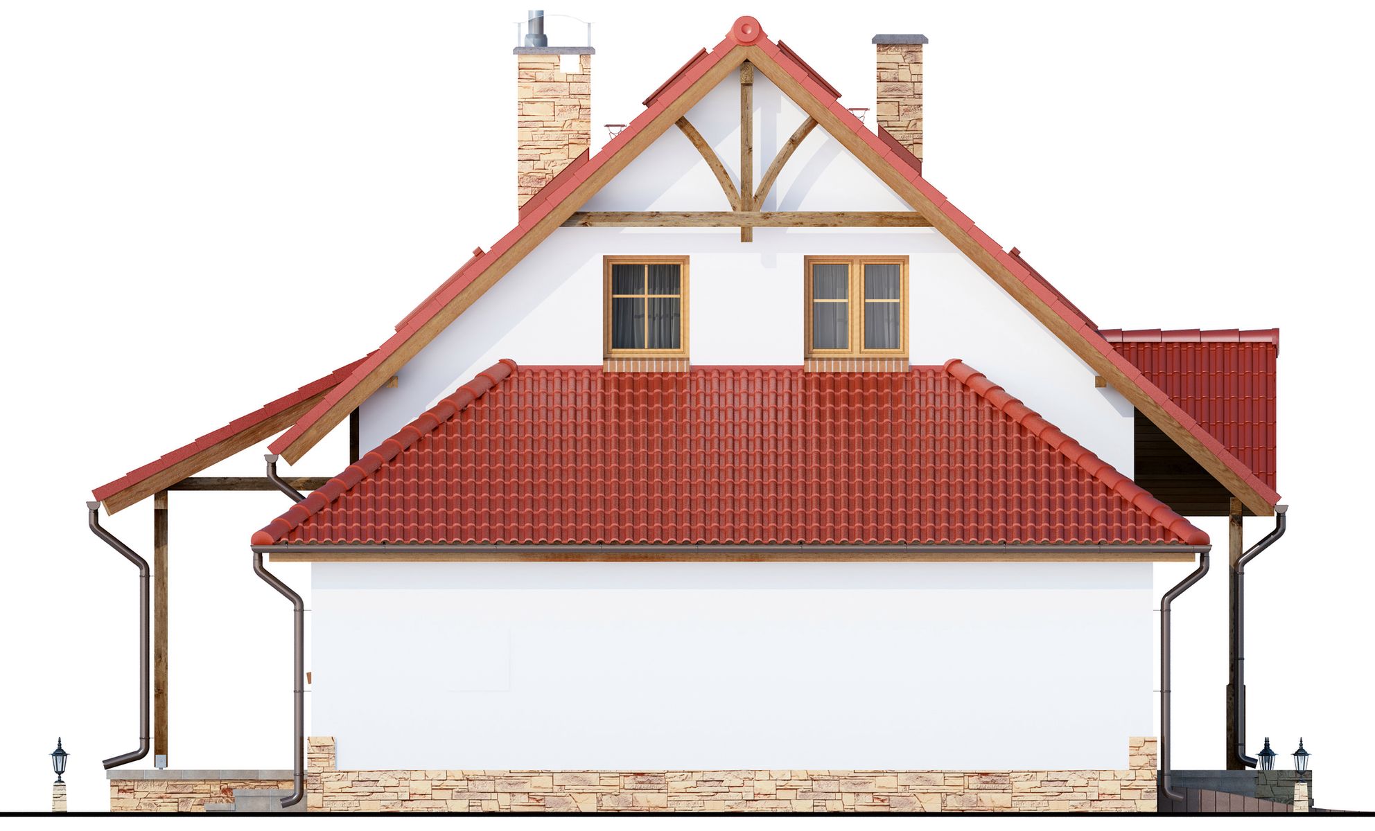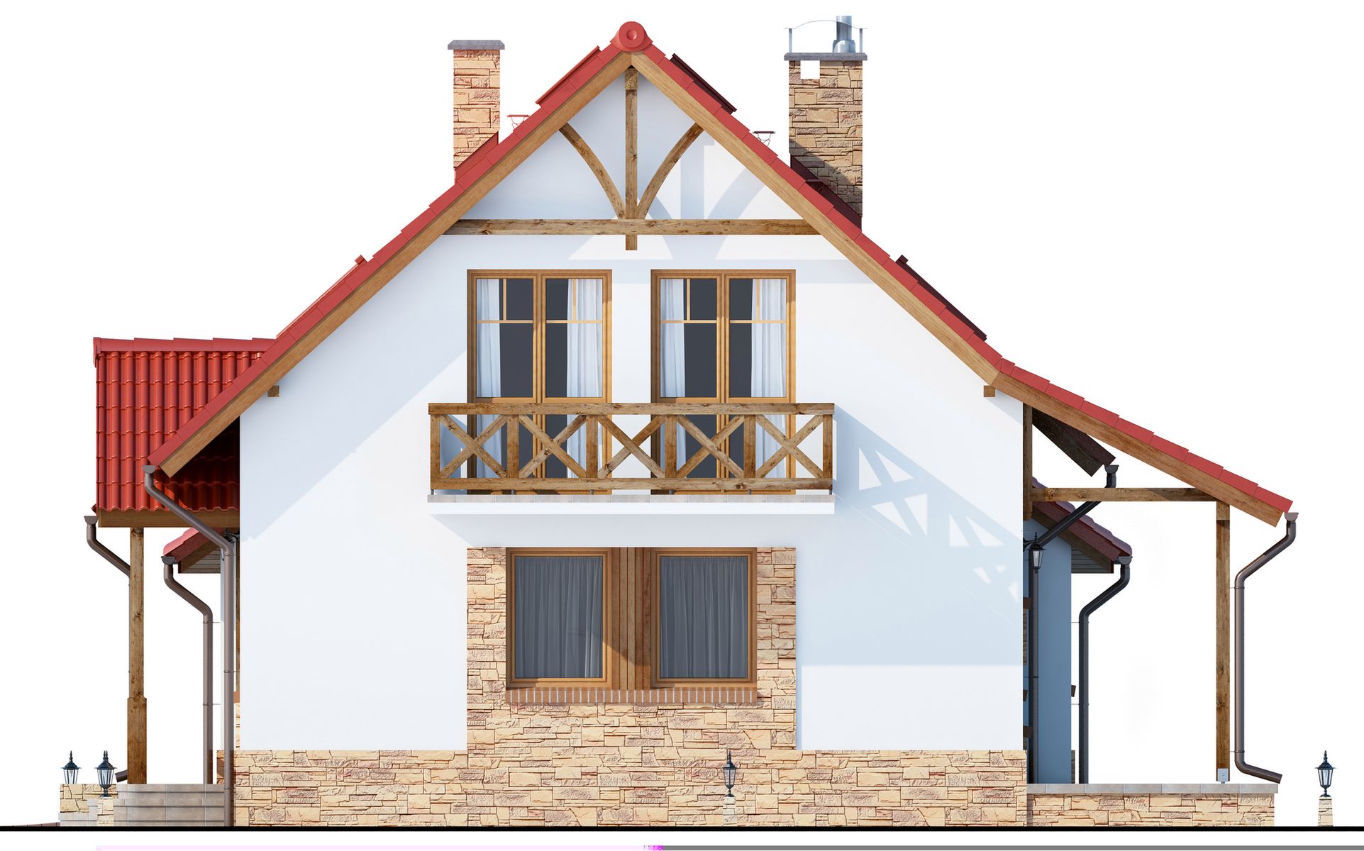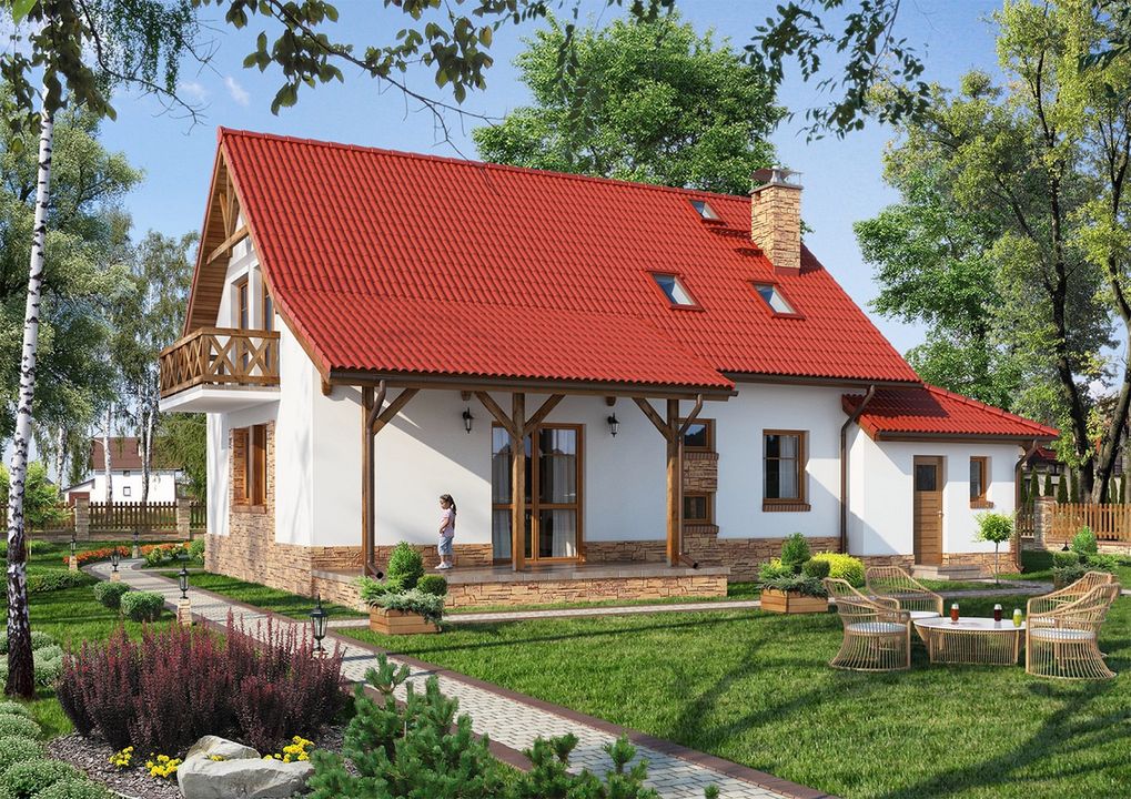 Graficzne opracowanie rzutów poglądowych widocznych na karcie projektu zostało wykonane przez Extradom.pl. Prezentowane przez Extradom.pl wizualizacje wykonane zostały przez autora projektu i należy poczytywać je jedynie za przykład i propozycję wykończenia, wizję architektoniczną autora projektu. Ostateczne wykończenie budynku może nastąpić na wiele sposobów. Szczegółowe rozwiązania zastosowane w oferowanej dokumentacji - w tym również ilość, lokalizacje i wygląd okien, drzwi, kominów - mogą w niewielkim stopniu różnić się od prezentowanej wizualizacji budynku.