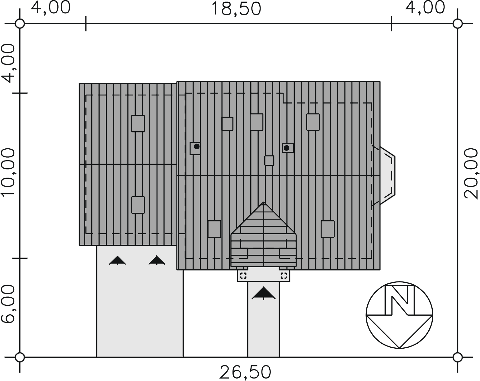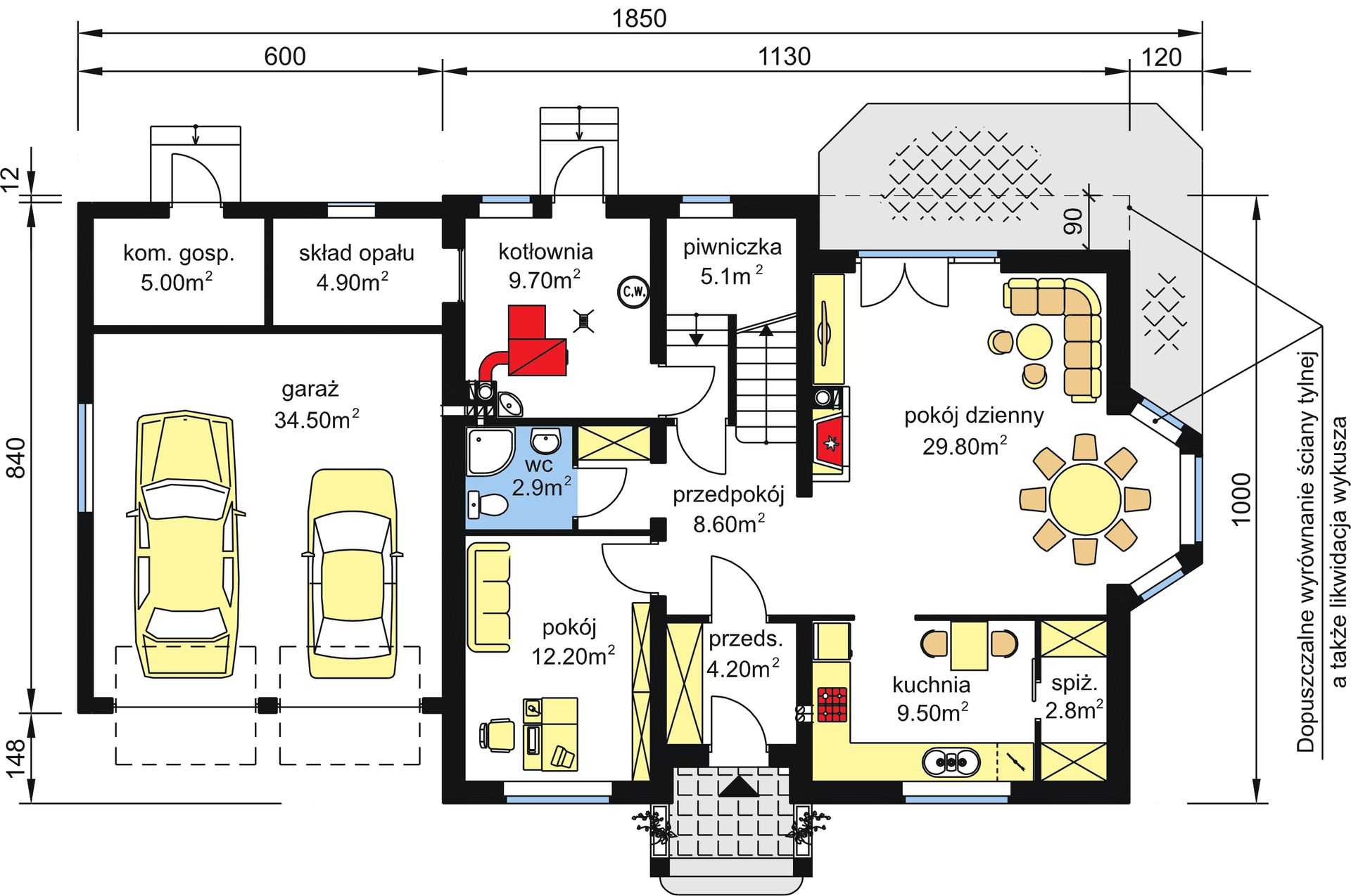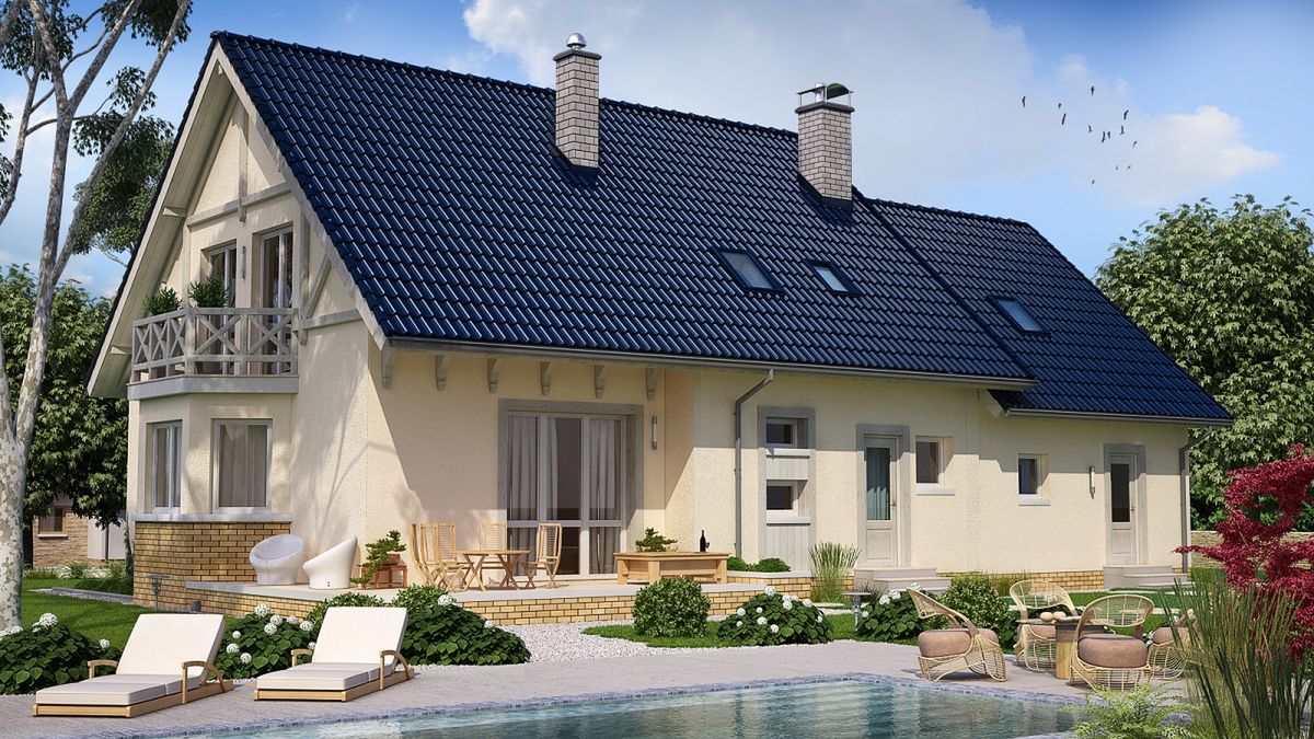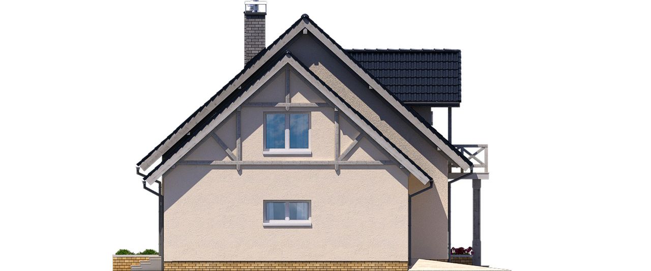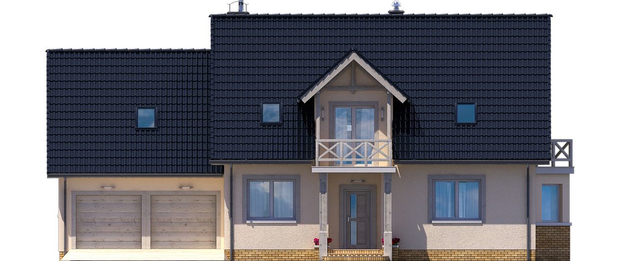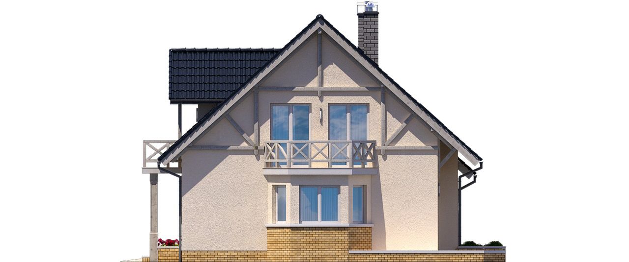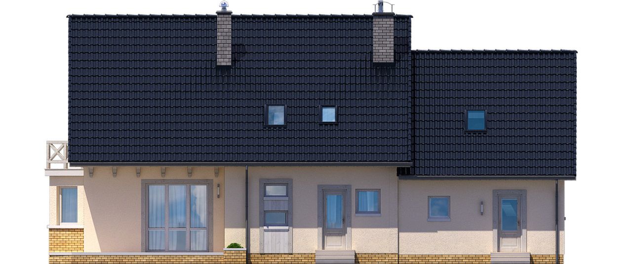 Graficzne opracowanie rzutów poglądowych widocznych na karcie projektu zostało wykonane przez Extradom.pl. Prezentowane przez Extradom.pl wizualizacje wykonane zostały przez autora projektu i należy poczytywać je jedynie za przykład i propozycję wykończenia, wizję architektoniczną autora projektu. Ostateczne wykończenie budynku może nastąpić na wiele sposobów. Szczegółowe rozwiązania zastosowane w oferowanej dokumentacji - w tym również ilość, lokalizacje i wygląd okien, drzwi, kominów - mogą w niewielkim stopniu różnić się od prezentowanej wizualizacji budynku.