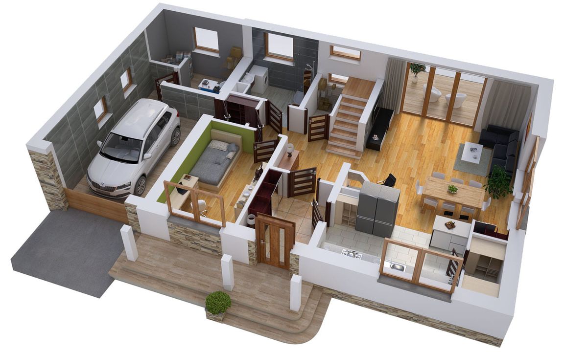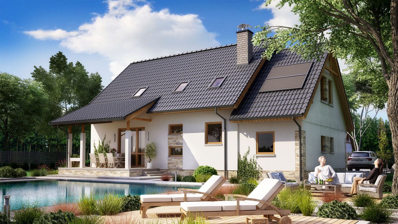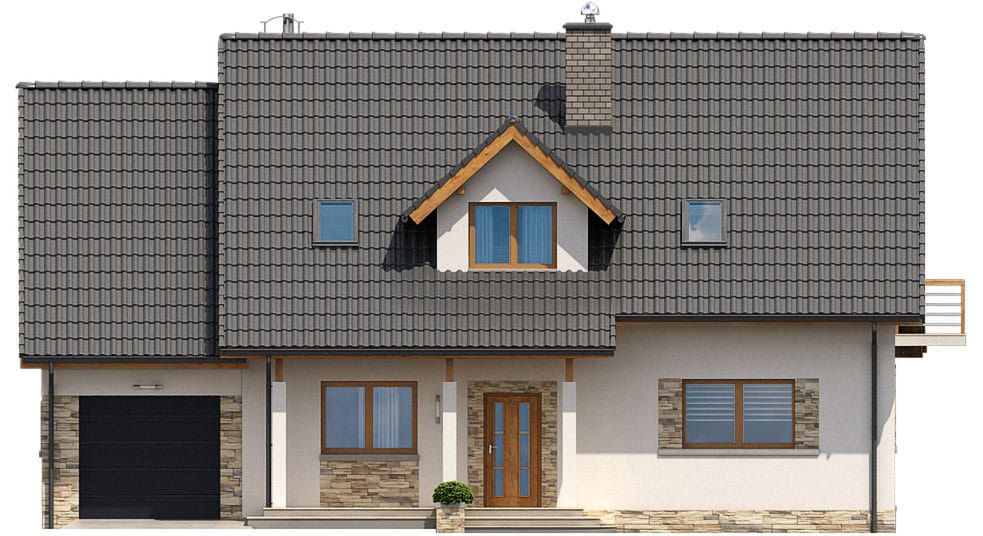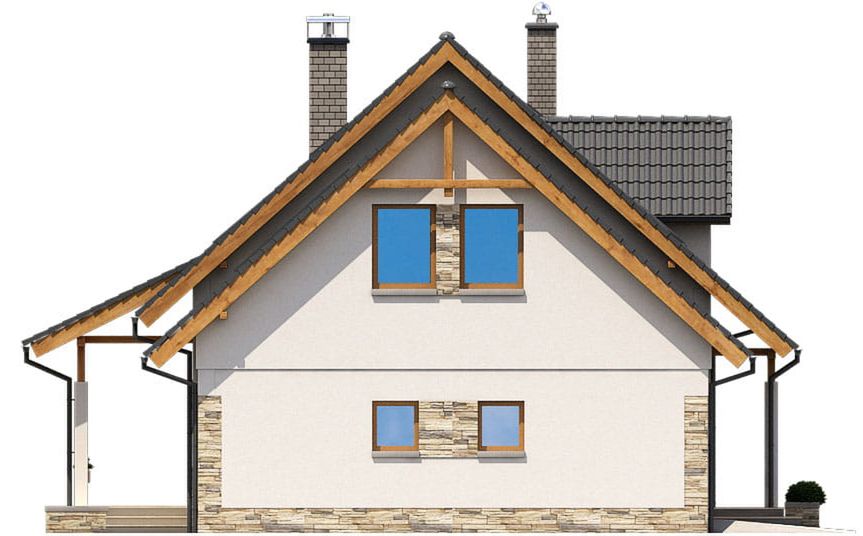 Graficzne opracowanie rzutów poglądowych widocznych na karcie projektu zostało wykonane przez Extradom.pl. Prezentowane przez Extradom.pl wizualizacje wykonane zostały przez autora projektu i należy poczytywać je jedynie za przykład i propozycję wykończenia, wizję architektoniczną autora projektu. Ostateczne wykończenie budynku może nastąpić na wiele sposobów. Szczegółowe rozwiązania zastosowane w oferowanej dokumentacji - w tym również ilość, lokalizacje i wygląd okien, drzwi, kominów - mogą w niewielkim stopniu różnić się od prezentowanej wizualizacji budynku.