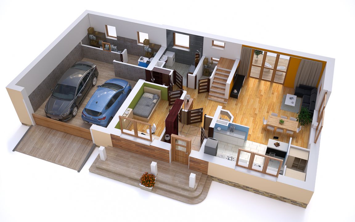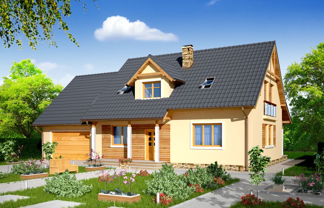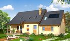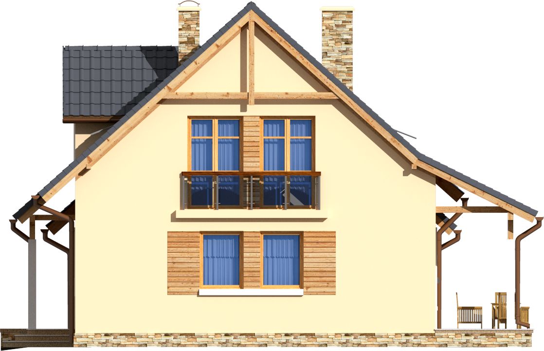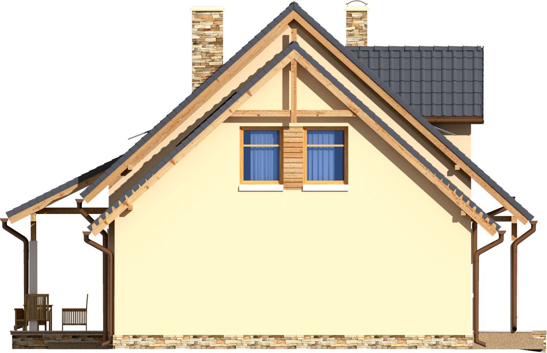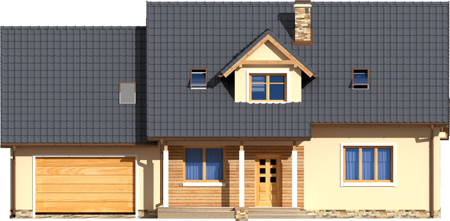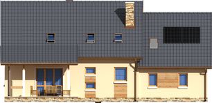 Graficzne opracowanie rzutów poglądowych widocznych na karcie projektu zostało wykonane przez Extradom.pl. Prezentowane przez Extradom.pl wizualizacje wykonane zostały przez autora projektu i należy poczytywać je jedynie za przykład i propozycję wykończenia, wizję architektoniczną autora projektu. Ostateczne wykończenie budynku może nastąpić na wiele sposobów. Szczegółowe rozwiązania zastosowane w oferowanej dokumentacji - w tym również ilość, lokalizacje i wygląd okien, drzwi, kominów - mogą w niewielkim stopniu różnić się od prezentowanej wizualizacji budynku.