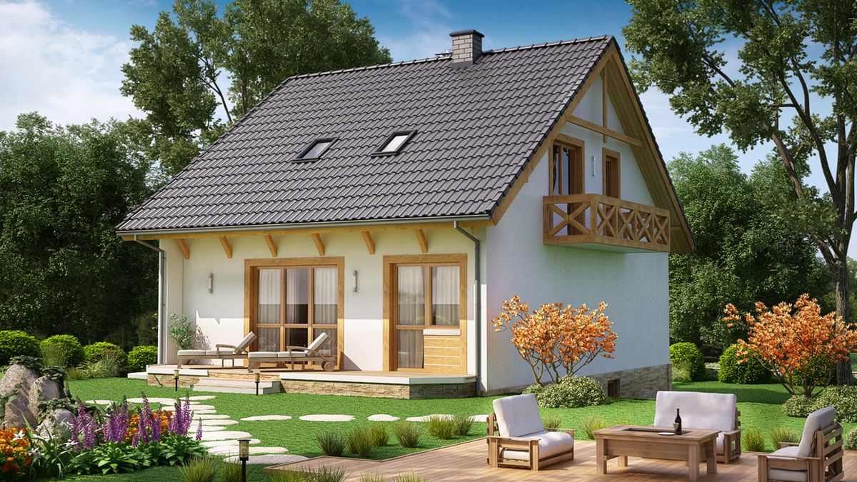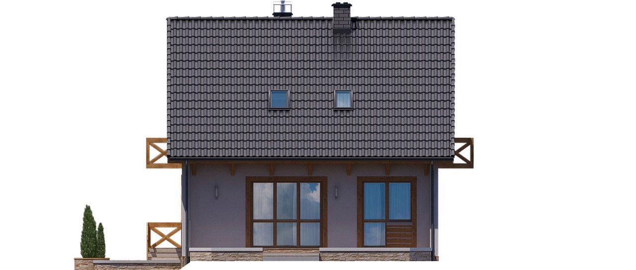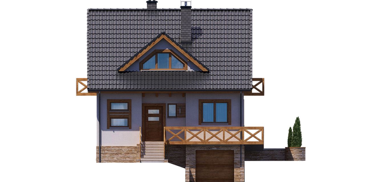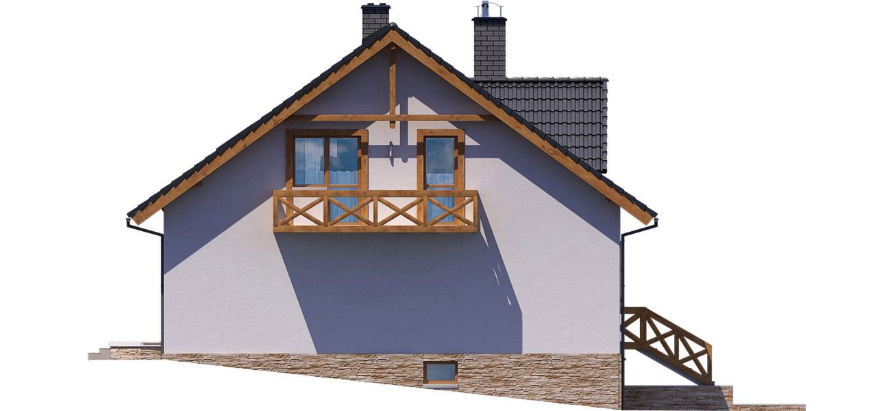 Projekt BW-32 wariant 1 prezentuje się jako dom w tradycyjnym stylu z poddaszem użytkowym, oparty na prostej bryle przekrytej dwuspadowym dachem. Taka konstrukcja jest estetyczna i sprzyja ekonomicznej budowie. Jasna elewacja z drewnianymi detalami i balustradami nadaje budynkowi ciepły, sielski charakter, który doskonale komponuje się z otoczeniem. Projekt jest zaprojektowany z myślą o lokalizacji na skarpie, dzięki czemu w naturalny sposób integruje dwustanowiskowy garaż i obszerną piwnicę z poziomem terenu.
