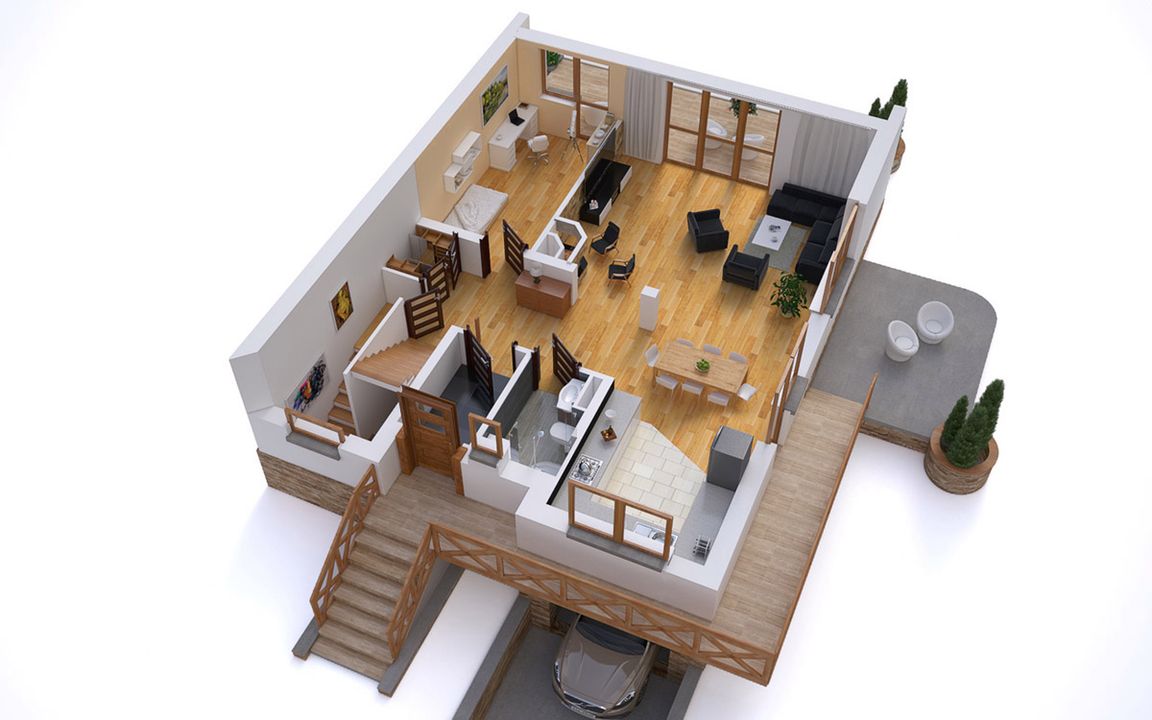 Graficzne opracowanie rzutów poglądowych widocznych na karcie projektu zostało wykonane przez Extradom.pl. Prezentowane przez Extradom.pl wizualizacje wykonane zostały przez autora projektu i należy poczytywać je jedynie za przykład i propozycję wykończenia, wizję architektoniczną autora projektu. Ostateczne wykończenie budynku może nastąpić na wiele sposobów. Szczegółowe rozwiązania zastosowane w oferowanej dokumentacji - w tym również ilość, lokalizacje i wygląd okien, drzwi, kominów - mogą w niewielkim stopniu różnić się od prezentowanej wizualizacji budynku.