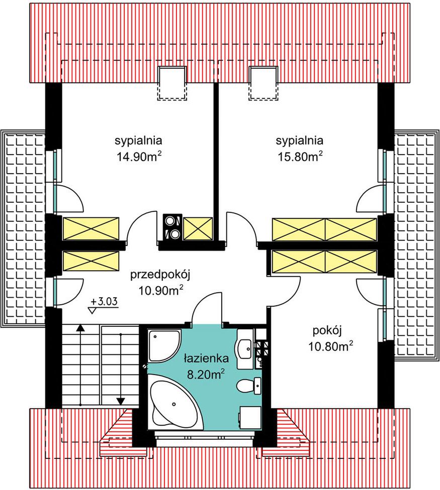 Poddasze to intymna strefa nocna z trzema sypialniami oraz wspólną łazienką. Taki wyraźny podział na strefę dzienną, nocną oraz gospodarczą w piwnicy gwarantuje mieszkańcom wygodę i prywatność na co dzień.