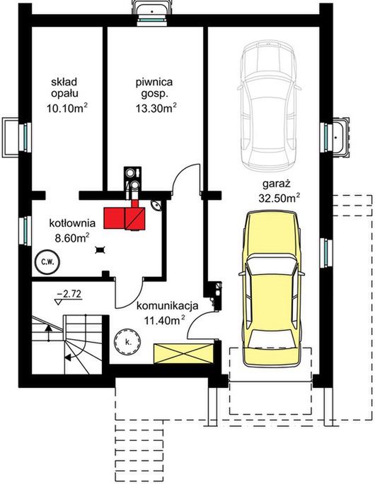 Na poziomie piwnicy zlokalizowano obszerną część gospodarczą, w skład której wchodzi: