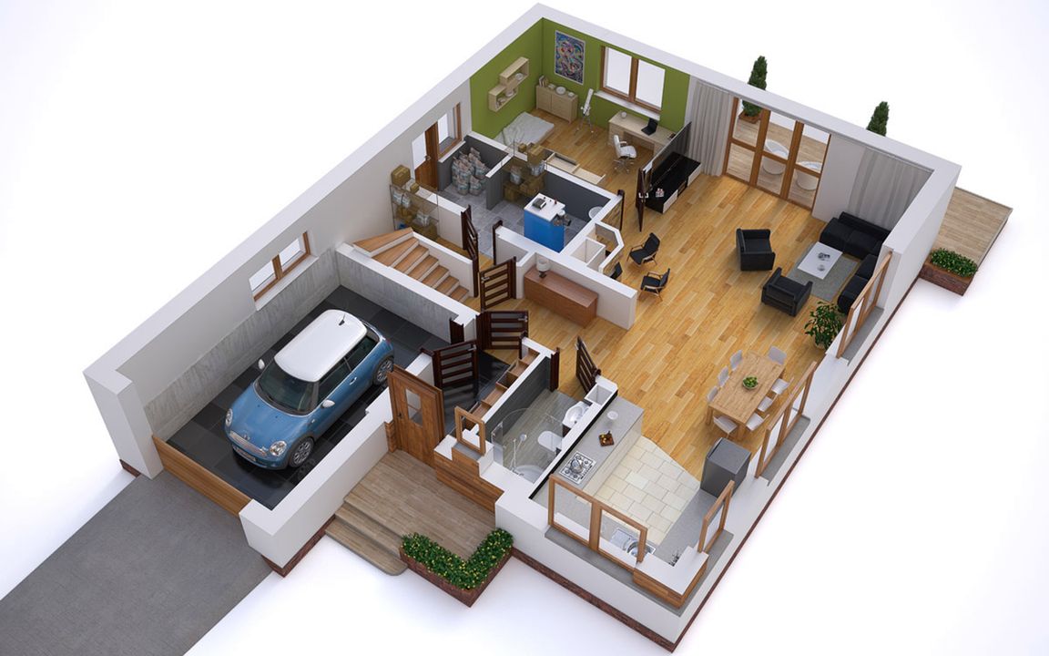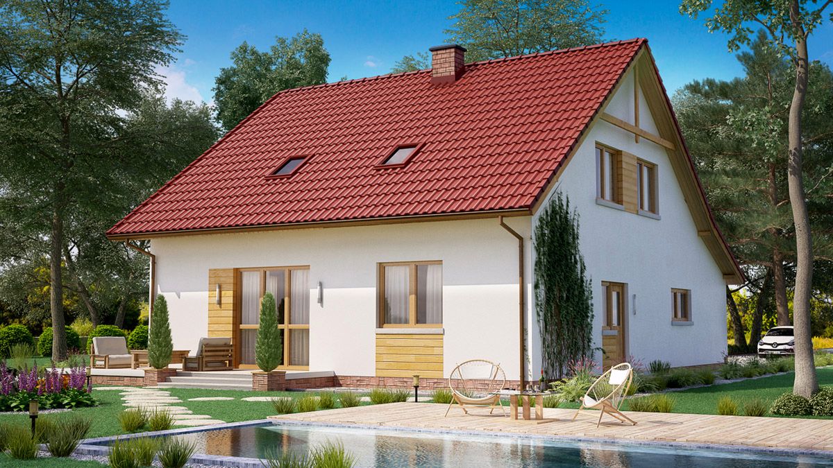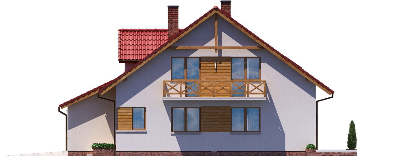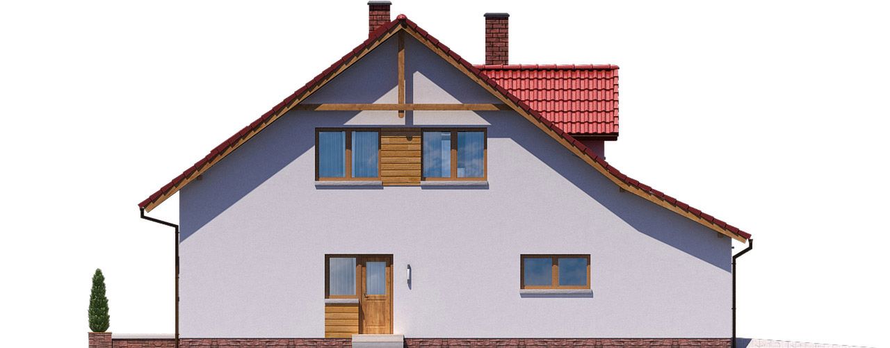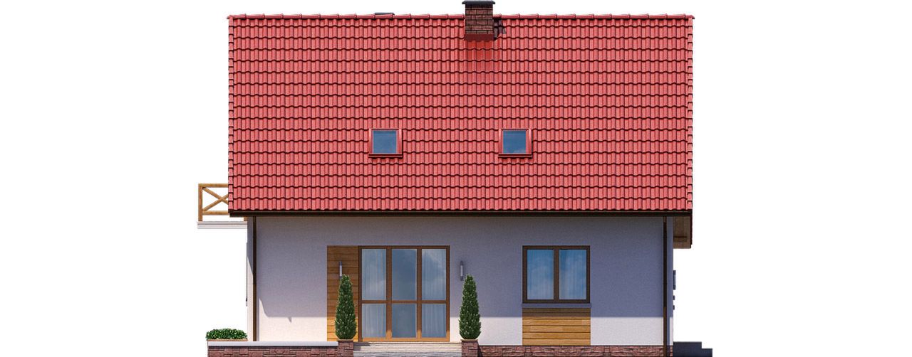 Graficzne opracowanie rzutów poglądowych widocznych na karcie projektu zostało wykonane przez Extradom.pl. Prezentowane przez Extradom.pl wizualizacje wykonane zostały przez autora projektu i należy poczytywać je jedynie za przykład i propozycję wykończenia, wizję architektoniczną autora projektu. Ostateczne wykończenie budynku może nastąpić na wiele sposobów. Szczegółowe rozwiązania zastosowane w oferowanej dokumentacji - w tym również ilość, lokalizacje i wygląd okien, drzwi, kominów - mogą w niewielkim stopniu różnić się od prezentowanej wizualizacji budynku.