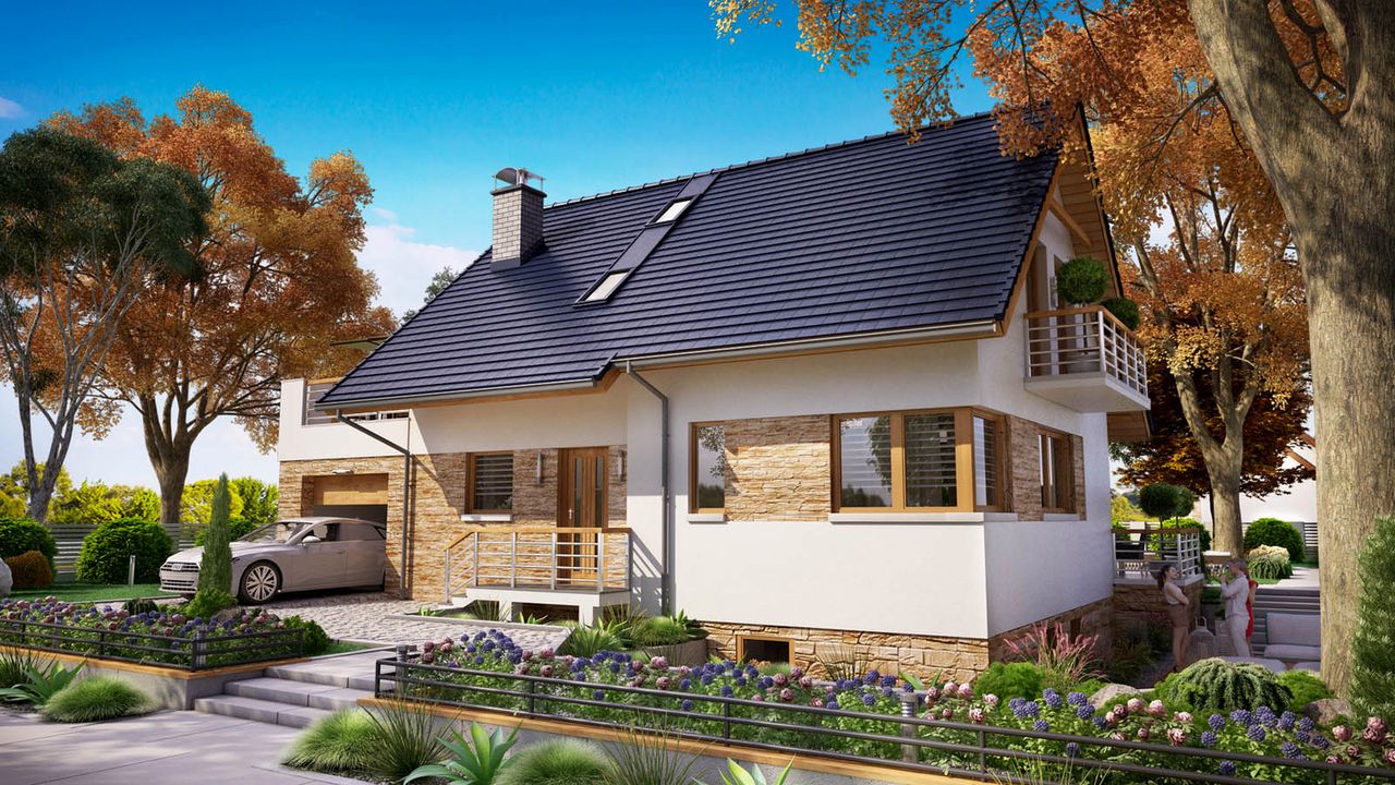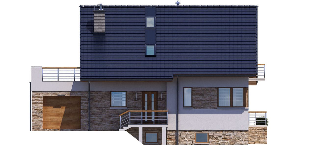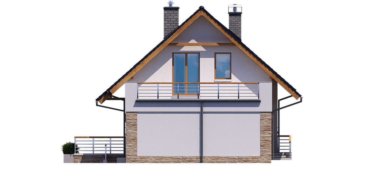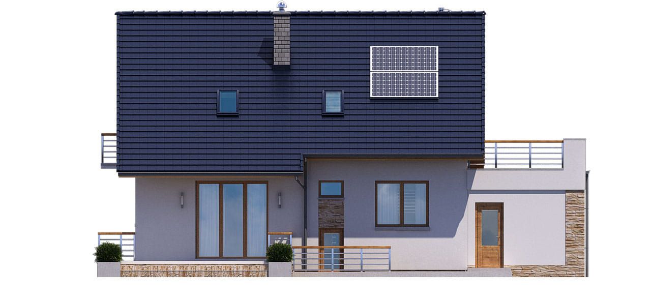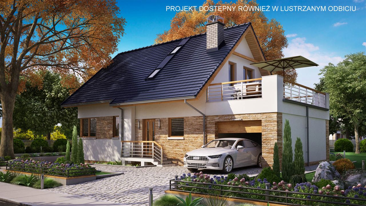 Graficzne opracowanie rzutów poglądowych widocznych na karcie projektu zostało wykonane przez Extradom.pl. Prezentowane przez Extradom.pl wizualizacje wykonane zostały przez autora projektu i należy poczytywać je jedynie za przykład i propozycję wykończenia, wizję architektoniczną autora projektu. Ostateczne wykończenie budynku może nastąpić na wiele sposobów. Szczegółowe rozwiązania zastosowane w oferowanej dokumentacji - w tym również ilość, lokalizacje i wygląd okien, drzwi, kominów - mogą w niewielkim stopniu różnić się od prezentowanej wizualizacji budynku.
