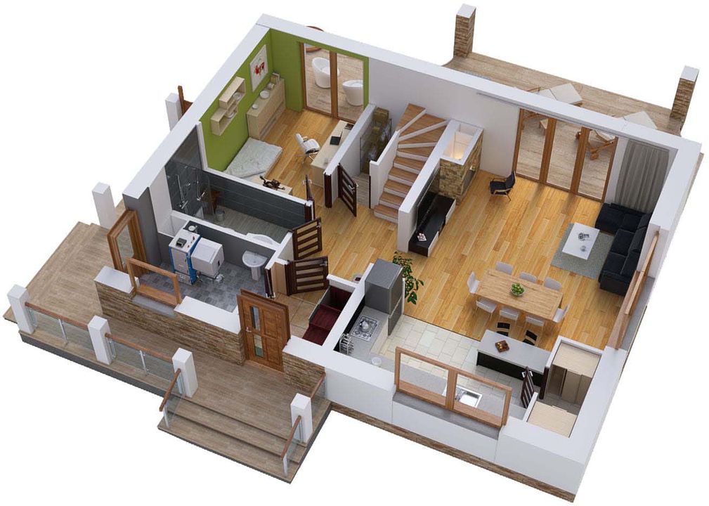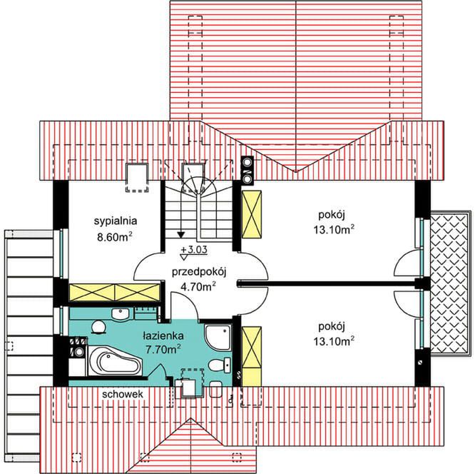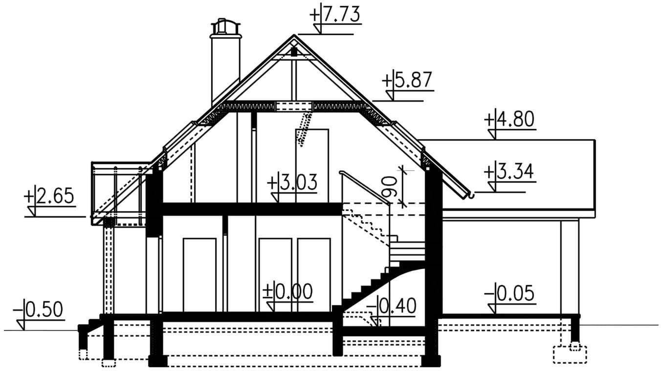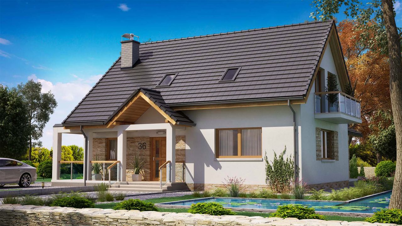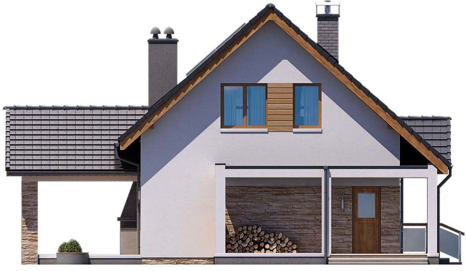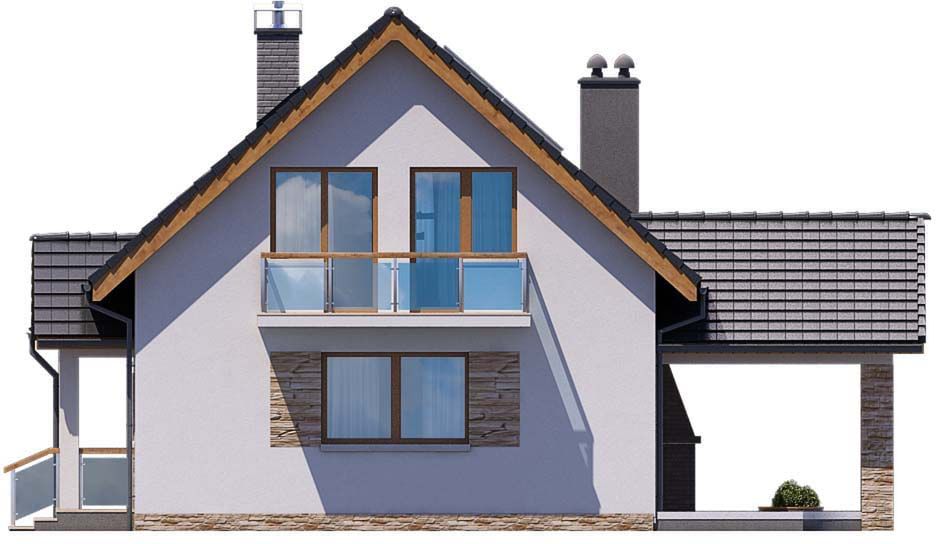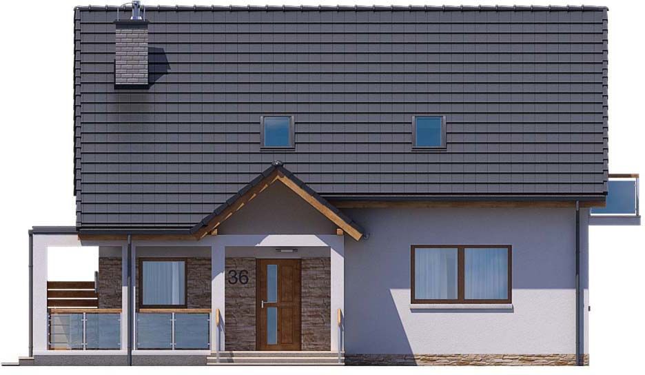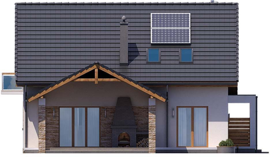 Graficzne opracowanie rzutów poglądowych widocznych na karcie projektu zostało wykonane przez Extradom.pl. Prezentowane przez Extradom.pl wizualizacje wykonane zostały przez autora projektu i należy poczytywać je jedynie za przykład i propozycję wykończenia, wizję architektoniczną autora projektu. Ostateczne wykończenie budynku może nastąpić na wiele sposobów. Szczegółowe rozwiązania zastosowane w oferowanej dokumentacji - w tym również ilość, lokalizacje i wygląd okien, drzwi, kominów - mogą w niewielkim stopniu różnić się od prezentowanej wizualizacji budynku.