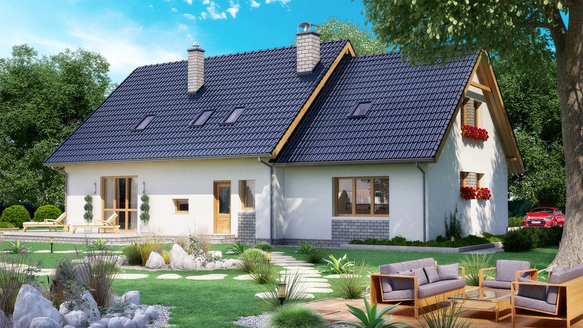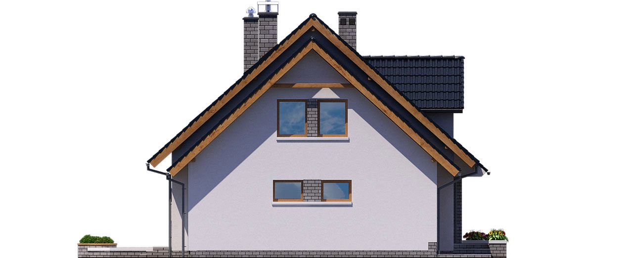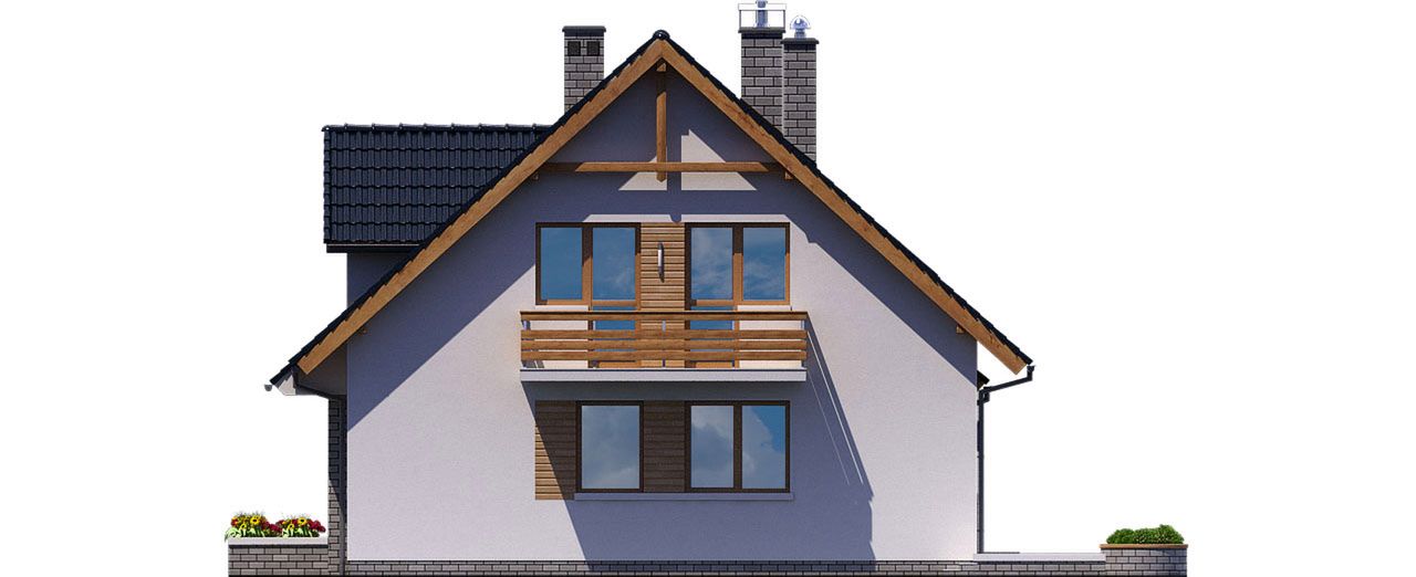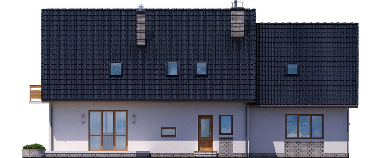 Graficzne opracowanie rzutów poglądowych widocznych na karcie projektu zostało wykonane przez Extradom.pl. Prezentowane przez Extradom.pl wizualizacje wykonane zostały przez autora projektu i należy poczytywać je jedynie za przykład i propozycję wykończenia, wizję architektoniczną autora projektu. Ostateczne wykończenie budynku może nastąpić na wiele sposobów. Szczegółowe rozwiązania zastosowane w oferowanej dokumentacji - w tym również ilość, lokalizacje i wygląd okien, drzwi, kominów - mogą w niewielkim stopniu różnić się od prezentowanej wizualizacji budynku.