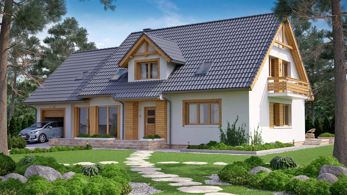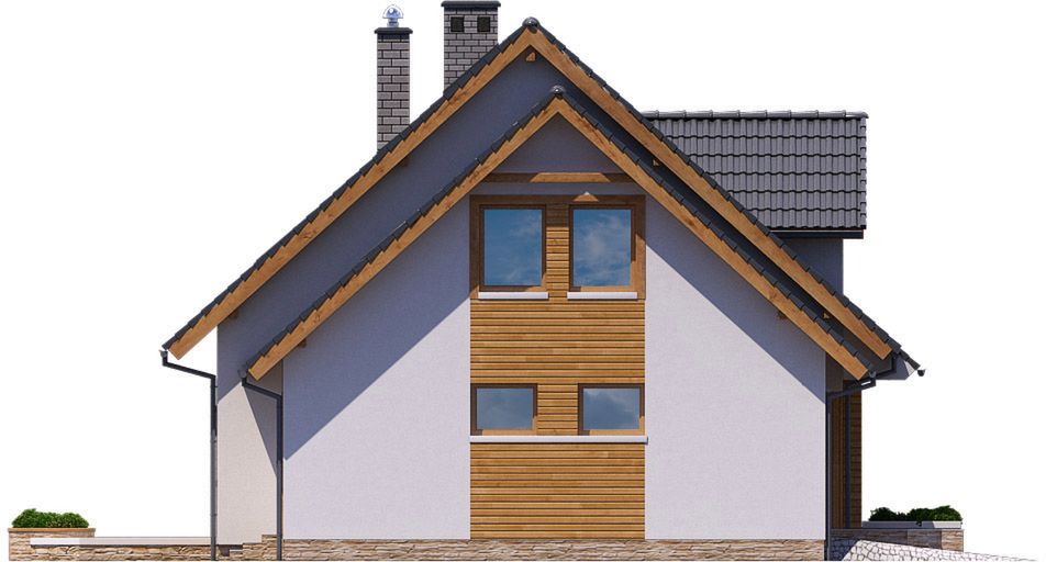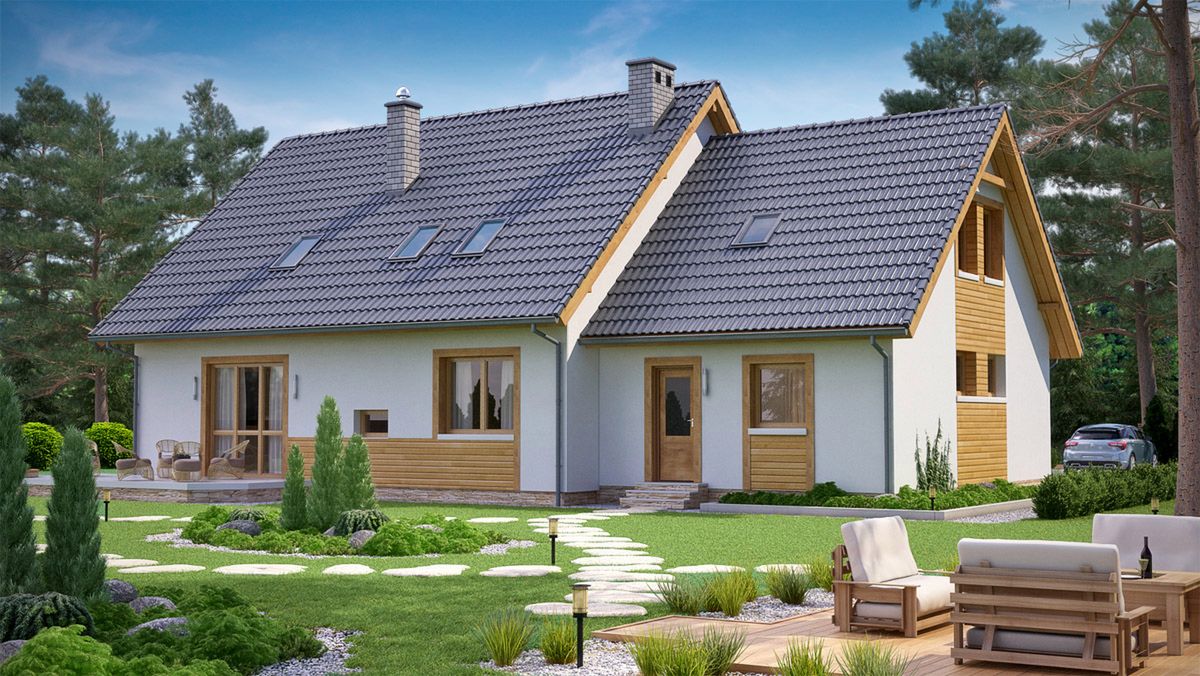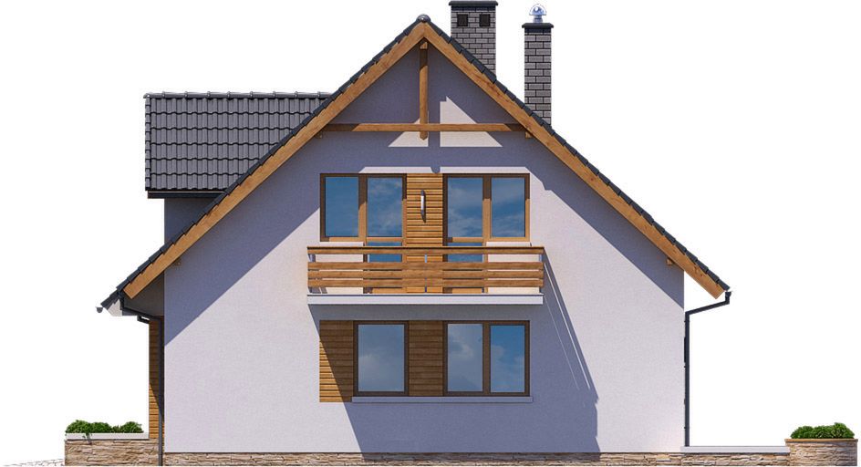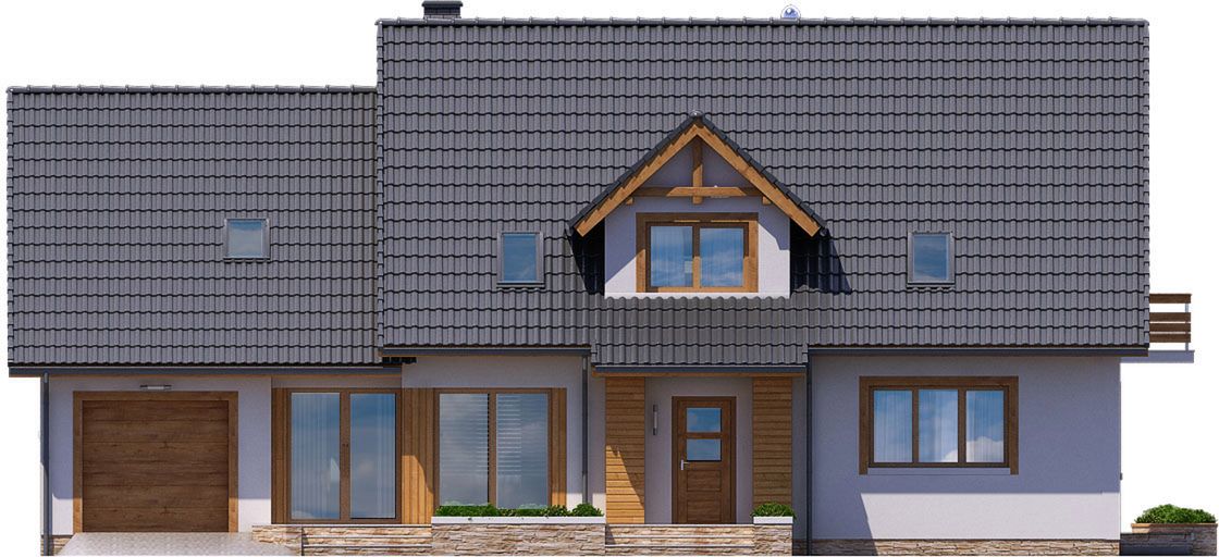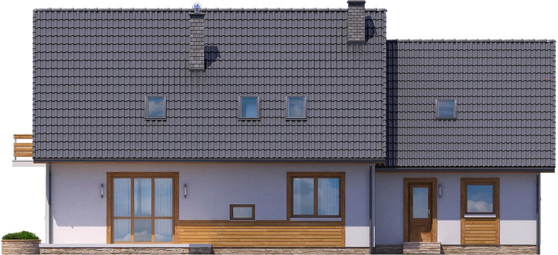 Graficzne opracowanie rzutów poglądowych widocznych na karcie projektu zostało wykonane przez Extradom.pl. Prezentowane przez Extradom.pl wizualizacje wykonane zostały przez autora projektu i należy poczytywać je jedynie za przykład i propozycję wykończenia, wizję architektoniczną autora projektu. Ostateczne wykończenie budynku może nastąpić na wiele sposobów. Szczegółowe rozwiązania zastosowane w oferowanej dokumentacji - w tym również ilość, lokalizacje i wygląd okien, drzwi, kominów - mogą w niewielkim stopniu różnić się od prezentowanej wizualizacji budynku.
