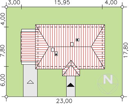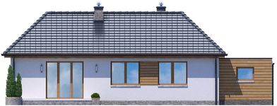 Graficzne opracowanie rzutów poglądowych widocznych na karcie projektu zostało wykonane przez Extradom.pl. Prezentowane przez Extradom.pl wizualizacje wykonane zostały przez autora projektu i należy poczytywać je jedynie za przykład i propozycję wykończenia, wizję architektoniczną autora projektu. Ostateczne wykończenie budynku może nastąpić na wiele sposobów. Szczegółowe rozwiązania zastosowane w oferowanej dokumentacji - w tym również ilość, lokalizacje i wygląd okien, drzwi, kominów - mogą w niewielkim stopniu różnić się od prezentowanej wizualizacji budynku.