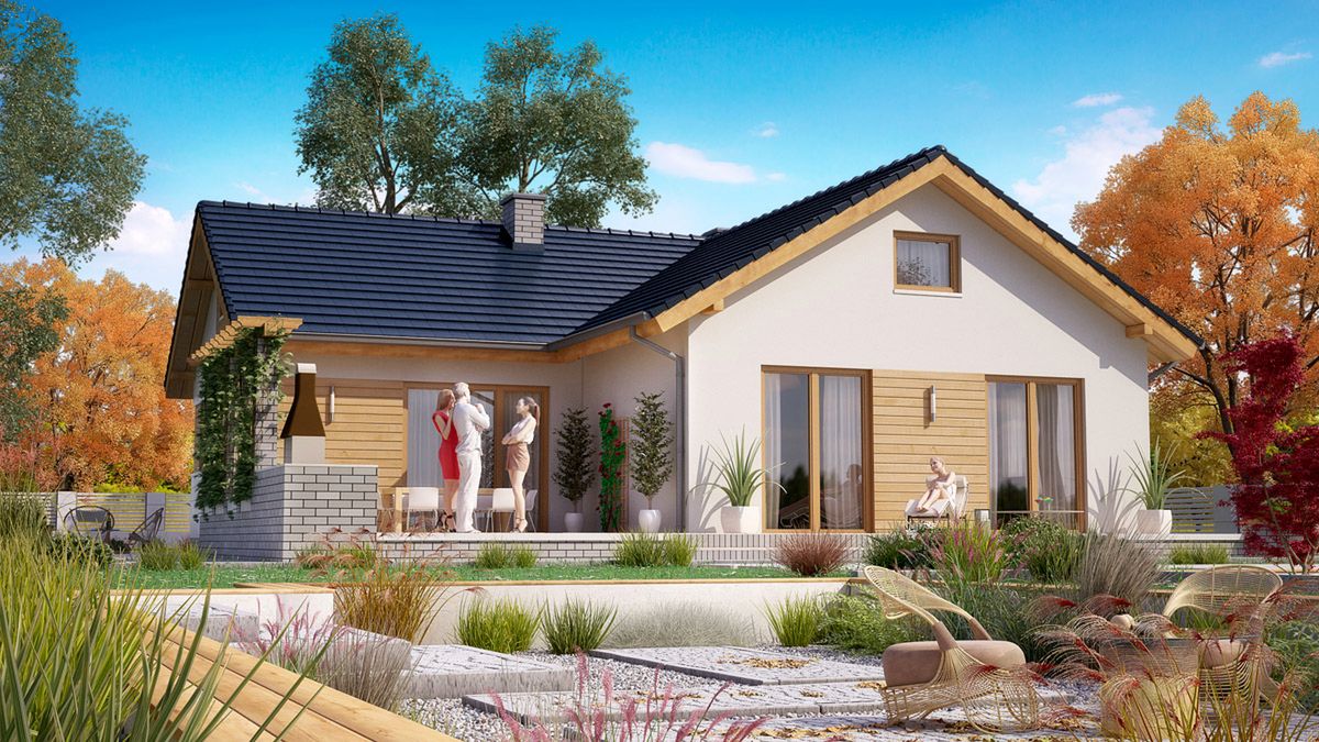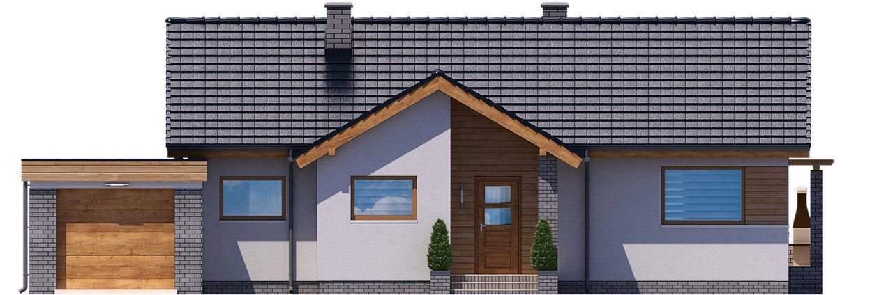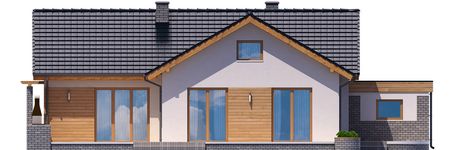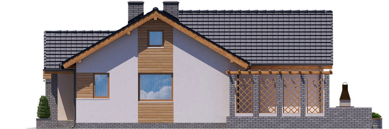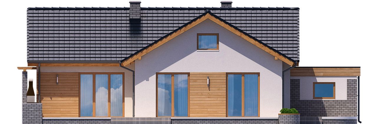 Graficzne opracowanie rzutów poglądowych widocznych na karcie projektu zostało wykonane przez Extradom.pl. Prezentowane przez Extradom.pl wizualizacje wykonane zostały przez autora projektu i należy poczytywać je jedynie za przykład i propozycję wykończenia, wizję architektoniczną autora projektu. Ostateczne wykończenie budynku może nastąpić na wiele sposobów. Szczegółowe rozwiązania zastosowane w oferowanej dokumentacji - w tym również ilość, lokalizacje i wygląd okien, drzwi, kominów - mogą w niewielkim stopniu różnić się od prezentowanej wizualizacji budynku.