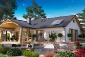 Projekt charakteryzuje się prostą, tradycyjną bryłą opartą na planie parteru, przykrytą klasycznym, dwuspadowym dachem z okapem. To sprawdzone i ekonomiczne rozwiązanie, które gwarantuje ponadczasowy wygląd. Urozmaiceniem formy jest wyraźnie wysunięta do przodu część garażowa. Elewacja utrzymana w tradycyjnym stylu doskonale komponuje się z otoczeniem, a zaplanowany od strony ogrodu taras z zewnętrznym kominkiem staje się naturalnym przedłużeniem strefy wypoczynkowej.