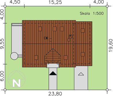 Graficzne opracowanie rzutów poglądowych widocznych na karcie projektu zostało wykonane przez Extradom.pl. Prezentowane przez Extradom.pl wizualizacje wykonane zostały przez autora projektu i należy poczytywać je jedynie za przykład i propozycję wykończenia, wizję architektoniczną autora projektu. Ostateczne wykończenie budynku może nastąpić na wiele sposobów. Szczegółowe rozwiązania zastosowane w oferowanej dokumentacji - w tym również ilość, lokalizacje i wygląd okien, drzwi, kominów - mogą w niewielkim stopniu różnić się od prezentowanej wizualizacji budynku.