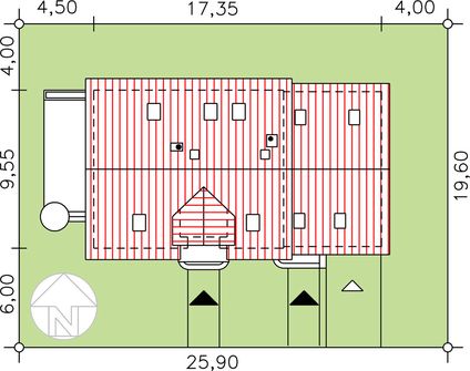 Graficzne opracowanie rzutów poglądowych widocznych na karcie projektu zostało wykonane przez Extradom.pl. Prezentowane przez Extradom.pl wizualizacje wykonane zostały przez autora projektu i należy poczytywać je jedynie za przykład i propozycję wykończenia, wizję architektoniczną autora projektu. Ostateczne wykończenie budynku może nastąpić na wiele sposobów. Szczegółowe rozwiązania zastosowane w oferowanej dokumentacji - w tym również ilość, lokalizacje i wygląd okien, drzwi, kominów - mogą w niewielkim stopniu różnić się od prezentowanej wizualizacji budynku.