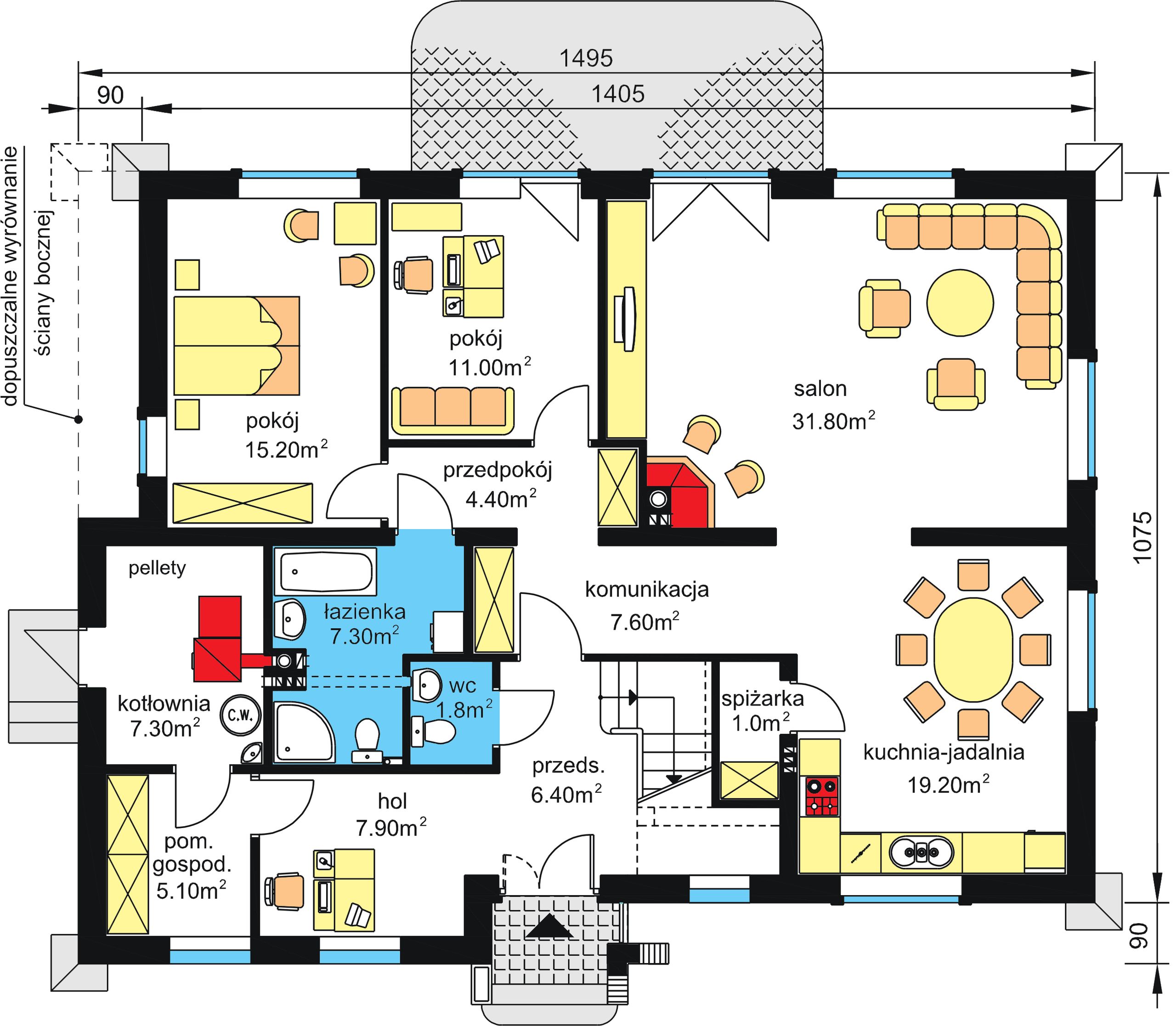 Graficzne opracowanie rzutów poglądowych widocznych na karcie projektu zostało wykonane przez Extradom.pl. Prezentowane przez Extradom.pl wizualizacje wykonane zostały przez autora projektu i należy poczytywać je jedynie za przykład i propozycję wykończenia, wizję architektoniczną autora projektu. Ostateczne wykończenie budynku może nastąpić na wiele sposobów. Szczegółowe rozwiązania zastosowane w oferowanej dokumentacji - w tym również ilość, lokalizacje i wygląd okien, drzwi, kominów - mogą w niewielkim stopniu różnić się od prezentowanej wizualizacji budynku.