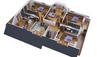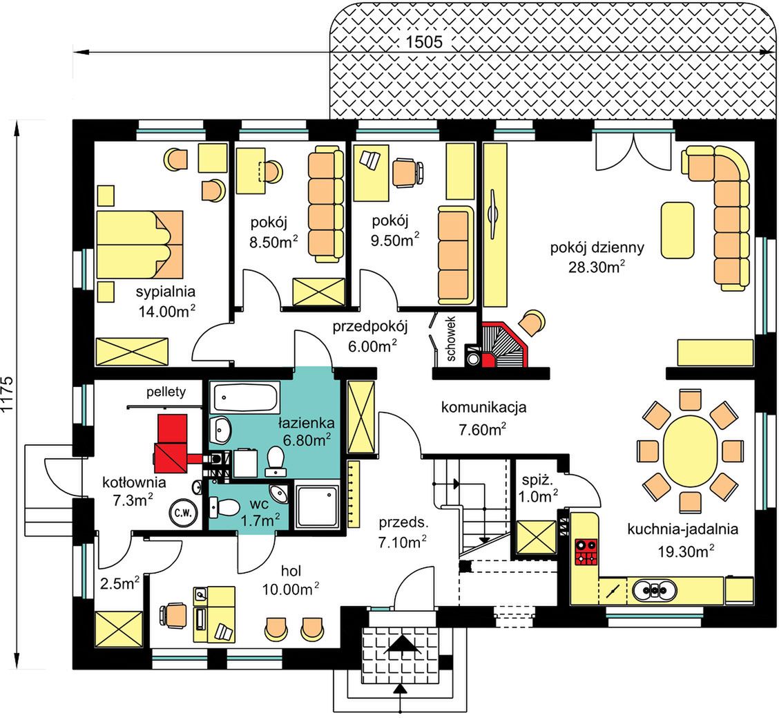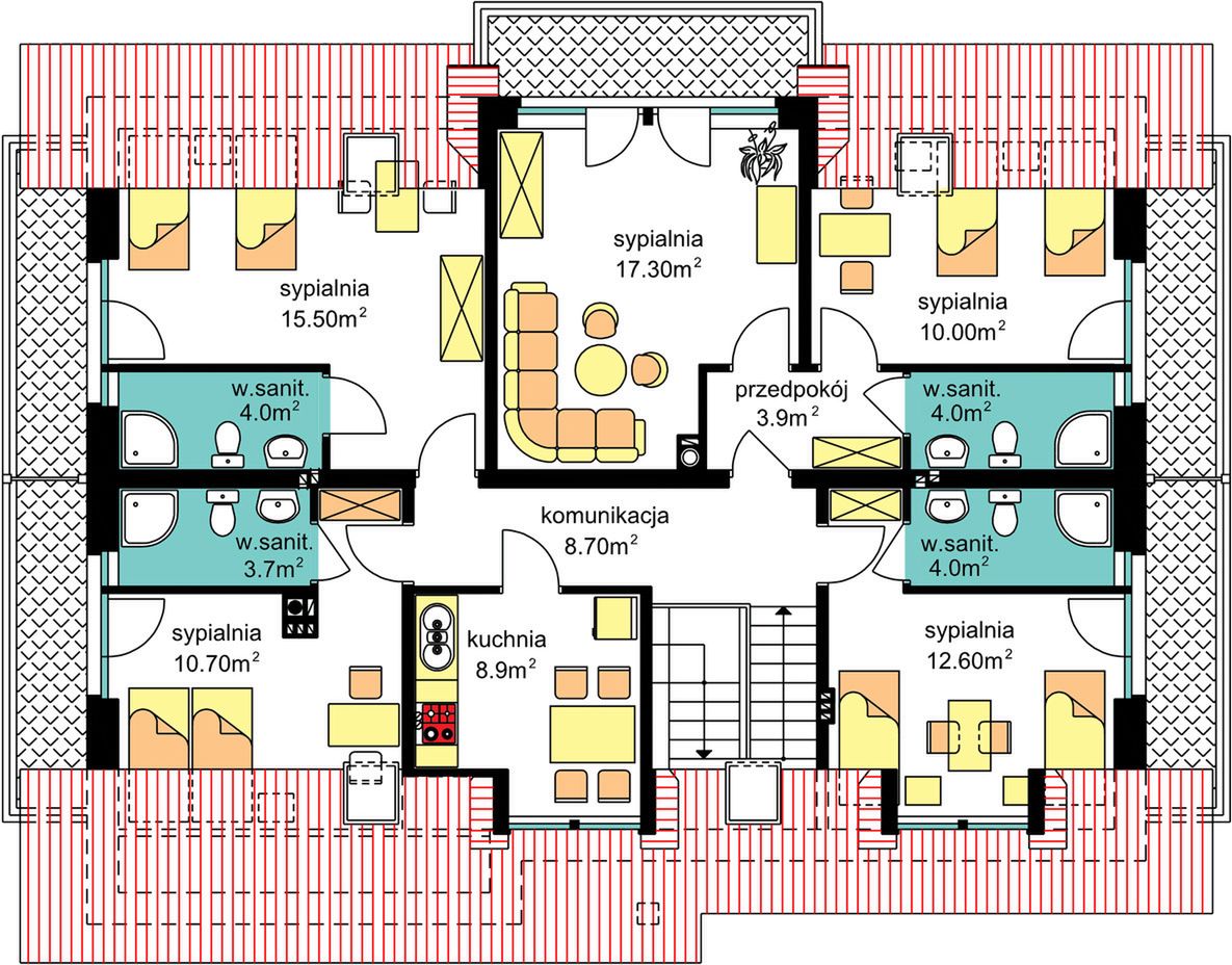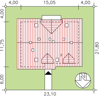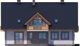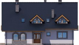 Graficzne opracowanie rzutów poglądowych widocznych na karcie projektu zostało wykonane przez Extradom.pl. Prezentowane przez Extradom.pl wizualizacje wykonane zostały przez autora projektu i należy poczytywać je jedynie za przykład i propozycję wykończenia, wizję architektoniczną autora projektu. Ostateczne wykończenie budynku może nastąpić na wiele sposobów. Szczegółowe rozwiązania zastosowane w oferowanej dokumentacji - w tym również ilość, lokalizacje i wygląd okien, drzwi, kominów - mogą w niewielkim stopniu różnić się od prezentowanej wizualizacji budynku.