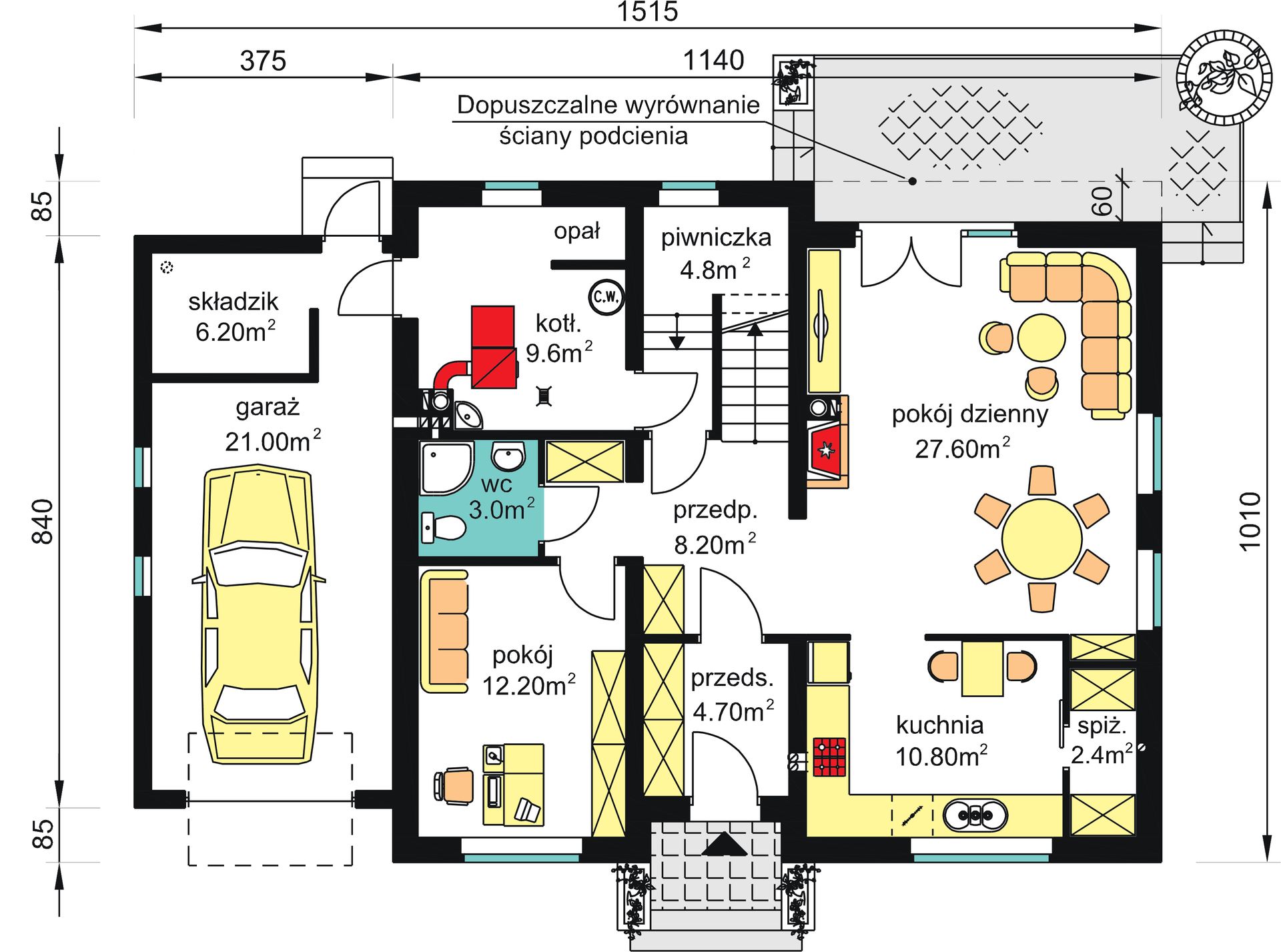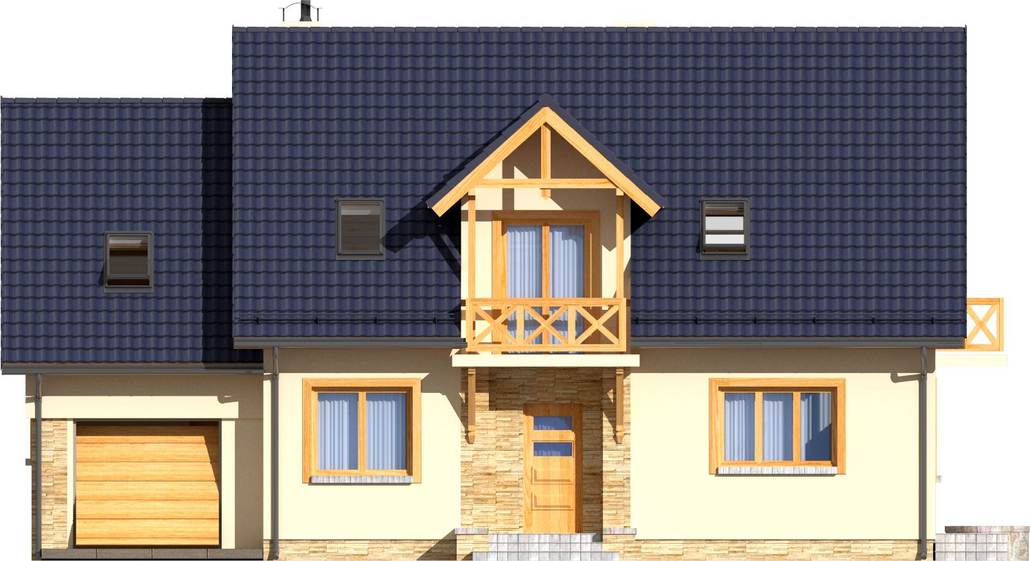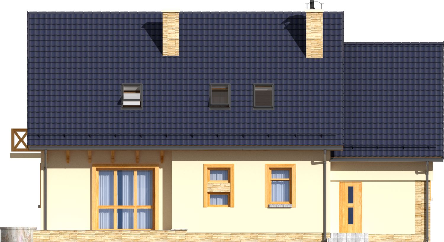 Graficzne opracowanie rzutów poglądowych widocznych na karcie projektu zostało wykonane przez Extradom.pl. Prezentowane przez Extradom.pl wizualizacje wykonane zostały przez autora projektu i należy poczytywać je jedynie za przykład i propozycję wykończenia, wizję architektoniczną autora projektu. Ostateczne wykończenie budynku może nastąpić na wiele sposobów. Szczegółowe rozwiązania zastosowane w oferowanej dokumentacji - w tym również ilość, lokalizacje i wygląd okien, drzwi, kominów - mogą w niewielkim stopniu różnić się od prezentowanej wizualizacji budynku.
