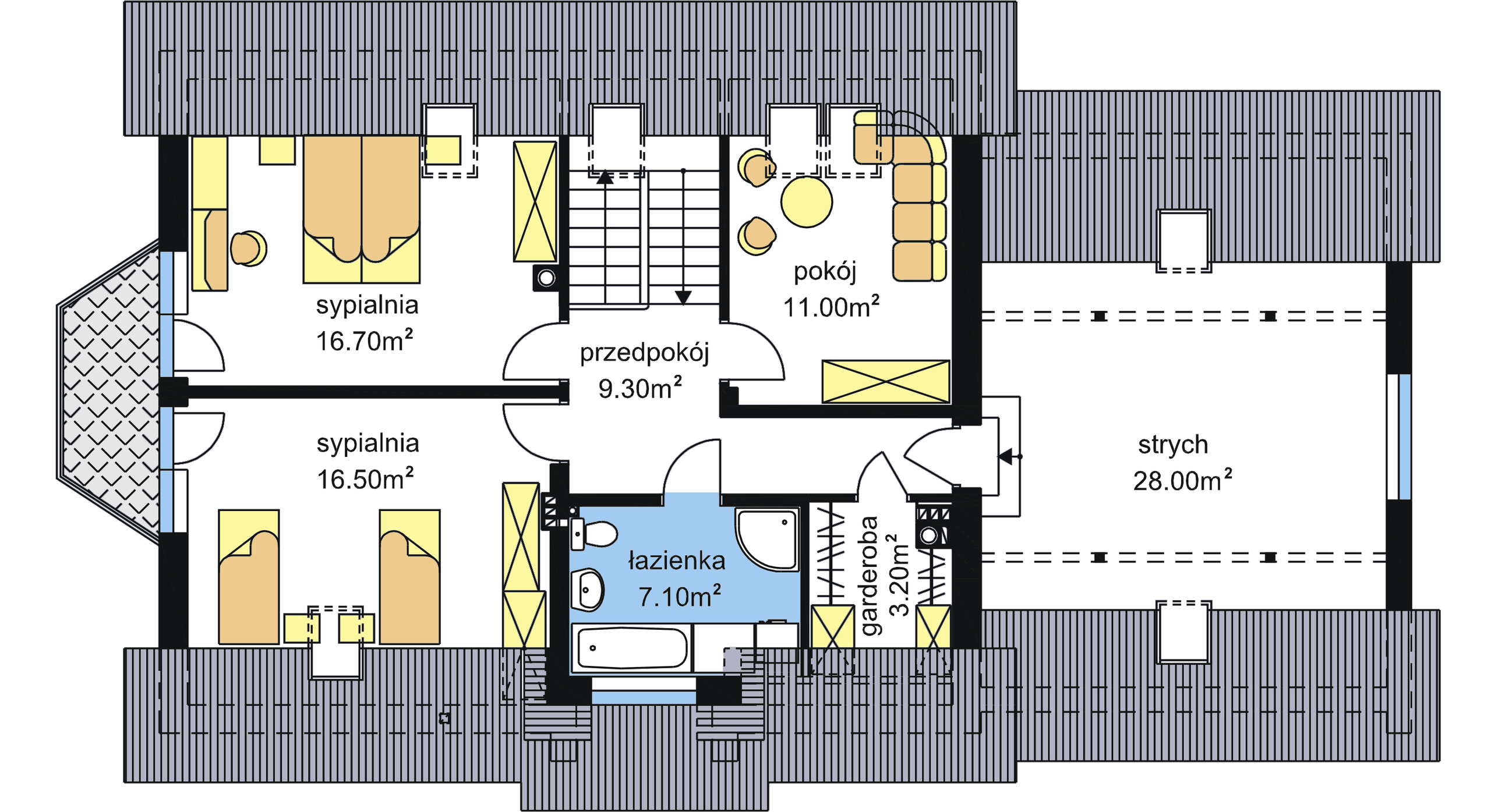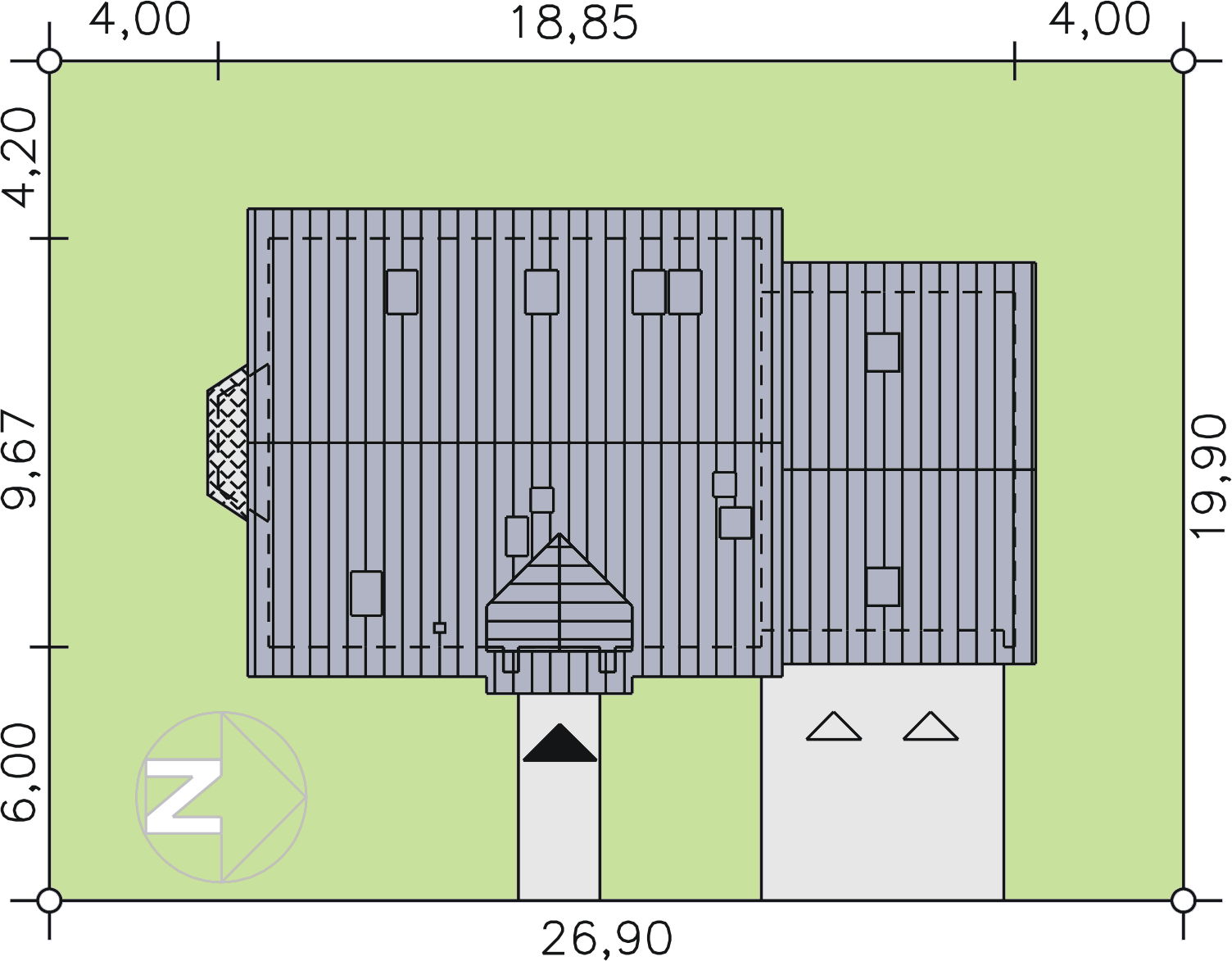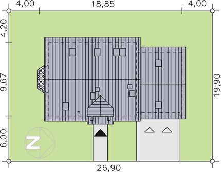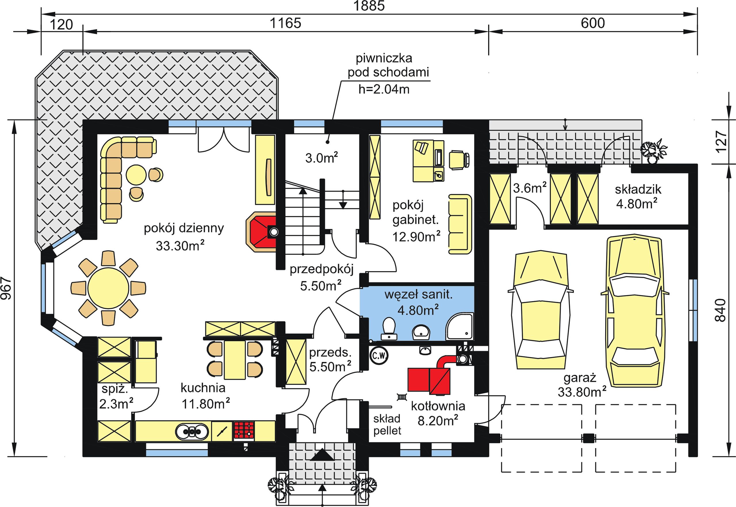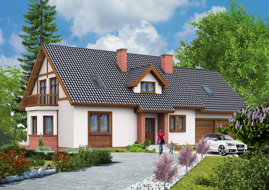 Graficzne opracowanie rzutów poglądowych widocznych na karcie projektu zostało wykonane przez Extradom.pl. Prezentowane przez Extradom.pl wizualizacje wykonane zostały przez autora projektu i należy poczytywać je jedynie za przykład i propozycję wykończenia, wizję architektoniczną autora projektu. Ostateczne wykończenie budynku może nastąpić na wiele sposobów. Szczegółowe rozwiązania zastosowane w oferowanej dokumentacji - w tym również ilość, lokalizacje i wygląd okien, drzwi, kominów - mogą w niewielkim stopniu różnić się od prezentowanej wizualizacji budynku.