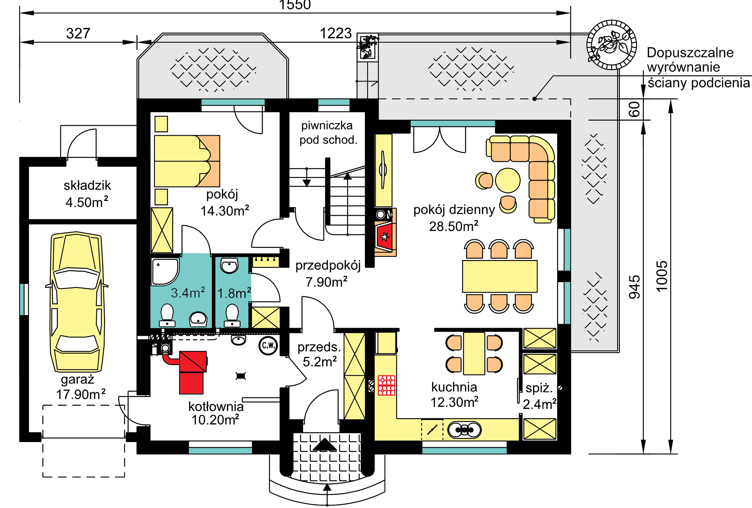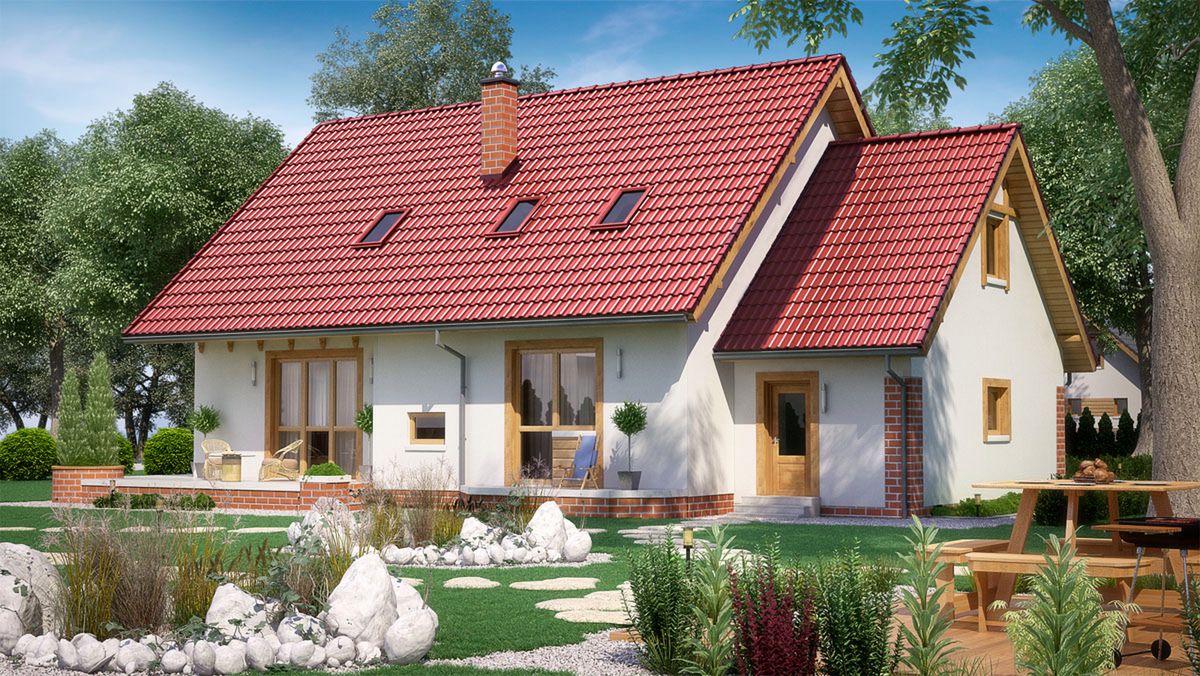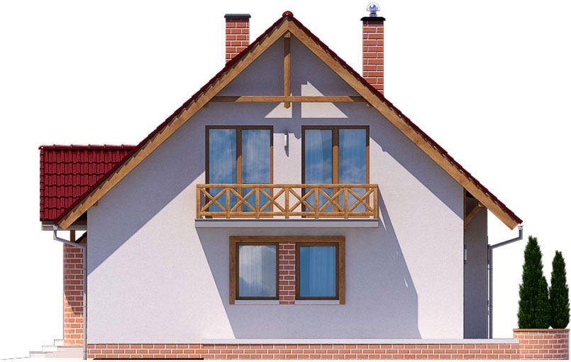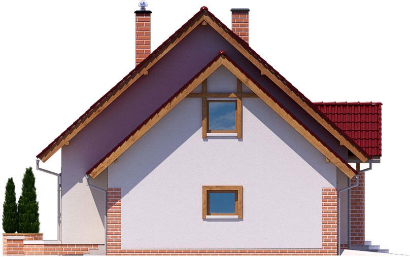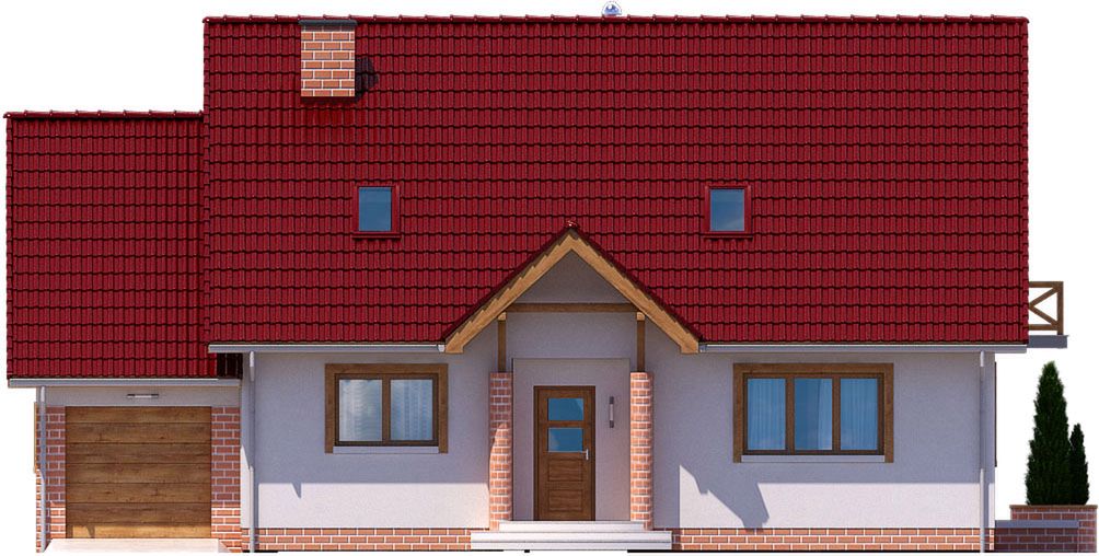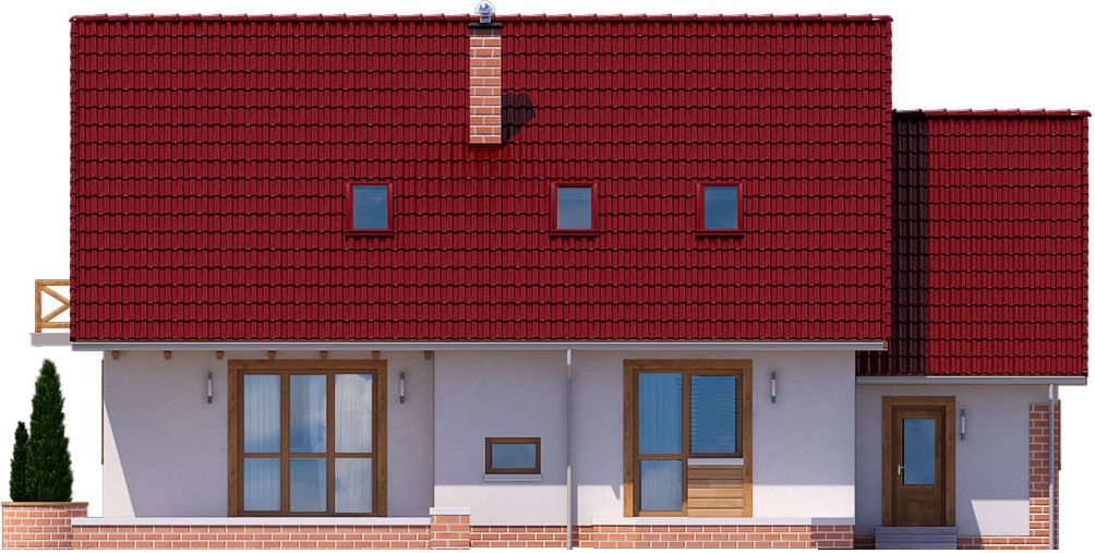 Graficzne opracowanie rzutów poglądowych widocznych na karcie projektu zostało wykonane przez Extradom.pl. Prezentowane przez Extradom.pl wizualizacje wykonane zostały przez autora projektu i należy poczytywać je jedynie za przykład i propozycję wykończenia, wizję architektoniczną autora projektu. Ostateczne wykończenie budynku może nastąpić na wiele sposobów. Szczegółowe rozwiązania zastosowane w oferowanej dokumentacji - w tym również ilość, lokalizacje i wygląd okien, drzwi, kominów - mogą w niewielkim stopniu różnić się od prezentowanej wizualizacji budynku.