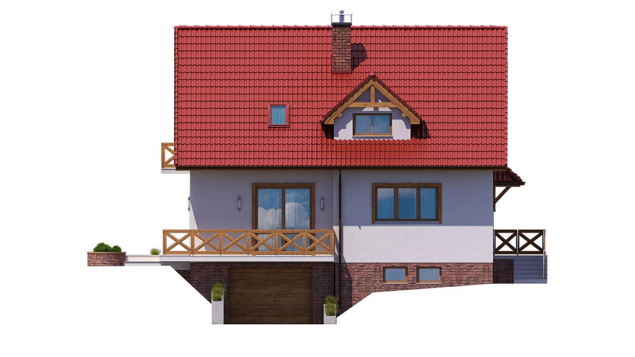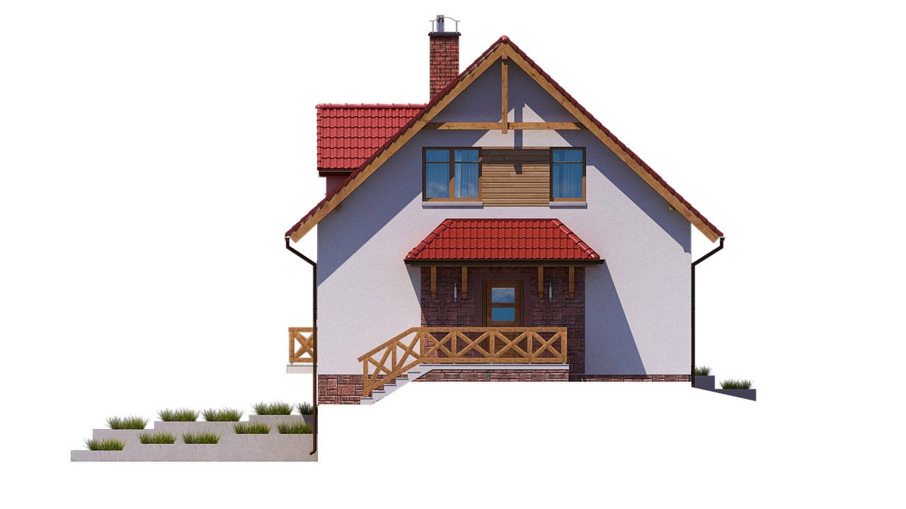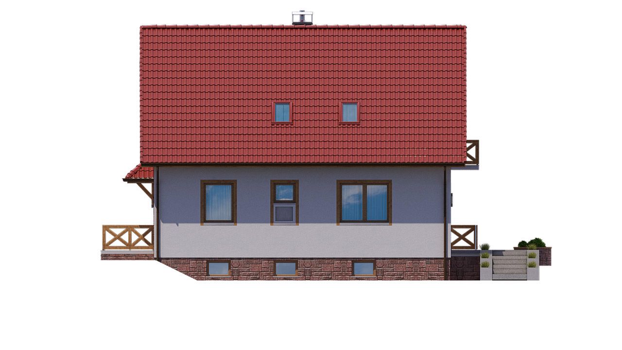 Graficzne opracowanie rzutów poglądowych widocznych na karcie projektu zostało wykonane przez Extradom.pl. Prezentowane przez Extradom.pl wizualizacje wykonane zostały przez autora projektu i należy poczytywać je jedynie za przykład i propozycję wykończenia, wizję architektoniczną autora projektu. Ostateczne wykończenie budynku może nastąpić na wiele sposobów. Szczegółowe rozwiązania zastosowane w oferowanej dokumentacji - w tym również ilość, lokalizacje i wygląd okien, drzwi, kominów - mogą w niewielkim stopniu różnić się od prezentowanej wizualizacji budynku.
