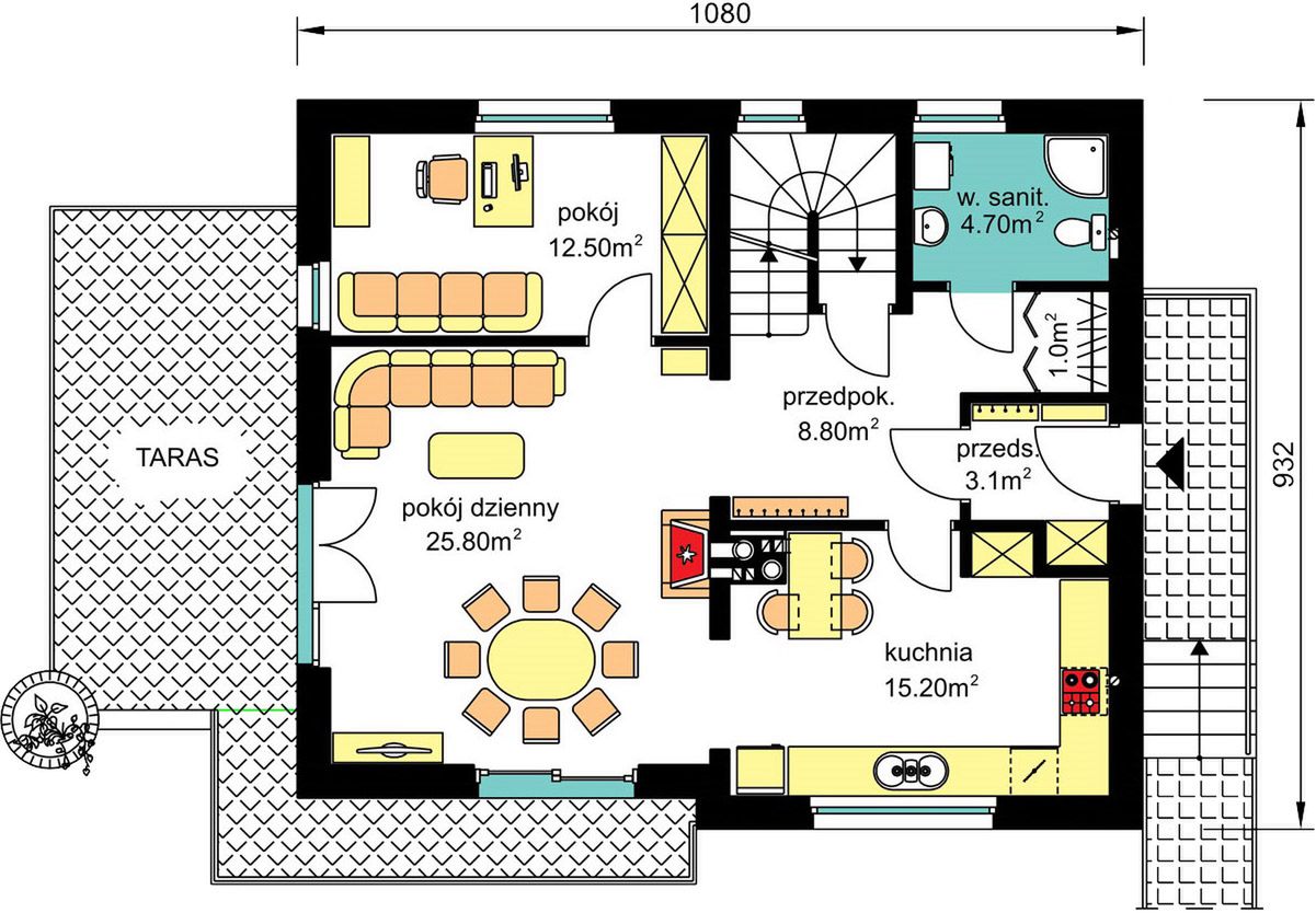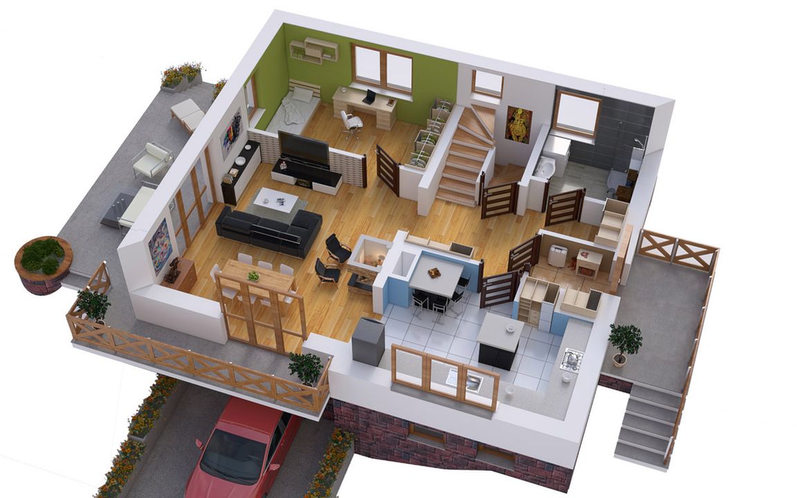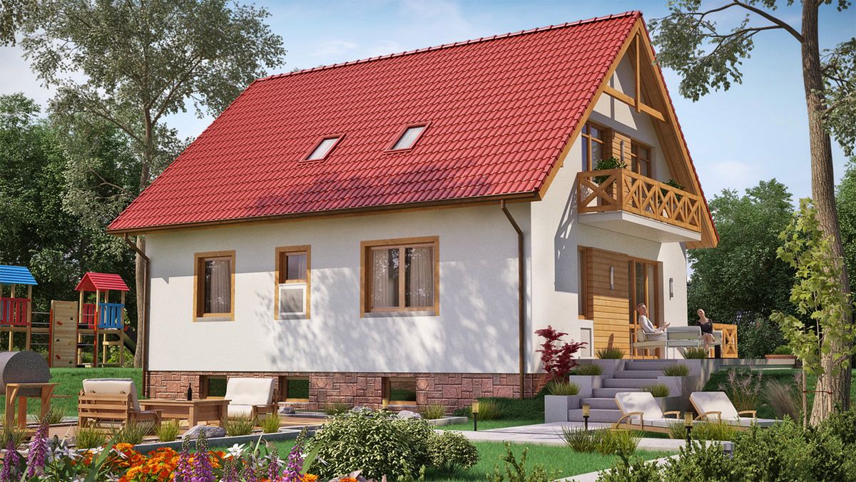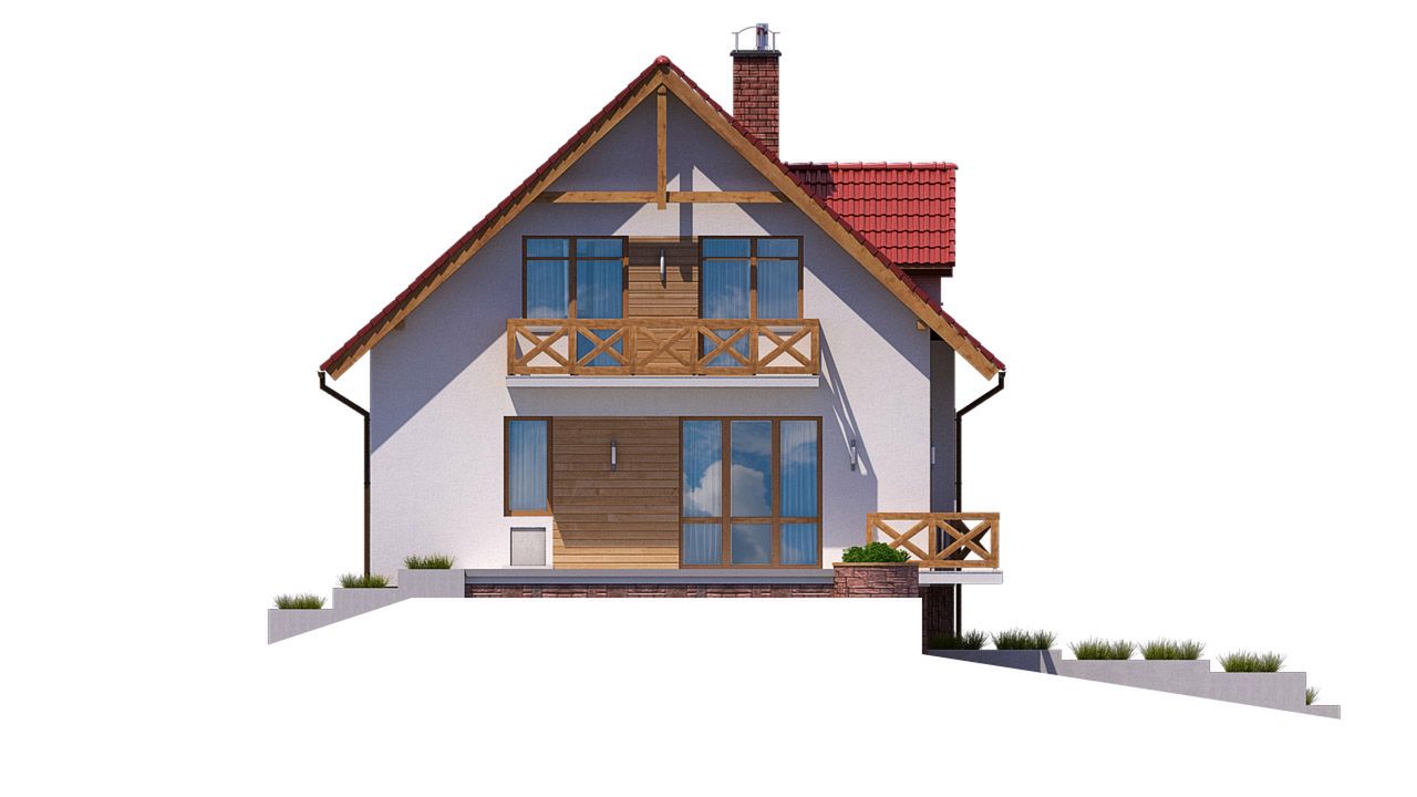 Graficzne opracowanie rzutów poglądowych widocznych na karcie projektu zostało wykonane przez Extradom.pl. Prezentowane przez Extradom.pl wizualizacje wykonane zostały przez autora projektu i należy poczytywać je jedynie za przykład i propozycję wykończenia, wizję architektoniczną autora projektu. Ostateczne wykończenie budynku może nastąpić na wiele sposobów. Szczegółowe rozwiązania zastosowane w oferowanej dokumentacji - w tym również ilość, lokalizacje i wygląd okien, drzwi, kominów - mogą w niewielkim stopniu różnić się od prezentowanej wizualizacji budynku.
