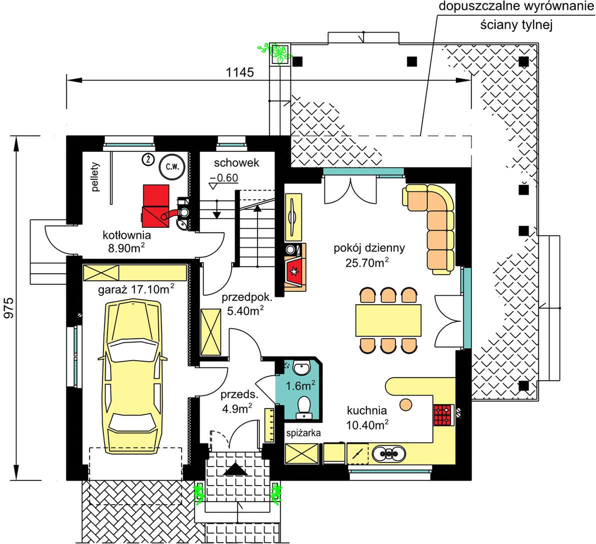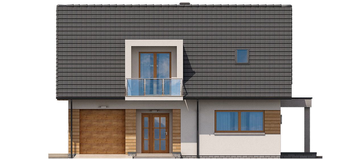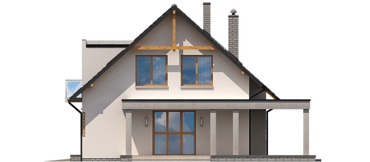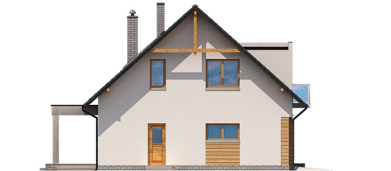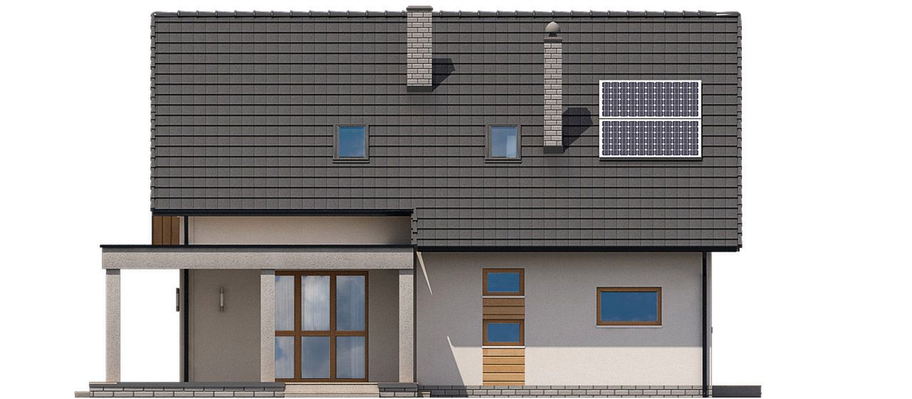Graficzne opracowanie rzutów poglądowych widocznych na karcie projektu zostało wykonane przez Extradom.pl. Prezentowane przez Extradom.pl wizualizacje wykonane zostały przez autora projektu i należy poczytywać je jedynie za przykład i propozycję wykończenia, wizję architektoniczną autora projektu. Ostateczne wykończenie budynku może nastąpić na wiele sposobów. Szczegółowe rozwiązania zastosowane w oferowanej dokumentacji - w tym również ilość, lokalizacje i wygląd okien, drzwi, kominów - mogą w niewielkim stopniu różnić się od prezentowanej wizualizacji budynku.