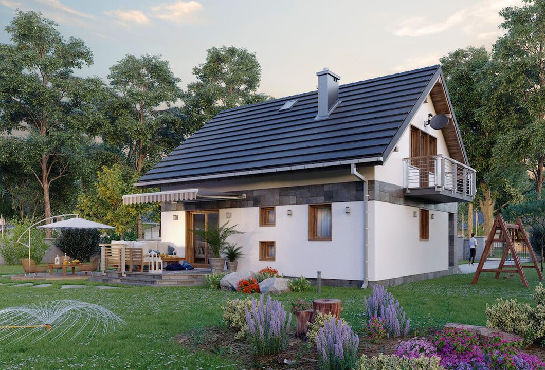 Graficzne opracowanie rzutów poglądowych widocznych na karcie projektu zostało wykonane przez Extradom.pl. Prezentowane przez Extradom.pl wizualizacje wykonane zostały przez autora projektu i należy poczytywać je jedynie za przykład i propozycję wykończenia, wizję architektoniczną autora projektu. Ostateczne wykończenie budynku może nastąpić na wiele sposobów. Szczegółowe rozwiązania zastosowane w oferowanej dokumentacji - w tym również ilość, lokalizacje i wygląd okien, drzwi, kominów - mogą w niewielkim stopniu różnić się od prezentowanej wizualizacji budynku.