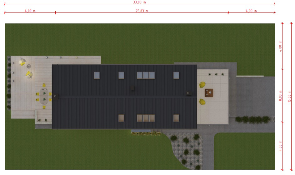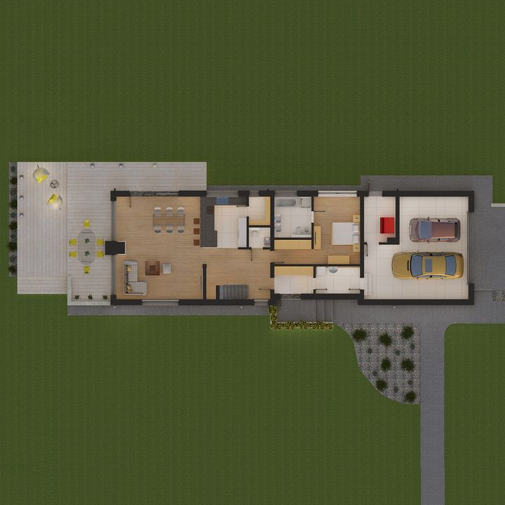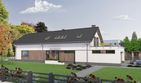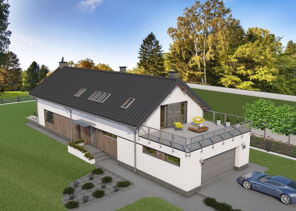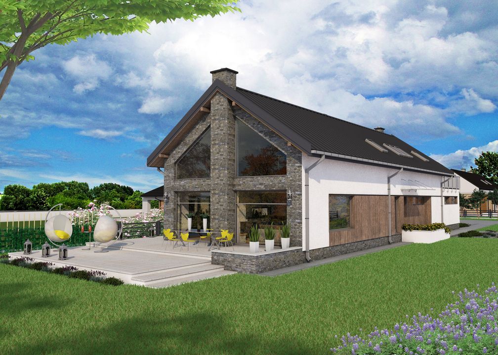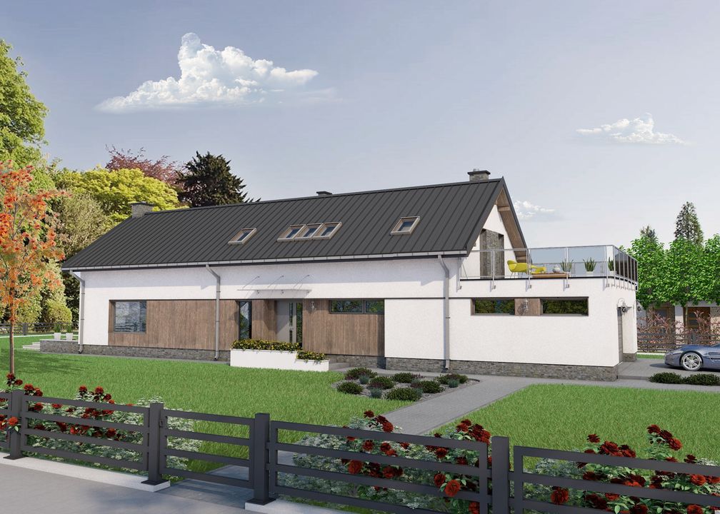 Graficzne opracowanie rzutów poglądowych widocznych na karcie projektu zostało wykonane przez Extradom.pl. Prezentowane przez Extradom.pl wizualizacje wykonane zostały przez autora projektu i należy poczytywać je jedynie za przykład i propozycję wykończenia, wizję architektoniczną autora projektu. Ostateczne wykończenie budynku może nastąpić na wiele sposobów. Szczegółowe rozwiązania zastosowane w oferowanej dokumentacji - w tym również ilość, lokalizacje i wygląd okien, drzwi, kominów - mogą w niewielkim stopniu różnić się od prezentowanej wizualizacji budynku.