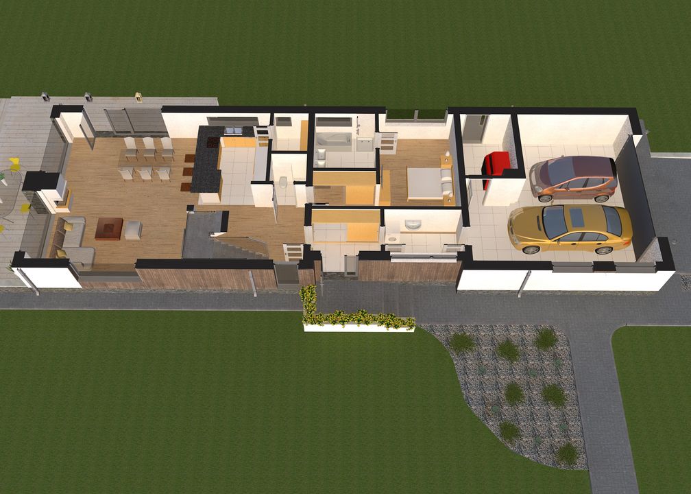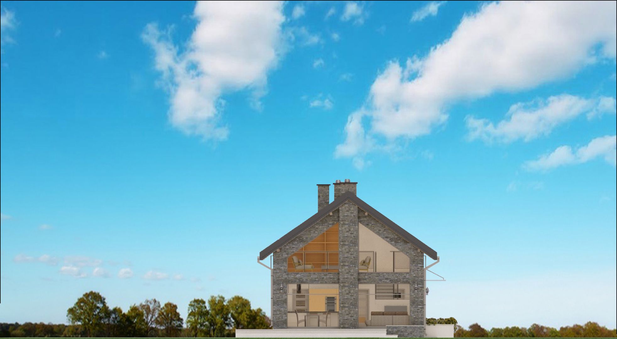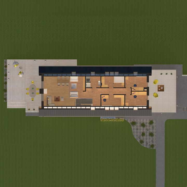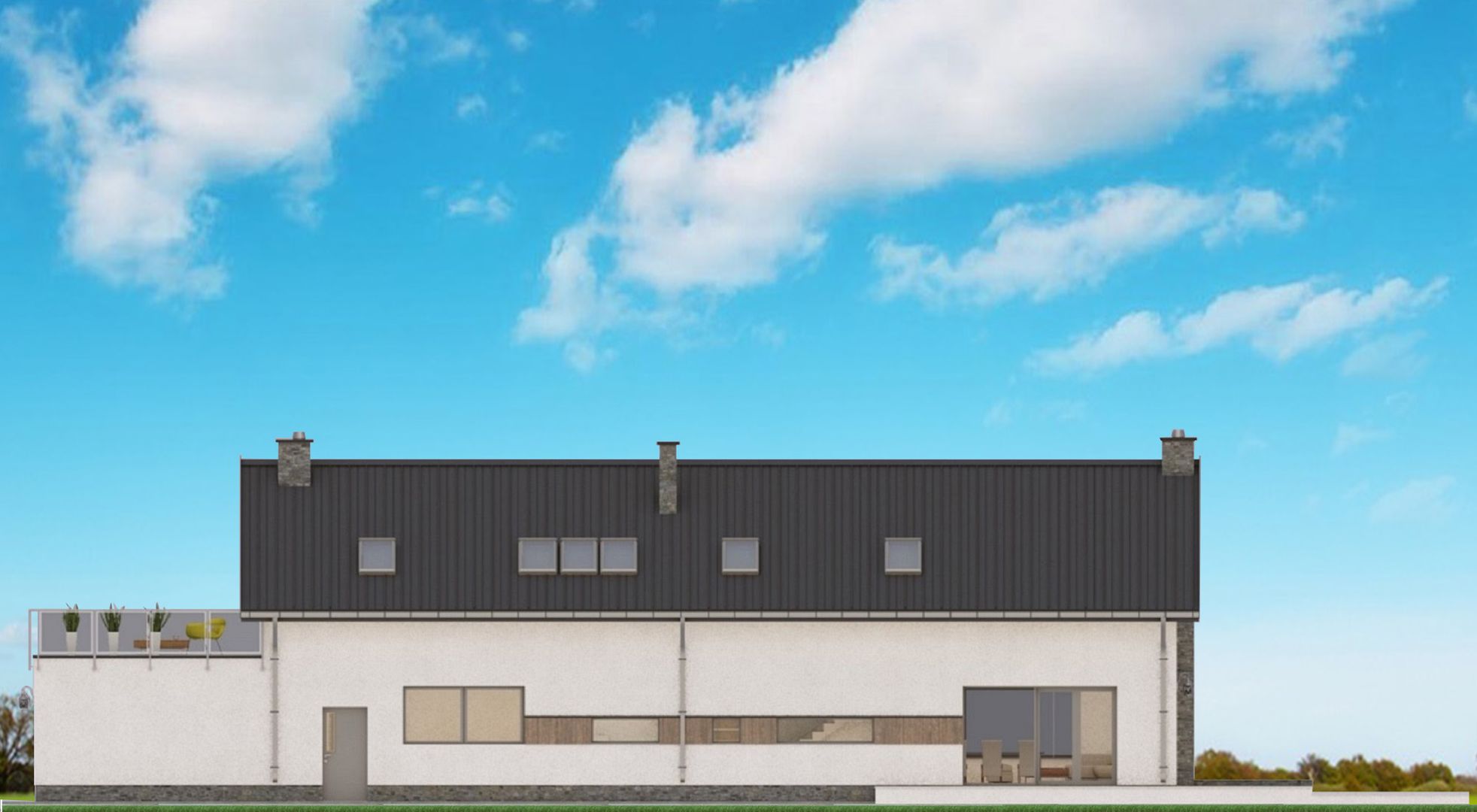 Graficzne opracowanie rzutów poglądowych widocznych na karcie projektu zostało wykonane przez Extradom.pl. Prezentowane przez Extradom.pl wizualizacje wykonane zostały przez autora projektu i należy poczytywać je jedynie za przykład i propozycję wykończenia, wizję architektoniczną autora projektu. Ostateczne wykończenie budynku może nastąpić na wiele sposobów. Szczegółowe rozwiązania zastosowane w oferowanej dokumentacji - w tym również ilość, lokalizacje i wygląd okien, drzwi, kominów - mogą w niewielkim stopniu różnić się od prezentowanej wizualizacji budynku.