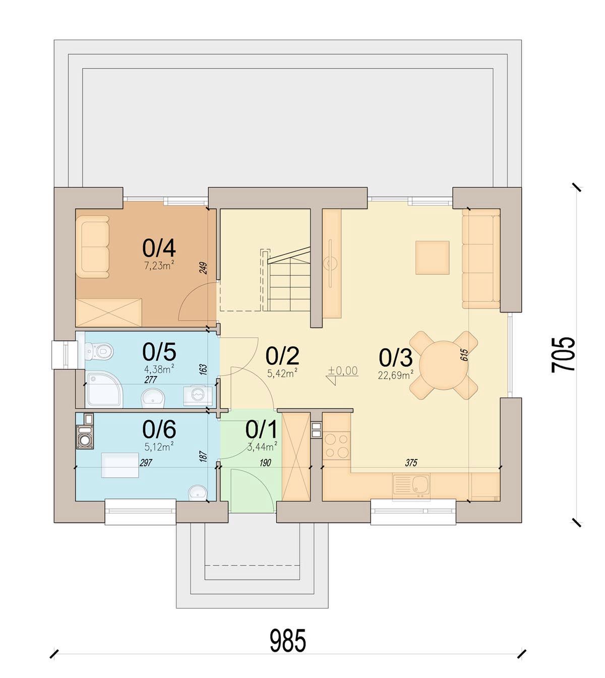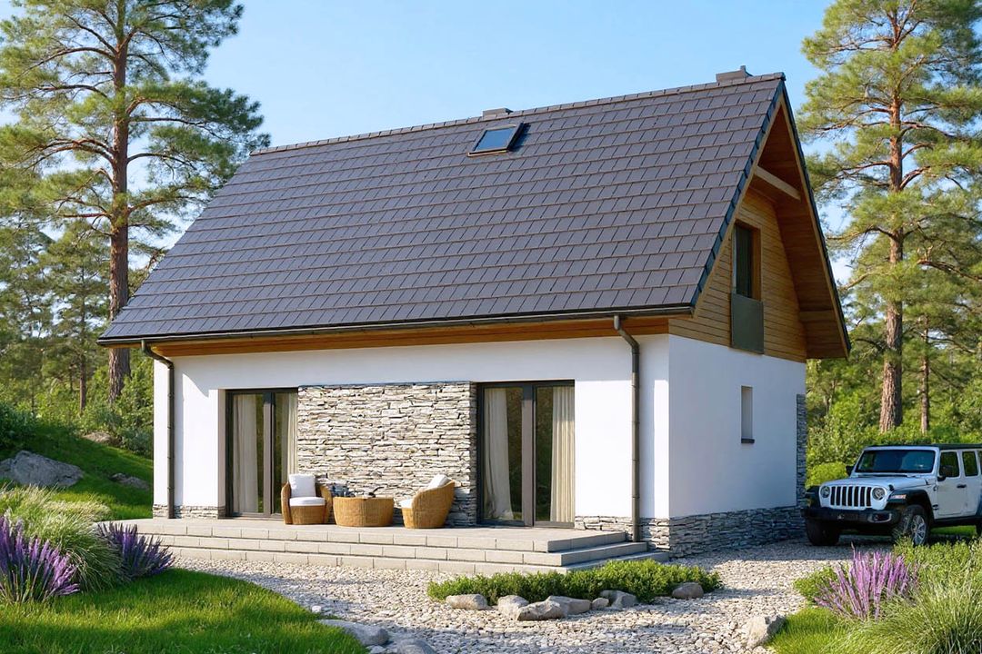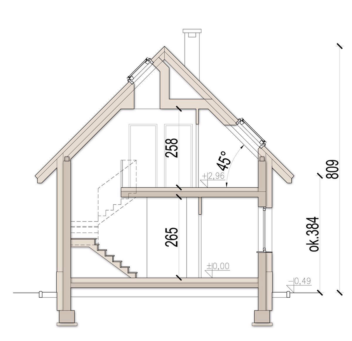 Graficzne opracowanie rzutów poglądowych widocznych na karcie projektu zostało wykonane przez Extradom.pl. Prezentowane przez Extradom.pl wizualizacje wykonane zostały przez autora projektu i należy poczytywać je jedynie za przykład i propozycję wykończenia, wizję architektoniczną autora projektu. Ostateczne wykończenie budynku może nastąpić na wiele sposobów. Szczegółowe rozwiązania zastosowane w oferowanej dokumentacji - w tym również ilość, lokalizacje i wygląd okien, drzwi, kominów - mogą w niewielkim stopniu różnić się od prezentowanej wizualizacji budynku.