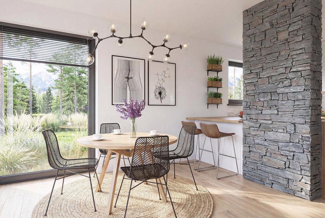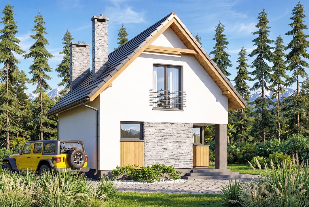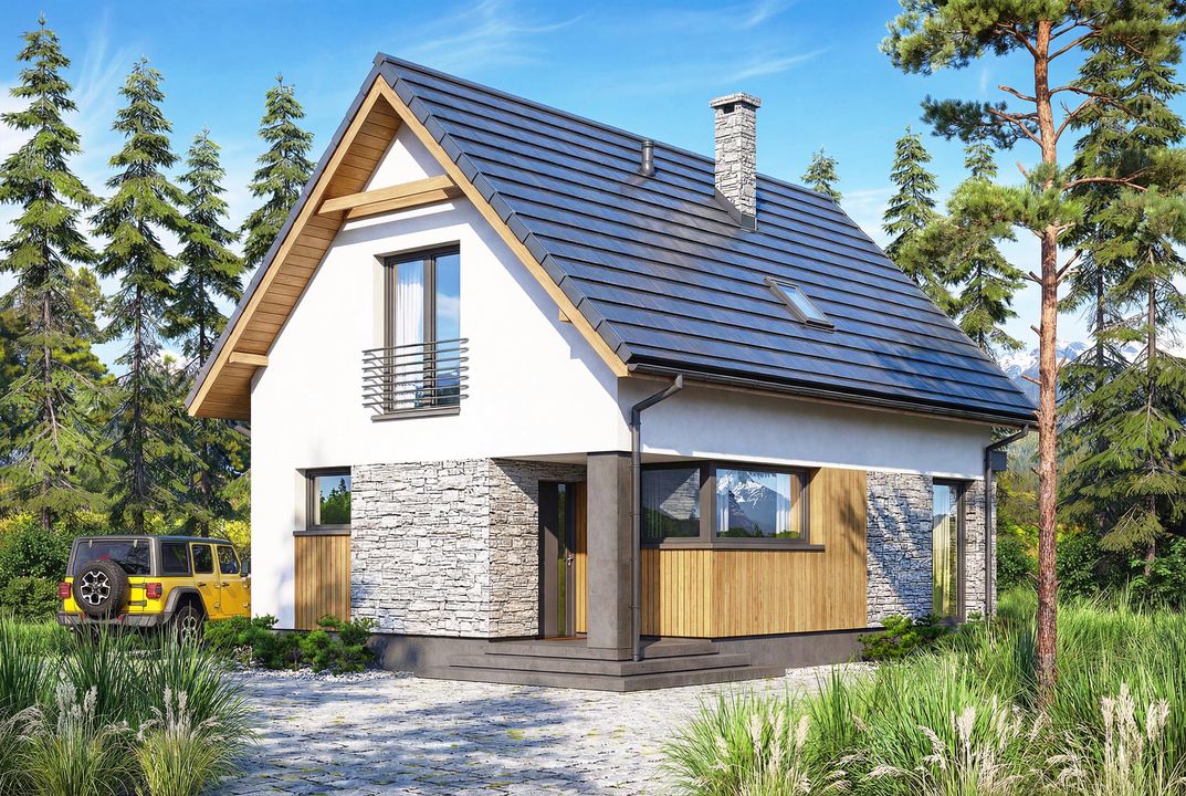 Graficzne opracowanie rzutów poglądowych widocznych na karcie projektu zostało wykonane przez Extradom.pl. Prezentowane przez Extradom.pl wizualizacje wykonane zostały przez autora projektu i należy poczytywać je jedynie za przykład i propozycję wykończenia, wizję architektoniczną autora projektu. Ostateczne wykończenie budynku może nastąpić na wiele sposobów. Szczegółowe rozwiązania zastosowane w oferowanej dokumentacji - w tym również ilość, lokalizacje i wygląd okien, drzwi, kominów - mogą w niewielkim stopniu różnić się od prezentowanej wizualizacji budynku.
