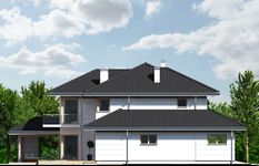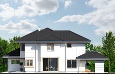 Graficzne opracowanie rzutów poglądowych widocznych na karcie projektu zostało wykonane przez Extradom.pl. Prezentowane przez Extradom.pl wizualizacje wykonane zostały przez autora projektu i należy poczytywać je jedynie za przykład i propozycję wykończenia, wizję architektoniczną autora projektu. Ostateczne wykończenie budynku może nastąpić na wiele sposobów. Szczegółowe rozwiązania zastosowane w oferowanej dokumentacji - w tym również ilość, lokalizacje i wygląd okien, drzwi, kominów - mogą w niewielkim stopniu różnić się od prezentowanej wizualizacji budynku.
