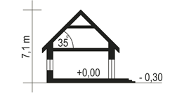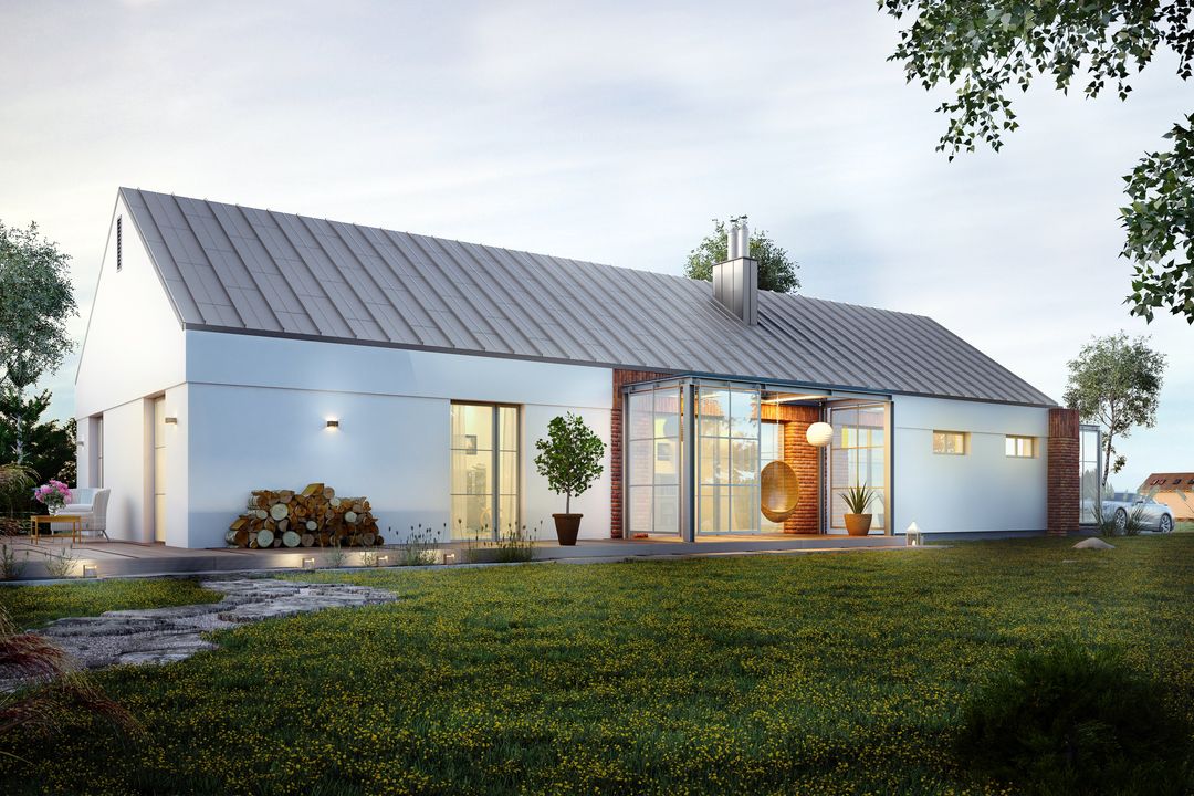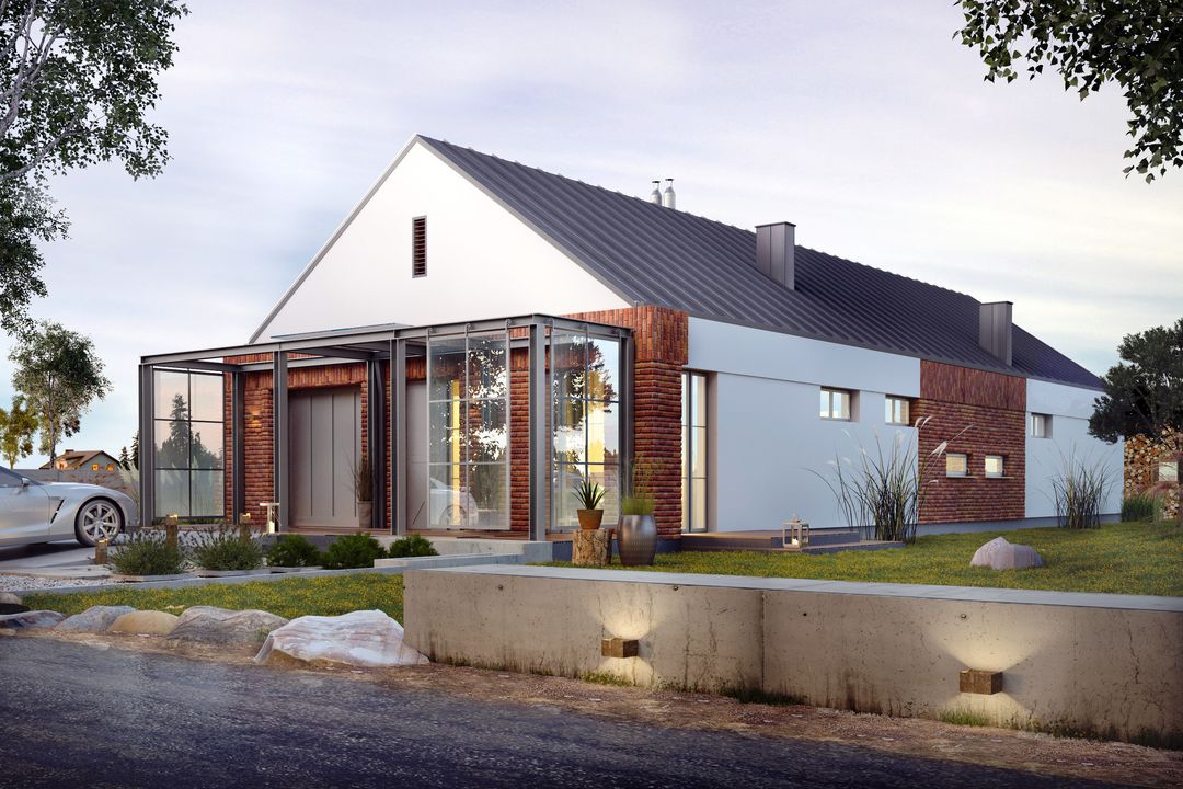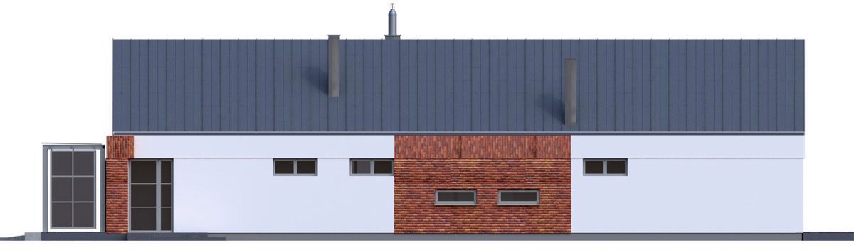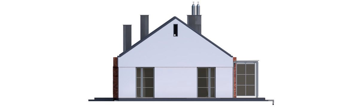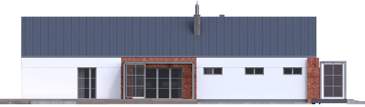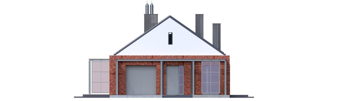 Projekt charakteryzuje się prostą, zwartą bryłą przykrytą dwuspadowym dachem, co jest rozwiązaniem sprawdzonym, estetycznym i ekonomicznym w realizacji. Nowoczesny charakter budynku podkreślają czyste linie i spójna kompozycja. Garaż został harmonijnie wkomponowany w główną strukturę domu. Integralną częścią projektu jest taras, który stanowi naturalne przedłużenie strefy dziennej i otwiera dom na przestrzeń ogrodu.